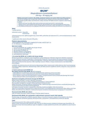 Ulotka dla pacjenta IBUM® (Ibuprofenum+Levomentholum) (50 mg + 30 mg)/g, żel Należy przeczytać uważnie całą ulotkę, ponieważ zawiera ona ważne informacje dla pacjenta. Lek ten jest dostępny bez recepty, aby można było leczyć niektóre schorzenia bez pomocy lekarza. Aby jednak uzyskać dobry wynik leczenia, należy stosować lek IBUM ostrożnie i zgodnie z informacją w ulotce. - Należy zachować tę ulotkę, aby można ją było przeczytać ponownie w razie potrzeby. - Należy zwrócić się do lekarza lub farmaceuty, gdy potrzebna jest rada lub dodatkowa informacja. - Jeśli objawy nasilą się lub nie ustąpią po kilku dniach stosowania, należy skontaktować się z lekarzem. Skład 1 g żelu zawiera: substancje czynne: ibuprofen lewomentol 50 mg 30 mg substancje pomocnicze: glikol propylenowy, etanol 96%, polisorbat 20, Karbomer EZ-2, aminometylopropanol, woda oczyszczona. 1 opakowanie leku zawiera 50 g lub 100 g żelu. Podmiot odpowiedzialny „PRZEDSIĘBIORSTWO PRODUKCJI FARMACEUTYCZNEJ HASCO-LEK” S.A. 51-131 Wrocław, ul. Żmigrodzka 242 E Spis treści ulotki: 1. Co to jest lek IBUM, żel i w jakim celu się go stosuje 2. Zanim zastosuje się lek IBUM, żel 3. Jak stosować lek IBUM, żel 4. Możliwe działania niepożądane 5. Przechowywanie leku IBUM, żel 6. Inne konieczne informacje 1.Co to jest lek IBUM, żel i w jakim celu się go stosuje Żel Ibum jest lekiem o działaniu przeciwzapalnym i przeciwbólowym. Wywiera skojarzone działanie zawartych w nim substancji czynnych: ibuprofenu i lewomentolu. Ibuprofen (niesteroidowy lek przeciwzapalny), którego działanie polega na hamowaniu syntezy prostaglandyn, wykazuje właściwości przeciwbólowe i przeciwzapalne. Jednocześnie lewomentol zawarty w leku wywołuje uczucie chłodu w miejscu zastosowania oraz działa lekko znieczulająco. Lek IBUM, żel przeznaczony jest do leczenia objawowego bólów mięśniowych, bólów pleców, bólu towarzyszącego chorobom układu mięśniowo-szkieletowego, takim jak lekkie postacie zapalenia stawów, skręcenia, urazy sportowe i nerwobóle. 2. Zanim zastosuje się lek IBUM, żel Nie należy stosować leku IBUM, żel jeśli występuje: - nadwrażliwość na substancje czynne lub na którąkolwiek substancję pomocniczą leku, - nadwrażliwość na kwas acetylosalicylowy lub inne niesteroidowe leki przeciwzapalne, - skurcz oskrzeli, nieżyt nosa lub pokrzywka w związku z przyjmowaniem kwasu acetylosalicylowego lub innych niesteroidowych leków przeciwzapalnych w wywiadzie. Zachować szczególną ostrożność stosując lek IBUM, żel Należy unikać kontaktu z oczami i błonami śluzowymi. Leku nie należy stosować na skórę uszkodzoną lub będącą w stanie zapalnym. W przypadku wystąpienia wysypki należy zaprzestać stosowania leku. Należy zachować ostrożność podczas podawania leku i jednoczesnego stosowania kwasu acetylosalicylowego lub innych niesteroidowych leków przeciwzapalnych. Lek należy stosować ostrożnie u pacjentów z chorobą wrzodową żołądka i (lub) dwunastnicy. Jeżeli nie ma potrzeby smarowania rąk w celach leczniczych, to po każdorazowym zastosowaniu leku należy umyć ręce. Należy skonsultować się z lekarzem, nawet jeśli powyższe ostrzeżenia dotyczą sytuacji występujących w przeszłości. Stosowanie leku IBUM, żel u dzieci Leku nie należy stosować u dzieci poniżej 12 lat bez zaleceń lekarza. Stosowanie leku IBUM, żel u pacjentów z zaburzeniami czynności nerek i (lub) wątroby Pomimo tego, że ibuprofen wchłania się przez skórę w znacznie mniejszym stopniu niż po podaniu doustnym, należy zachować ostrożność podczas stosowania leku u pacjentów z niewydolnością nerek lub wątroby. Ciąża Przed zastosowaniem leku należy poradzić się lekarza. Należy unikać stosowania leku podczas ciąży. Chociaż nie obserwowano działania teratogennego ibuprofenu, nie powinien on być stosowany podczas ciąży, ze względu na ryzyko opóźnienia porodu oraz wydłużenia czasu trwania porodu. Karmienie piersią Przed zastosowaniem leku należy poradzić się lekarza. Należy unikać stosowania leku podczas karmienia piersią ze względu na możliwość przenikania ibuprofenu do mleka kobiet karmiących piersią. Prowadzenie pojazdów i obsługa maszyn Brak badań dotyczących wpływu leku na zdolność prowadzenia pojazdów mechanicznych i obsługiwania urządzeń mechanicznych w ruchu. Stosowanie innych leków Należy poinformować lekarza o wszystkich przyjmowanych ostatnio lekach, nawet tych, które wydawane są bez recepty. Niesteroidowe leki przeciwzapalne mogą wchodzić w interakcje z lekami obniżającymi ciśnienie tętnicze krwi, chociaż możliwość takich interakcji z lekami stosowanymi miejscowo jest bardzo mała. Podczas jednoczesnego stosowania leku z kwasem acetylosalicylowym lub innymi niesteroidowymi lekami przeciwzapalnymi istnieje zwiększone ryzyko wystąpienia działań niepożądanych charakterystycznych dla tej grupy leków. 3. Jak stosować lek IBUM, żel Lek stosuje się miejscowo na skórę. Dorośli, osoby w podeszłym wieku i dzieci powyżej 12 lat: nakładać 5 do 12 cm żelu (ilość odpowiadająca około 50 do 125 mg ibuprofenu) do 3 razy na dobę na bolące miejsce. Żel należy delikatnie wsmarowywać aż do całkowitego wchłonięcia. Po zastosowaniu leku należy dokładnie umyć ręce. Dzieci w wieku poniżej 12 lat: Nie ma właściwego wskazania do stosowania leku IBUM w postaci żelu u dzieci w tej grupie wiekowej. Niewskazane jest stosowanie leku bez zalecenia lekarza. Nie należy stosować żelu częściej niż co 4 godziny w ciągu doby i nie dłużej niż przez 2 tygodnie, o ile lekarz nie zaleci inaczej. Jeżeli nie ma potrzeby smarowania rąk w celach leczniczych, to po każdorazowym wsmarowaniu leku należy umyć ręce. W przypadku wrażenia, że działanie leku IBUM, żel jest za mocne lub za słabe, należy zwrócić się do lekarza lub farmaceuty. W przypadku zastosowania 