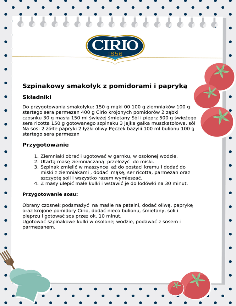 Szpinakowy smakołyk z pomidorami i papryką Składniki Do przygotowania smakołyku: 150 g mąki 00 100 g ziemniaków 100 g startego sera parmezan 400 g Cirio krojonych pomidorów 2 ząbki czosnku 30 g masła 150 ml świeżej śmietany Sól i pieprz 500 g świeżego sera ricotta 150 g gotowanego szpinaku 3 jajka gałka muszkatołowa, sól Na sos: 2 żółte papryki 2 łyżki oliwy Pęczek bazylii 100 ml bulionu 100 g startego sera parmezan Przygotowanie 1. Ziemniaki obrać i ugotować w garnku, w osolonej wodzie. 2. Utartą masę ziemniaczaną przełożyć do miski. 3. Szpinak zmielić w maszynce aż do postaci kremu i dodać do miski z ziemniakami , dodać mąkę, ser ricotta, parmezan oraz szczyptę soli i wszystko razem wymieszać. 4. Z masy ulepić małe kulki i wstawić je do lodówki na 30 minut. Przygotowanie sosu: Obrany czosnek podsmażyć na maśle na patelni, dodać oliwę, paprykę oraz krojone pomidory Cirio, dodać nieco bulionu, śmietany, soli i pieprzu i gotować sos przez ok. 10 minut. Ugotować szpinakowe kulki w osolonej wodzie, podawać z sosem i parmezanem. Powered by TCPDF (www.tcpdf.org)