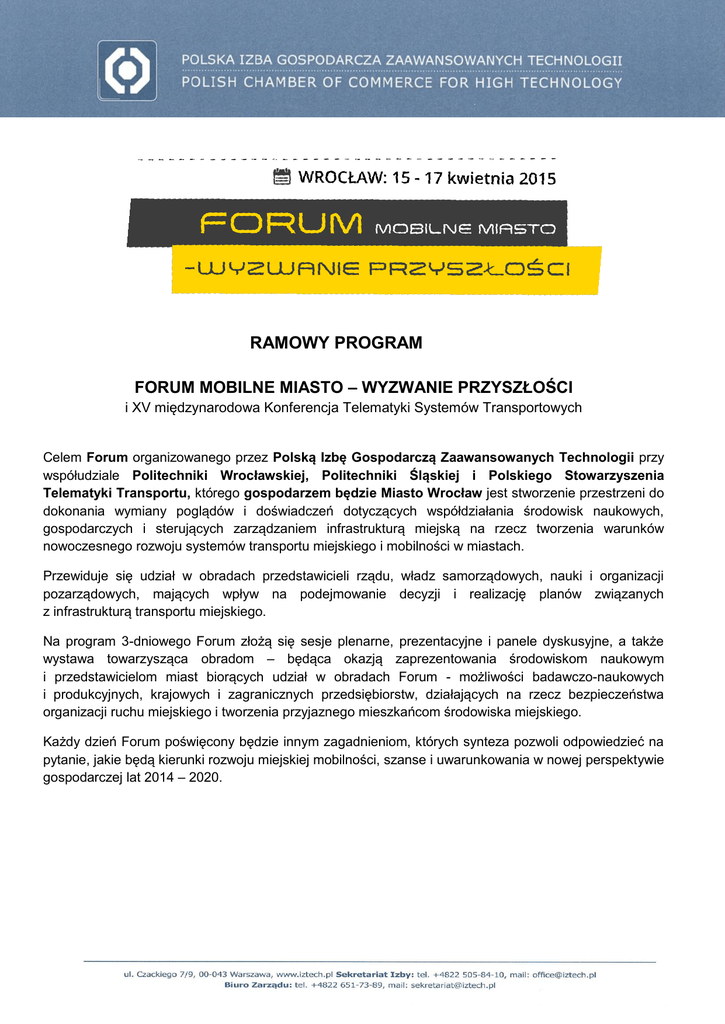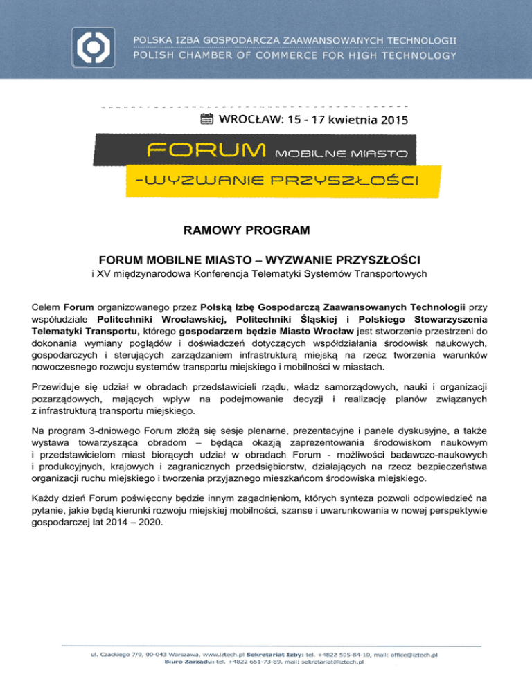 RAMOWY PROGRAM FORUM MOBILNE MIASTO – WYZWANIE PRZYSZŁOŚCI i XV międzynarodowa Konferencja Telematyki Systemów Transportowych Celem Forum organizowanego przez Polską Izbę Gospodarczą Zaawansowanych Technologii przy współudziale Politechniki Wrocławskiej, Politechniki Śląskiej i Polskiego Stowarzyszenia Telematyki Transportu, którego gospodarzem będzie Miasto Wrocław jest stworzenie przestrzeni do dokonania wymiany poglądów i doświadczeń dotyczących współdziałania środowisk naukowych, gospodarczych i sterujących zarządzaniem infrastrukturą miejską na rzecz tworzenia warunków nowoczesnego rozwoju systemów transportu miejskiego i mobilności w miastach. Przewiduje się udział w obradach przedstawicieli rządu, władz samorządowych, nauki i organizacji pozarządowych, mających wpływ na podejmowanie decyzji i realizację planów związanych z infrastrukturą transportu miejskiego. Na program 3-dniowego Forum złożą się sesje plenarne, prezentacyjne i panele dyskusyjne, a także wystawa towarzysząca obradom – będąca okazją zaprezentowania środowiskom naukowym i przedstawicielom miast biorących udział w obradach Forum - możliwości badawczo-naukowych i produkcyjnych, krajowych i zagranicznych przedsiębiorstw, działających na rzecz bezpieczeństwa organizacji ruchu miejskiego i tworzenia przyjaznego mieszkańcom środowiska miejskiego. Każdy dzień Forum poświęcony będzie innym zagadnieniom, których synteza pozwoli odpowiedzieć na pytanie, jakie będą kierunki rozwoju miejskiej mobilności, szanse i uwarunkowania w nowej perspektywie gospodarczej lat 2014 – 2020. Centrum Kongresowe Politechniki Wrocławskiej Dzień I – 15.04.2015 r. (środa) 10:30 – 12:00 - Sesja otwierająca Forum Wprowadzenie w problematykę Forum, głos zabiorą zaproszeni przedstawiciele rządu i władz samorządowych – czas trwania – 20 min. Trzy dwudziestominutowe referaty na temat: znaczenia kształtowania modelu zrównoważonego rozwoju transportu miejskiego dla poprawy warunków życia mieszkańców i dążenia do stworzenia inteligentnego systemu miejskiego (prelegent z Polski lub z zagranicy); konkretnych działań rządu i jego polityki mającej na celu wspieranie samorządów, placówek badawczych i instytucji pozarządowych w tworzeniu zintegrowanych systemów transportu miejskiego; referat–studium – przedstawiający, na konkretnych przykładach, problemy związane z procesem wprowadzania zintegrowanego systemu transportu miejskiego i metody ich rozwiązywania. 12:00 - 14:00 - Sesja poświęcona problematyce systemów transportu miejskiego w Polsce referaty przedstawicieli wybranych miast polskich referat naukowca zajmującego się problematyką transportu projektanta systemów miejskich Dyskusja panelowa (prowadzona przez moderatora na temat tez przedstawionych referatach Lunch – 14:00 – 14:30 14:30 – 16:00 - Sesja prezentacyjna producentów Przewiduje się udział najważniejszych producentów polskich i zagranicznych, prezentujących w czasie wystąpień ofertę urządzeń i systemów przeznaczonych dla miast wprowadzających systemy ITS i bezpieczeństwa komunikacyjnego. 16:00 – Transfer do hotelu. 17:30 – Transfer do Afrykarium (40-minutowe zwiedzanie). 19:00 - Uroczysta kolacja (Restauracja Letnia). Centrum Kongresowe Politechniki Wrocławskiej Dzień II – 16.04.2015 r. (czwartek) XV Międzynarodowa Konferencja Telematyki Systemów Transportowych 10:30-12:00 - I Sesja: Panel naukowy: „Inteligentne Systemy Transportowe” Sesja będzie zawierała wystąpienia dotyczące współzależności między rozwojem technologii informacyjno-komunikacyjnych i transportem. Omawiane będą możliwości zarządzania mobilnością w kontekście systemów ITS. 12:30-14:00 - I Sesja: Panel naukowy C. D. „Inteligentne Systemy Transportowe” Sesja będzie poświęcona zagadnieniom inteligentnych miast w aspekcie stosowania nowoczesnych technologii. Rozwój innowacyjnych technologii stwarza zupełnie nowe możliwości przekształcania poszczególnych miast i aglomeracji w inteligentne, bezpieczne i zrównoważone środowiska. 14:00-14:30 – Lunch 14:30-16:00 - II sesja: Panel naukowy: „Strategie wprowadzania rozwiązań telematyki transportu” Sesja będzie zawierała wystąpienia omawiające zagadnienia najnowszych tendencji usprawniania transportu w miastach, w tym systemy zarządzania miejskim transportem towarowym. Dodatkowo omawiane zostaną zasady polityki transportowej realizowanej przez miasta w zakresie publicznego transportu zbiorowego. 16:00 – Transfer do hotelu 18:30 – Kolacja koleżeńska (restauracja na starówce) Centrum Zarządzania Ruchem i Transportem Publicznym Miasta Wrocław Dzień III – 17.04.2015 r. (piątek) 9.00 – 13.30 - Dzień studyjny Zwiedzanie Centrum Zarządzania Ruchem i Transportem Publicznym Miasta Wrocław – grupy 30-osobowe w panelach 1,5-godzinnych. Warunkiem uczestnictwo w tej części Forum jest zadeklarowanie tego przy rejestracji. ORGANIZATOR Polska Izba Gospodarcza Zaawansowanych Technologii Prof. Ryszard Pregiel WSPÓŁORGANIZATORZY Politechnika Wrocławska Rektor - Prof. Tadeusz Więckowski Politechnika Śląska Rektor - Prof. Andrzej Karbownik Polskie Stowarzyszenie Telematyki Transportu Prof. Jerzy Mikulski KOMITET PROGRAMOWY PRZEWODNICZĄCY: Prof. Jerzy Mikulski Prezes Polskiego Stowarzyszenia Telematyki Transportu WICEPRZEWODNICZĄCY: • Prof. Janusz Dyduch - Przewodniczący Prezydium Komitetu Transportu PAN • Prof. Ryszard Pregiel - Prezes Polskiej Izby Gospodarczej Zaawansowanych Technologii • Wojciech Wajda - Wiceprzewodniczący Rady Polskiej Izby Gospodarczej Zaawansowanych Technologii • Grażyna Wojewódzka - Zastępca Dyrektora Zarządu Dróg i Utrzymania Miasta we Wrocławiu