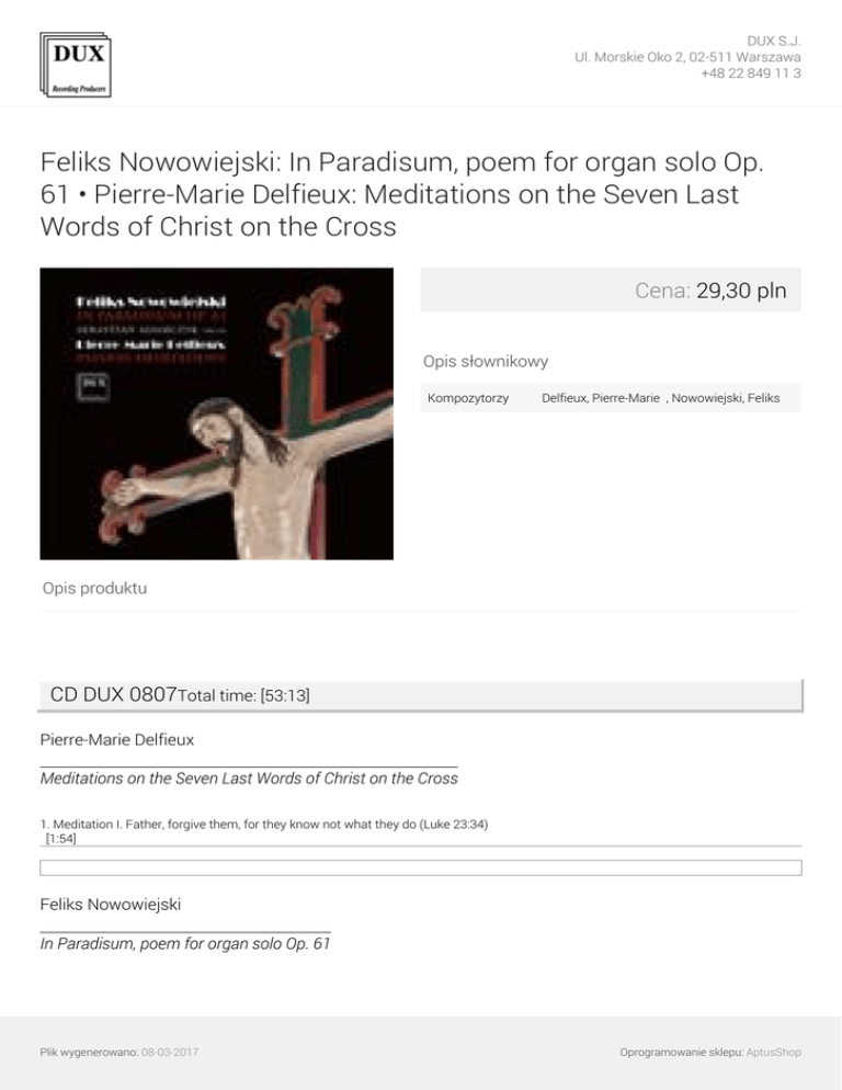 DUX S.J. Ul. Morskie Oko 2, 02-511 Warszawa +48 22 849 11 3 Feliks Nowowiejski: In Paradisum, poem for organ solo Op. 61 • Pierre-Marie Delfieux: Meditations on the Seven Last Words of Christ on the Cross Cena: 29,30 pln Opis słownikowy Kompozytorzy Delfieux, Pierre-Marie ∎, Nowowiejski, Feliks ∎ Opis produktu CD DUX 0807Total time: [53:13] Pierre-Marie Delfieux Meditations on the Seven Last Words of Christ on the Cross 1. Meditation I. Father, forgive them, for they know not what they do (Luke 23:34) [1:54] Feliks Nowowiejski In Paradisum, poem for organ solo Op. 61 Plik wygenerowano: 08-03-2017 Oprogramowanie sklepu: AptusShop DUX S.J. Ul. Morskie Oko 2, 02-511 Warszawa +48 22 849 11 3 2. I. Grave dramatico – Allegro agitato – Lento molto tranquillo [4:31] Pierre-Marie Delfieux Meditations on the Seven Last Words of Christ on the Cross 3. Meditation II. Truly, I say to you, today you will be with me in paradise (Luke 23:43) [1:46] Feliks Nowowiejski In Paradisum, poem for organ solo Op. 61 4. II. Grave pesante e triste [3:43] Pierre-Marie Delfieux Meditations on the Seven Last Words of Christ on the Cross 5. Meditation III. Woman, behold your son: behold your mother (John 19:26-27) [1:40] Feliks Nowowiejski In Paradisum, poem for organ solo Op. 61 6. III. Andantino cantabile [5:01] Pierre-Marie Delfieux Meditations on the Seven Last Words of Christ on the Cross 7. Meditation IV. My God, my God, why have you forsaken me? (Matthew 27:47) [2:09] Plik wygenerowano: 08-03-2017 Oprogramowanie sklepu: AptusShop DUX S.J. Ul. Morskie Oko 2, 02-511 Warszawa +48 22 849 11 3 Feliks Nowowiejski In Paradisum, poem for organ solo Op. 61 8. IV. Moderato lamentoso [3:41] Pierre-Marie Delfieux Meditations on the Seven Last Words of Christ on the Cross 9. Meditation V. Jesus, knowing that all things were now accomplished, that the Scripture might be fulfilled, said, “I thirst.” (John 19:28) [2:13] Feliks Nowowiejski In Paradisum, poem for organ solo Op. 61 10. V. Andantino [3:46] Pierre-Marie Delfieux Meditations on the Seven Last Words of Christ on the Cross 11. Meditation VI. It is finished! (John 19:30) [2:05] Feliks Nowowiejski In Paradisum, poem for organ solo Op. 61 12. VI. Un poco con moto [2:45] Plik wygenerowano: 08-03-2017 Oprogramowanie sklepu: AptusShop DUX S.J. Ul. Morskie Oko 2, 02-511 Warszawa +48 22 849 11 3 Pierre-Marie Delfieux Meditations on the Seven Last Words of Christ on the Cross 13. Meditation VII. Father, into your hands I commit my spirit (Luke 23:46) [1:48] Feliks Nowowiejski In Paradisum, poem for organ solo Op. 61 14. VII. without tempo indication – Allegro furioso – Andantino misterioso [8:21] Pierre-Marie Delfieux Meditations on the Seven Last Words of Christ on the Cross 15. The Epilogue. The full moon on the 14th day of Nisan (…) [2:21] 16. Blessings (6th Russian modus according to Zaycev) [5:26] Wykonawcy: Plik wygenerowano: 08-03-2017 Powered by TCPDF (www.tcpdf.org) Oprogramowanie sklepu: AptusShop