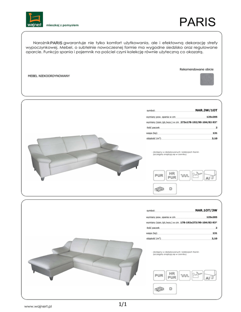 PARIS * NaroŜnik PARIS gwarantuje nie tylko komfort uŜytkowania, ale i efektowną dekorację strefy wypoczynkowej. Mebel, o subtelnie nowoczesnej formie ma wygodne siedzisko oraz regulowane oparcie. Funkcja spania i pojemnik na pościel czyni kolekcję równie uŜyteczną co okazałą. Rekomendowane obicie MEBEL NIEKOORDYNOWANY NAR.3W/1OT symbol: wymiary pow. spania w cm 125x205 wymiary (szer./gł./wys.) w cm 273x178-192/90-104/82-93* ilość paczek 2 waga (kg) 131 3 objętość (m ) 3,10 * - dostępny w dedykowanych kolekcjach tkanin (szczegóły znajdują się w cenniku) symbol: NAR.1OT/3W wymiary pow. spania w cm 125x205 wymiary (szer./gł./wys.) w cm 178-192x273/90-104/82-93* ilość paczek waga (kg) objętość (m3) 2 131 3,10 * - dostępny w dedykowanych kolekcjach tkanin (szczegóły znajdują się w cenniku) www.wajnert.pl 1/1