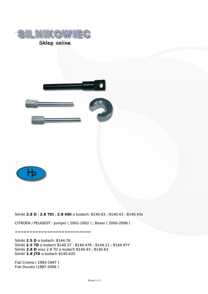 Silniki 2.8 D ; 2.8 TDi ; 2.8 HDi o kodach: 8140.63 ; 9140.43 ; 8140.43s CITROEN / PEUGEOT - Jumper ( 2001-2002 ) ; Boxer ( 2000-2006 ) ========================== Silniki Silniki Silniki Silniki 2.5 2.5 2.8 2.8 D o kodach: 8144.76 TD o kodach 8140.27 ; 8140.47R ; 8144.21 ; 8144.97Y D oraz 2.8 TD o kodach 8140.43 ; 8140.63 JTD o kodach 8140.43S Fiat Croma ( 1993-1997 ) Fiat Ducato (1987-2006 ) Strona 1 z 2 ========================== Silniki 2.5 D oraz 2.5 DT Kody silników: 8140.07 ; 8140.27S ; 8140.47R ; 8140.97 ; 8140.2 ; 8140.47 ; 8140.67F Silniki 2.8 D oraz 2.8 JTD Kody silników: 8140.23 ; 8140.43N ; 8140.63 ; 8140.43B ; 8140.43R ; 8140.23.27 ; 8140.43C 8140.43S ; 8140.43.37 IVECO Daily ( 1987-2006 ) IVECO Turbo Daily( 1987-2006 ) ========================== Silniki 2.5D - S8U 770 / 772 - z paskiem rozrzadu Silniki 2.8 D - S9W 700 / 702 - z paskiem rozrzadu OPEL Arena ( 1997-2001 ) OPEL Movano ( 1998-2003 ) ========================== Silniki Silniki Silniki Silniki 2.5 2.5 2.8 2.8 D - S8U 720 / 722 / 730 / 731 / 742 / 748 / 750 / 752 / 770 / 772 / 780 / 782 D Turbo - S9U 700 / 702 / 704 / 714 / 740 dTi - S9W 700 / 702 dCi - S9W 206/ 208 / 212 RENAULT Trafi c ( 1988-2000 ) RENAULT Master ( 1980-2008 ) RENAULT Mascot ( 1998-2007 ) ========================== Numery fabryczne części w zestawie. CITROEN, PEUGEOT OEM Tools: FIAT OEM Tools: 1860638000 1860638000 Strona 2 z 2