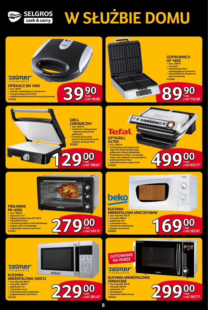 GOFROWNICA GF-1400 • moc: 1200 W • na 4 gofry • teflonowa powłoka zapobiegająca przywieraniu • termoizolowana obudowa ze stali nierdzewnej 16736688 OPIEKACZ SM 1400 • • • • moc: 780 W powłoka zapobiegająca przywieraniu nienagrzewający się uchwyt możliwość przechowywania w pozycji pionowej 37087400 39 89 90 1 szt. z VAT 49.08 90 1 szt. z VAT 110.58 GRILL CERAMICZNY • moc: 2000 W • możliwość rozłożenia płyt - większa powierzchnia grillowania • ruchoma górna płyta grzewcza dopasowuje się do rozmiaru danej potrawy OPTIGRILL GC702 • moc: 2000 W • 6 automatycznych programów 42503607 129 zapewnia idealną temperaturę grillowania różnych składników: hamburgerów, drobiu, czerwonego mięsa, ryb, kiełbasek, kanapek/panini • pomiar grubości mięsa • wskaźnik poziomu wypieczenia 00 1 szt. z VAT 158.67 43100023 PIEKARNIK PK-4200 • • • • • • • moc: 1800 W pojemność: 42 l regulacja temperatury: 65-230°C minutnik 60 minut 4 elementy grzejne ze stali nierdzewnej funkcja rożna i termoobiegu kratka grilla i tacka do pieczenia 97192991 279 499 00 1 szt. z VAT 613.77 KUCHNIA MIKROFALOWA MWC2010MW • • • • • • 00 1 szt. z VAT 343.17 moc mikrofal: 700 W moc grilla: 800 W pojemność: 20 l 5 poziomów mocy sterowanie mechaniczne funkcja rozmrażania 44758399 169 00 1 szt. z VAT 207.87 GOTOWANIE NA PARZE KUCHNIA MIKROFALOWA 29Z012 • • • • • • moc mikrofal: 800 W moc grilla: 1000 W pojemność: 23 l 5 poziomów mocy 8 automatycznych programów programowanie czasu startu 36691582 229 KUCHNIA MIKROFALOWA ZMW4130X 00 • • • • • 1 szt. z VAT 281.67 moc mikrofal: 900 W moc grilla: 850 W pojemność: 23 l 24 programy sterowanie elektroniczne 53900916 8 299 00 1 szt. z VAT 367.77