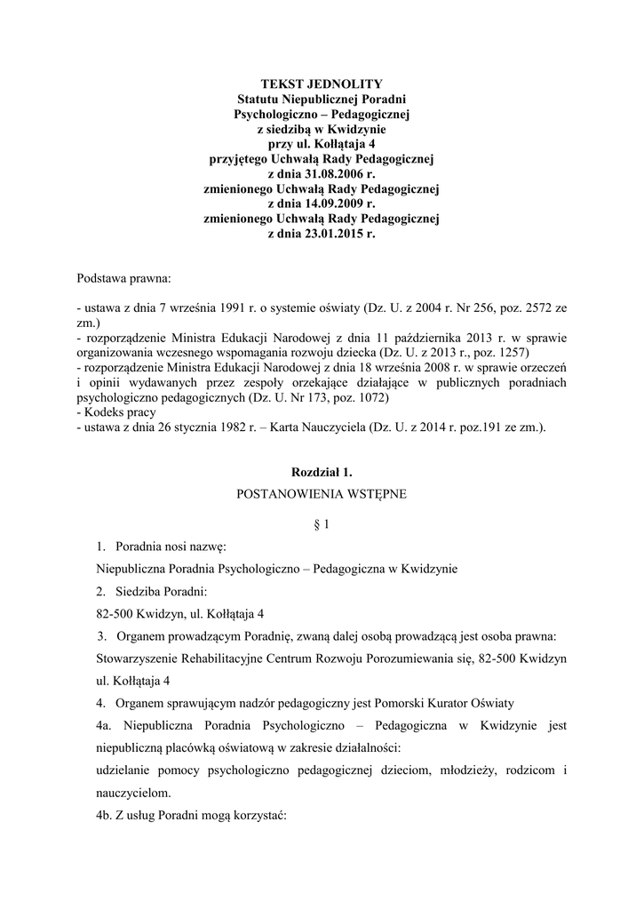 TEKST JEDNOLITY Statutu Niepublicznej Poradni Psychologiczno – Pedagogicznej z siedzibą w Kwidzynie przy ul. Kołłątaja 4 przyjętego Uchwałą Rady Pedagogicznej z dnia 31.08.2006 r. zmienionego Uchwałą Rady Pedagogicznej z dnia 14.09.2009 r. zmienionego Uchwałą Rady Pedagogicznej z dnia 23.01.2015 r. Podstawa prawna: - ustawa z dnia 7 września 1991 r. o systemie oświaty (Dz. U. z 2004 r. Nr 256, poz. 2572 ze zm.) - rozporządzenie Ministra Edukacji Narodowej z dnia 11 października 2013 r. w sprawie organizowania wczesnego wspomagania rozwoju dziecka (Dz. U. z 2013 r., poz. 1257) - rozporządzenie Ministra Edukacji Narodowej z dnia 18 września 2008 r. w sprawie orzeczeń i opinii wydawanych przez zespoły orzekające działające w publicznych poradniach psychologiczno pedagogicznych (Dz. U. Nr 173, poz. 1072) - Kodeks pracy - ustawa z dnia 26 stycznia 1982 r. – Karta Nauczyciela (Dz. U. z 2014 r. poz.191 ze zm.). Rozdział 1. POSTANOWIENIA WSTĘPNE §1 1. Poradnia nosi nazwę: Niepubliczna Poradnia Psychologiczno – Pedagogiczna w Kwidzynie 2. Siedziba Poradni: 82-500 Kwidzyn, ul. Kołłątaja 4 3. Organem prowadzącym Poradnię, zwaną dalej osobą prowadzącą jest osoba prawna: Stowarzyszenie Rehabilitacyjne Centrum Rozwoju Porozumiewania się, 82-500 Kwidzyn ul. Kołłątaja 4 4. Organem sprawującym nadzór pedagogiczny jest Pomorski Kurator Oświaty 4a. Niepubliczna Poradnia Psychologiczno – Pedagogiczna w Kwidzynie jest niepubliczną placówką oświatową w zakresie działalności: udzielanie pomocy psychologiczno pedagogicznej dzieciom, młodzieży, rodzicom i nauczycielom. 4b. Z usług Poradni mogą korzystać: 1) dzieci, młodzież, ich rodzice lub opiekunowie oraz dorośli 2) nauczyciele, wychowawcy, specjaliści z placówek oświatowych, 3) przedstawiciele instytucji organizacji pracujących z dziećmi i młodzieżą oraz na rzecz dzieci i młodzieży. 5. Poradnia używa pieczęci: Niepubliczna Poradnia Psychologiczno – Pedagogiczna w Kwidzynie ul. Kołłątaja 4, 82-500 Kwidzyn 6. Poradnia jest placówką uzyskującą dochody z prowadzonej działalności usługowej: konsultacje indywidualne i zbiorowe poradnictwo psychologiczne, pedagogiczne i logopedyczne dla rodziców i nauczycieli badanie i opiniowanie dzieci pomoc w rehabilitacji i terapii 7. Usługi Poradni mogą być finansowane poprzez wpłaty osób fizycznych i prawnych. 8. Budżet Poradni mogą zasilać dodatkowo inne dotacje, subwencje i darowizny. 9. Poradnia może świadczyć usługi nieodpłatnie różnym podmiotom po wcześniejszym podpisaniu porozumienia z ich organem prowadzącym. Rozdział 2. CELE I ZADANIA PORADNI §2 1. Poradnia udziela dzieciom i młodzieży pomocy psychologicznej, pedagogicznej, logopedycznej, prowadzi wczesne wspomaganie rozwoju dziecka. 2. Do zadań poradni należy w szczególności: wczesne wspomaganie rozwoju dziecka mające na celu stymulowanie psychofizycznego rozwoju dziecka od chwili wykrycia niepełnosprawności do podjęcia nauki w szkole, prowadzone bezpośrednio z dzieckiem oraz jego rodziną, pomoc rodzicom i nauczycielom w diagnozowaniu i rozwijaniu potencjalnych możliwości dzieci i młodzieży oraz ich mocnych stron, wspomaganie wychowawczej i edukacyjnej funkcji rodziny, prowadzenie rehabilitacji i terapii, w tym terapii AAC. 3. Poradnia realizuje swoje cele poprzez następujące zadania: 1) prowadzenie badań psychologiczno – pedagogicznych i logopedycznych oraz oceny procesów integracji sensorycznej, rozpoznawanie indywidualnych potrzeb dzieci i młodzieży (diagnozowanie potrzeb edukacyjnych, odchyleń i zaburzeń rozwojowych dzieci i młodzieży), 2) ustalanie przyczyny trudności w zgłaszanych przypadkach, 3) prowadzenie specjalistycznej pomocy psychologicznej, pedagogicznej i logopedycznej dla dzieci i młodzieży, 4) prowadzenie wczesnego wspomagania rozwoju dziecka w wieku od urodzenia do podjęcia nauki w szkole, 5) prowadzenie terapii w ramach wczesnego wspomagania rozwoju, 6) udzielanie pomocy dzieciom i młodzieży niepełnosprawnej lub z dysfunkcjami rozwojowymi oraz ich rodzicom (prawnym opiekunom), 7) pomoc uczniom w dokonywaniu wyboru kierunku kształcenia i zawodu oraz planowania kariery edukacyjnej i zawodowej, 8) wspomaganie wychowawczej i edukacyjnej funkcji rodziny, 9) propagowanie profesjonalnych metod wspierania i korygowania rozwoju dzieci i młodzieży, wspomaganie nauczycieli, rodziców i opiekunów w pracy dydaktycznej, wychowawczej i terapeutycznej, 10)upowszechnianie wiedzy psychologicznej, pedagogicznej, logopedycznej i terapeutycznej, 11)współpracowanie z lokalnymi władzami samorządowymi, organizacjami i instytucjami, szkołami wyższymi i stowarzyszeniami oraz mediami, 12)organizowanie i prowadzenie szkoleń, warsztatów i seminariów oraz konferencji naukowych, 13)prowadzenie działalności promocyjnej w środowisku lokalnym. 3a. Poradnia realizuje zadania poprzez następujące formy: 1) badania diagnostyczne: psychologiczne, pedagogiczne, logopedyczne oraz konsultacje lekarskie, 2) zajęcia w ramach zespołu wczesnego wspomagania rozwoju, 3) zajęcia terapeutyczno – logopedyczne, psychologiczne, pedagogiczne, 4) zajęcia socjoterapeutyczne, 5) terapię rodzin, 6) zajęcia psycho – edukacyjne, warsztatowe i treningowe dla dzieci, młodzieży i dorosłych, 7) prelekcje i wykłady dla dzieci, młodzieży i dorosłych, 8) porady, konsultacje i instruktaże, 9) opracowywanie materiałów metodycznych, artykułów i innych publikacji edukacyjnych i informacyjnych, 10) udział w konferencjach, naradach i innych przedsięwzięciach związanych z zadaniami statutowymi. 4. Zadania, o których mowa w ust. 3, są realizowane we współpracy z: - rodzicami, - nauczycielami przedszkoli, szkół lub placówek, - Samodzielnym Publicznym Ośrodkiem Terapii i Rehabilitacji dla Dzieci w Kwidzynie, - innymi placówkami specjalistycznymi. §3 Poradnia udziela pomocy uczniom (ich rodzicom) i nauczycielom przedszkoli i plac