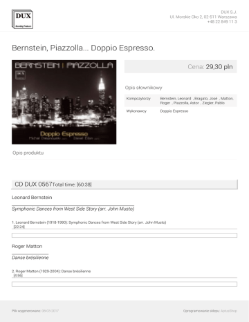 DUX S.J. Ul. Morskie Oko 2, 02-511 Warszawa +48 22 849 11 3 Bernstein, Piazzolla... Doppio Espresso. Cena: 29,30 pln Opis słownikowy Kompozytorzy Bernstein, Leonard ∎, Bragato, José ∎, Matton, Roger ∎, Piazzolla, Astor ∎, Ziegler, Pablo ∎ Wykonawcy Doppio Espresso ∎ Opis produktu CD DUX 0567Total time: [60:38] Leonard Bernstein Symphonic Dances from West Side Story (arr. John Musto) 1. Leonard Bernstein (1918-1990): Symphonic Dances from West Side Story (arr. John Musto) [22:24] Roger Matton Danse brésilienne 2. Roger Matton (1929-2004): Danse brésilienne [4:56] Plik wygenerowano: 08-03-2017 Oprogramowanie sklepu: AptusShop DUX S.J. Ul. Morskie Oko 2, 02-511 Warszawa +48 22 849 11 3 Astor Piazzolla Suite Porteńa de Ballet (arr. José Bragato) 3. Astor Piazzolla (1921-1992): Suite Porteńa de Ballet (arr. José Bragato) [12:04] José Bragato Guarania y Galopa Paraguaya 4. José Bragato (*1915): Guarania y Galopa Paraguaya [4:31] Pablo Ziegler Milongueta 5. Pablo Ziegler (*1944): Milongueta [10:53] Astor Piazzolla Libertango 6. Astor Piazzolla (1921-1992): Libertango [5:48] Wykonawcy: Doppio Espresso Plik wygenerowano: 08-03-2017 Powered by TCPDF (www.tcpdf.org) Oprogramowanie sklepu: AptusShop