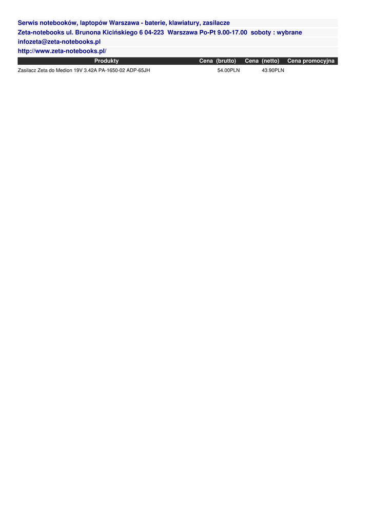 Serwis notebooków, laptopów Warszawa - baterie, klawiatury, zasilacze Zeta-notebooks ul. Brunona Kicińskiego 6 04-223 Warszawa Po-Pt 9.00-17.00 soboty : wybrane [email protected] http://www.zeta-notebooks.pl/ Produkty Zasilacz Zeta do Medion 19V 3.42A PA-1650-02 ADP-65JH Cena (brutto) 54.00PLN Cena (netto) 43.90PLN Cena promocyjna