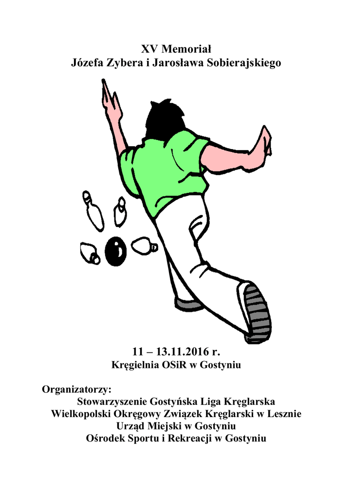 XV Memoriał Józefa Zybera i Jarosława Sobierajskiego 11 – 13.11.2016 r. Kręgielnia OSiR w Gostyniu Organizatorzy: Stowarzyszenie Gostyńska Liga Kręglarska Wielkopolski Okręgowy Związek Kręglarski w Lesznie Urząd Miejski w Gostyniu Ośrodek Sportu i Rekreacji w Gostyniu XV Memoriał Józefa Zybera i Jarosława Sobierajskiego 1. Termin zawodów: 11 – 13 listopada 2016 r. W przypadku dużej ilości zgłoszeń zawody mogą się rozpocząć wcześniej. 2. Termin zgłoszeń do zawodów: zgłoszenia będą przyjmowane do 6 listopada 2016 r. mailowo – [email protected] lub telefonicznie – Marek Podyma tel. 607 224 364. 3. Miejsce: Kręgielnia OSiR w Gostyniu ul. Strzelecka 27. 4. Organizatorzy: Stowarzyszenie „Gostyńska Liga Kręglarska” w Gostyniu, Wielkopolski Okręgowy Związek Kręglarski w Lesznie, Urząd Miejski w Gostyniu Ośrodek Sportu i Rekreacji w Gostyniu. 5. Opłata startowa wynosi 10,00 zł (dziewczynki, chłopcy) oraz 25 zł (młodziczki, młodzicy, juniorki młodsze, juniorzy młodsi). 6. Młodzicy i juniorzy mł. przystępujący do zawodów wykonują 5 minut rzutów treningowych natomiast dzieci 3 minuty rzutów treningowych. 7. Przyjmuje się niżej wymienioną ilość rzutów w poszczególnych kategoriach wiekowych: - dzieci (dziewczynki i chłopcy) 60 rzutów (eliminacje i finał), - młodzicy i młodziczki 120 rzutów (eliminacje i finał), - juniorzy młodsi i juniorki młodsze 120 rzutów (eliminacje i finał). 8. Ilość zawodników biorących udział w finałach zostanie określona po zakończeniu przyjmowania zgłoszeń. 9. O pozycji zawodnika w klasyfikacji indywidualnej decyduje łączny wynik uzyskany w eliminacjach i finale. 10. Klasyfikacja turnieju i wyróżnienia: indywidualna: 1 – 3 puchary, 1 – 6 dyplomy, nagrody drużynowa: 1-3 puchary, 1 – 6 dyplomy, klubowa: 1 – 3 puchary według punktacji: W imieniu organizatorów Prezes Zarządu Stowarzyszenia „Gostyńska Liga Kręglarska” Marek Podyma