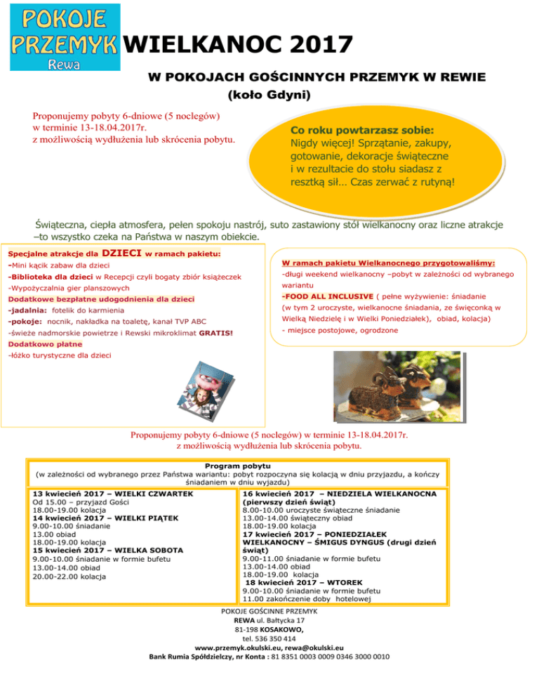 WIELKANOC 2017 W POKOJACH GOŚCINNYCH PRZEMYK W REWIE (koło Gdyni) Proponujemy pobyty 6-dniowe (5 noclegów) w terminie 13-18.04.2017r. z możliwością wydłużenia lub skrócenia pobytu. Co roku powtarzasz sobie: Nigdy więcej! Sprzątanie, zakupy, gotowanie, dekoracje świąteczne i w rezultacie do stołu siadasz z resztką sił… Czas zerwać z rutyną! Świąteczna, ciepła atmosfera, pełen spokoju nastrój, suto zastawiony stół wielkanocny oraz liczne atrakcje –to wszystko czeka na Państwa w naszym obiekcie. Specjalne atrakcje dla DZIECI w ramach pakietu: -Mini kącik zabaw dla dzieci W ramach pakietu Wielkanocnego przygotowaliśmy: -Biblioteka dla dzieci w Recepcji czyli bogaty zbiór książeczek -długi weekend wielkanocny –pobyt w zależności od wybranego -Wypożyczalnia gier planszowych wariantu Dodatkowe bezpłatne udogodnienia dla dzieci -FOOD ALL INCLUSIVE ( pełne wyżywienie: śniadanie -jadalnia: fotelik do karmienia (w tym 2 uroczyste, wielkanocne śniadania, ze święconką w -pokoje: nocnik, nakładka na toaletę, kanał TVP ABC Wielką Niedzielę i w Wielki Poniedziałek), obiad, kolacja) -świeże nadmorskie powietrze i Rewski mikroklimat GRATIS! - miejsce postojowe, ogrodzone Dodatkowo płatne -łóżko turystyczne dla dzieci Proponujemy pobyty 6-dniowe (5 noclegów) w terminie 13-18.04.2017r. z możliwością wydłużenia lub skrócenia pobytu. Program pobytu (w zależności od wybranego przez Państwa wariantu: pobyt rozpoczyna się kolacją w dniu przyjazdu, a kończy śniadaniem w dniu wyjazdu) 13 kwiecień 2017 – WIELKI CZWARTEK Od 15.00 – przyjazd Gości 18.00-19.00 kolacja 14 kwiecień 2017 – WIELKI PIĄTEK 9.00-10.00 śniadanie 13.00 obiad 18.00-19.00 kolacja 15 kwiecień 2017 – WIELKA SOBOTA 9.00-10.00 śniadanie w formie bufetu 13.00-14.00 obiad 20.00-22.00 kolacja 16 kwiecień 2017 – NIEDZIELA WIELKANOCNA (pierwszy dzień świąt) 8.00-10.00 uroczyste świąteczne śniadanie 13.00-14.00 świąteczny obiad 18.00-19.00 kolacja 17 kwiecień 2017 – PONIEDZIAŁEK WIELKANOCNY – ŚMIGUS DYNGUS (drugi dzień świąt) 9.00-11.00 śniadanie w formie bufetu 13.00-14.00 obiad 18.00-19.00 kolacja 18 kwiecień 2017 – WTOREK 9.00-10.00 śniadanie w formie bufetu 11.00 zakończenie doby hotelowej POKOJE GOŚCINNE PRZEMYK REWA ul. Bałtycka 17 81-198 KOSAKOWO, tel. 536 350 414 www.przemyk.okulski.eu, [email protected] Bank Rumia Spółdzielczy, nr Konta : 81 8351 0003 0009 0346 3000 0010 WIELKANOC 2017 W POKOJACH GOŚCINNYCH PRZEMYK W REWIE (koło Gdyni) CENNIK POKOJE CENA W PLN ZA CAŁY POBYT W WYBRANYM TERMINIE MIĘDZY 13-18.04.2017 Z WYŻYWIENIEM ZA WSZYSTKIE OSOBY W ZALEŻNOŚCI OD: WYBRANEGO WARIANTU, RODZAJU POKOJU ORAZ ILOŚCI OSÓB Wariant DŁUGOŚĆ POBYTU Rodzaj pokoju WARIANT I WARIANT I Z RABATEM 10%* WARIANT II WARIANT III WARIANT IV 6 DNIOWY (5 NOCLEGÓW) RABAT 10%* ZA POBYT 6 DNIOWY (5 NOCLEGÓW) 5 DNIOWY (4 NOCLEGI) 4 DNIOWY (3 NOCLEGI) 3 DNIOWY ( 2NOCLEGI) OŚRODEK WYPOCZYNKOWY HOSTEL ROZEWIE (BUDYNEK OBOK OKULSKI GRAND) Standard 2 osobowy Standard plus 2 osobowy Lux 2 osobowy Dodatkowa osoba w pokoju Jedno dziecko (2-8 lat na dostawce)** Jedno dziecko do lat 2 (wspólne łóżko z rodzicami, bez świadczeń***) 900 950 1000 425 375 GRATIS 810 855 900 382 337 GRATIS 800 850 900 340 300 GRATIS 660 710 760 255 205 GRATIS 500 550 600 200 160 GRATIS Informacje uzupełniające: Świadczenia rozpoczynają się kolacją w dniu przyjazdu i kończą śniadaniem w dniu wyjazdu. Dopłata do pokoju 2 osobowego zajętego przez 1 osobę 50zł/doba Na Państwa życzenie przygotujemy tradycyjną, postną kolację w Wielki Piątek istnieje możliwość wcześniejszego przyjazdu lub późniejszego wyjazdu W związku z dużym zainteresowaniem pobytami w terminach świątecznych, prosimy o wcześniejszą rezerwację dodatkowego wyposażenia pokoju w udogodnienia dla dzieci. Pokój typu standard posiada okno dachowe typu velux Pokój typu standard plus posiada wyjście na patio (ogródek wewnętrzny ogrodzony z czterech stron)\ Pokój typu lux posiada niewielki balkon z widokiem na patio lub parking Istnieje możliwość wcześniejszego przyjazdu lub późniejszego wyjazdu w cenie od 70zł*osobodzień w pokoju typu Standard ze śniadaniem (cena obowiązuje poza terminem świątecznym). Istnieje możliwość dokupienia wyżywienia dla dziecka do lat 2 w cenie 50zł/dzień (pełne wyżywienie) Doba hotelowa rozpoczyna się o godz. 15:00 w dniu przyjazdu i kończy o godz. 10:00 w dniu wyjazdu. Ceny brutto (zawierają podatek VAT), do kosztów pobytu należy doliczyć opłatę klimatyczną w wysokości 1,80 zł/os/doba. Wypożyczenie ręcznika 7zł/jednorazowo na pobyt, 5zł każda wymiana. *Przy dokonaniu rezerwacji do 28.02.2017. i wpłacie 50% wartości zamówienia. ** Ilość możliwych dostawek w pokoju należy ustalić wcześniej z recepcją ***Wiek dzieci, którym przysługują zniżki oraz bezpłatne pobyty musi zostać potwierdzony dokumentem zawierającym datę urodzenia dziecka. Organizator zastrzega sobie prawo do wprowadzenia zmian w programie. Nie ma możliwości zwrotu pieniędzy ani rekompensaty za niewykorzystane usługi będące składowymi pakietu. Zapraszamy do spędzenia Świąt Wielkanocnych w kameralnej, rodzinnej atmosferze w Pokojach Gościnnych „Przemyk” w Rewie Rezerwacja pakietu recepcja , kontakt: tel. 536 350 414, e-mail: [email protected] POKOJE GOŚCINNE PRZEMYK REWA ul. Bałtycka 17 81-198 KOSAKOWO, tel. 536 350 414 www.przemyk.okulski.eu, [email protected] Bank Rumia Spółdzielczy, nr Konta : 81 8351 0003 0009 0346 3000 0010