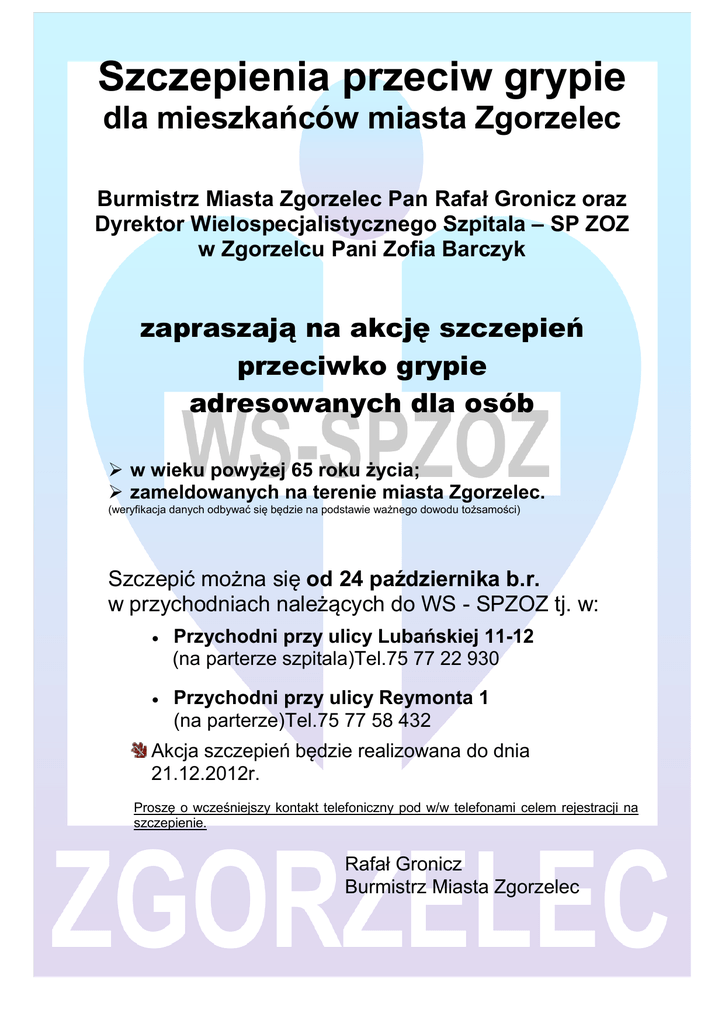 Szczepienia przeciw grypie dla mieszkańców miasta Zgorzelec Burmistrz Miasta Zgorzelec Pan Rafał Gronicz oraz Dyrektor Wielospecjalistycznego Szpitala – SP ZOZ w Zgorzelcu Pani Zofia Barczyk zapraszają na akcję szczepień przeciwko grypie adresowanych dla osób w wieku powyżej 65 roku życia; zameldowanych na terenie miasta Zgorzelec. (weryfikacja danych odbywać się będzie na podstawie ważnego dowodu tożsamości) Szczepić można się od 24 października b.r. w przychodniach należących do WS - SPZOZ tj. w: Przychodni przy ulicy Lubańskiej 11-12 (na parterze szpitala)Tel.75 77 22 930 Przychodni przy ulicy Reymonta 1 (na parterze)Tel.75 77 58 432 Akcja szczepień będzie realizowana do dnia 21.12.2012r. Proszę o wcześniejszy kontakt telefoniczny pod w/w telefonami celem rejestracji na szczepienie. Rafał Gronicz Burmistrz Miasta Zgorzelec
