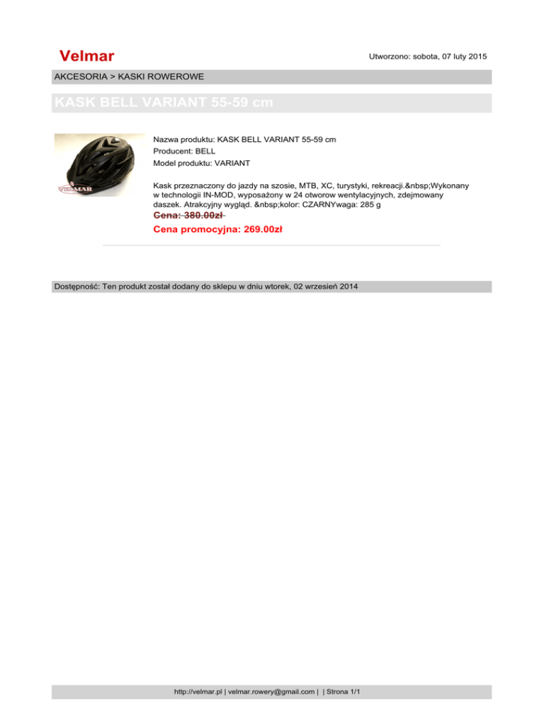 Velmar Utworzono: sobota, 07 luty 2015 AKCESORIA > KASKI ROWEROWE KASK BELL VARIANT 55-59 cm Nazwa produktu: KASK BELL VARIANT 55-59 cm Producent: BELL Model produktu: VARIANT Kask przeznaczony do jazdy na szosie, MTB, XC, turystyki, rekreacji. Wykonany w technologii IN-MOD, wyposażony w 24 otworow wentylacyjnych, zdejmowany daszek. Atrakcyjny wygląd. kolor: CZARNYwaga: 285 g Cena: 380.00zł Cena promocyjna: 269.00zł Dostępność: Ten produkt został dodany do sklepu w dniu wtorek, 02 wrzesień 2014 http://velmar.pl | [email protected] | | Strona 1/1