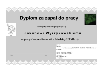 Dyplom za zapał do pracy Niniejszy dyplom przyznaje się Jakubowi Wyrzykowskiemu za pomysł racjonalizatorski z dziedziny HTML :-) Podpis Data
