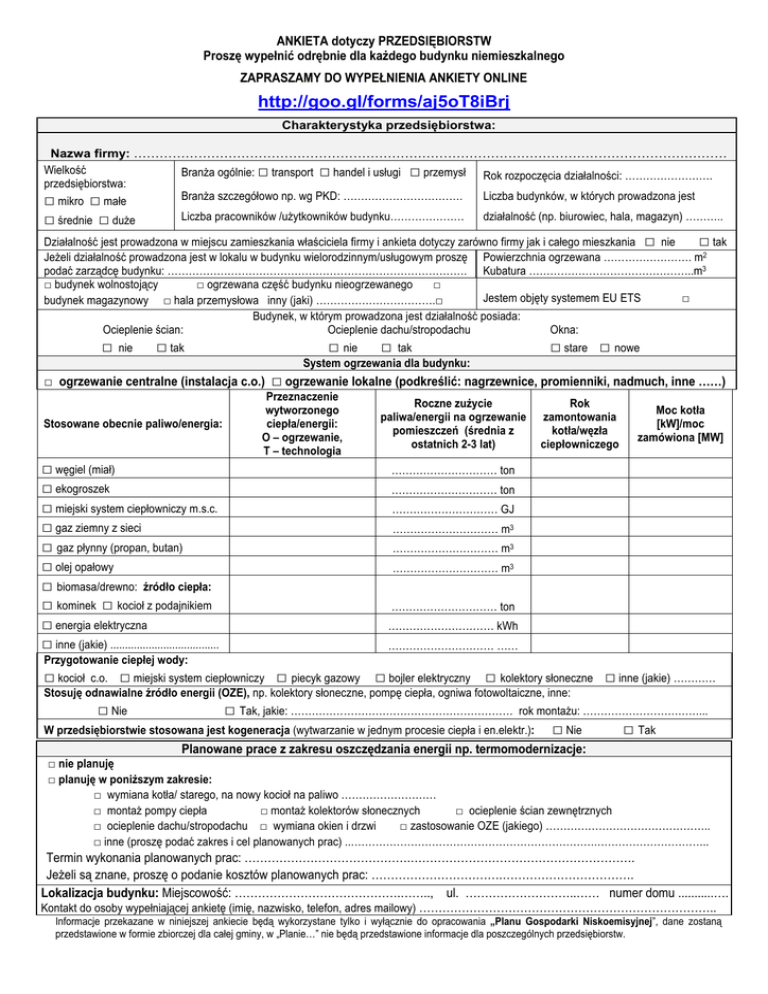 ANKIETA dotyczy PRZEDSIĘBIORSTW Proszę wypełnić odrębnie dla każdego budynku niemieszkalnego ZAPRASZAMY DO WYPEŁNIENIA ANKIETY ONLINE http://goo.gl/forms/aj5oT8iBrj Charakterystyka przedsiębiorstwa: Nazwa firmy: ………………………………………………………………………………………………………………………… Wielkość Branża ogólnie: □ transport □ handel i usługi □ przemysł Rok rozpoczęcia działalności: ……………………. przedsiębiorstwa: Branża szczegółowo np. wg PKD: ……………………………. Liczba budynków, w których prowadzona jest □ mikro □ małe □ średnie □ duże Liczba pracowników /użytkowników budynku………………… działalność (np. biurowiec, hala, magazyn) ……….. Działalność jest prowadzona w miejscu zamieszkania właściciela firmy i ankieta dotyczy zarówno firmy jak i całego mieszkania □ nie □ tak Jeżeli działalność prowadzona jest w lokalu w budynku wielorodzinnym/usługowym proszę Powierzchnia ogrzewana ……………………. m2 podać zarządcę budynku: …………………………………………………………………………. Kubatura ………………………………………..m3 □ budynek wolnostojący □ ogrzewana część budynku nieogrzewanego □ Jestem objęty systemem EU ETS □ budynek magazynowy □ hala przemysłowa inny (jaki) …………………………….□ Ocieplenie ścian: □ nie Budynek, w którym prowadzona jest działalność posiada: Ocieplenie dachu/stropodachu □ tak □ nie □ tak System ogrzewania dla budynku: □ ogrzewanie centralne (instalacja c.o.) Stosowane obecnie paliwo/energia: □ węgiel (miał) □ ekogroszek □ miejski system ciepłowniczy m.s.c. □ gaz ziemny z sieci □ gaz płynny (propan, butan) □ olej opałowy □ biomasa/drewno: źródło ciepła: □ kominek □ kocioł z podajnikiem □ energia elektryczna □ inne (jakie) ..................................... Okna: □ stare □ nowe □ ogrzewanie lokalne (podkreślić: nagrzewnice, promienniki, nadmuch, inne ……) Przeznaczenie wytworzonego ciepła/energii: O – ogrzewanie, T – technologia Roczne zużycie paliwa/energii na ogrzewanie pomieszczeń (średnia z ostatnich 2-3 lat) Rok zamontowania kotła/węzła ciepłowniczego Moc kotła [kW]/moc zamówiona [MW] ………………………… ton ………………………… ton ………………………… GJ ………………………… m3 ………………………… m3 ………………………… m3 ………………………… ton ………………………… kWh ………………………… …… Przygotowanie ciepłej wody: □ kocioł c.o. □ miejski system ciepłowniczy □ piecyk gazowy □ bojler elektryczny □ kolektory słoneczne Stosuję odnawialne źródło energii (OZE), np. kolektory słoneczne, pompę ciepła, ogniwa fotowoltaiczne, inne: □ Nie □ Tak, jakie: ……………………………………………………… □ inne (jakie) ………… rok montażu: ……………………………... W przedsiębiorstwie stosowana jest kogeneracja (wytwarzanie w jednym procesie ciepła i en.elektr.): □ Nie □ Tak Planowane prace z zakresu oszczędzania energii np. termomodernizacje: □ nie planuję □ planuję w poniższym zakresie: □ wymiana kotła/ starego, na nowy kocioł na paliwo ……………………… □ montaż pompy ciepła □ montaż kolektorów słonecznych □ ocieplenie ścian zewnętrznych □ ocieplenie dachu/stropodachu □ wymiana okien i drzwi □ zastosowanie OZE (jakiego) ……………………………………….. □ inne (proszę podać zakres i cel planowanych prac) ..…………………………………………………………….………………………….. Termin wykonania planowanych prac: …………………………………….…………………………………………………. Jeżeli są znane, proszę o podanie kosztów planowanych prac: …………………………….……………………………. Lokalizacja budynku: Miejscowość: …………………………………….…….., ul. ………………………..…… numer domu ...........…. Kontakt do osoby wypełniającej ankietę (imię, nazwisko, telefon, adres mailowy) ………………………………………………………………….. Informacje przekazane w niniejszej ankiecie będą wykorzystane tylko i wyłącznie do opracowania „Planu Gospodarki Niskoemisyjnej”, dane zostaną przedstawione w formie zbiorczej dla całej gminy, w „Planie…” nie będą przedstawione informacje dla poszczególnych przedsiębiorstw.