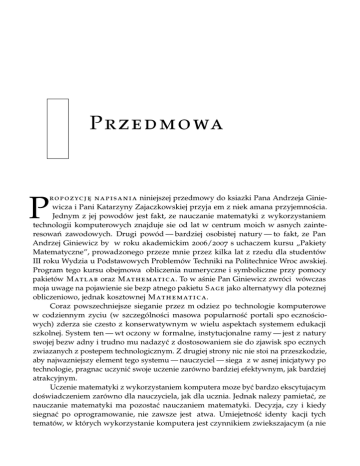 P r z e d m o wa P ro p o z yc j e˛ na pisania niniejszej przedmowy do ksia˛żki Pana Andrzeja Giniewicza i Pani Katarzyny Zajaczkowskiej ˛ przyjałem ˛ z niekłamana˛ przyjemnościa. ˛ Jednym z jej powodów jest fakt, że nauczanie matematyki z wykorzystaniem technologii komputerowych znajduje sie˛ od lat w centrum moich własnych zainteresowań zawodowych. Drugi powód — bardziej osobistej natury — to fakt, że Pan Andrzej Giniewicz był w roku akademickim 2006/2007 słuchaczem kursu „Pakiety Matematyczne”, prowadzonego przeze mnie przez kilka lat z rzedu ˛ dla studentów III roku Wydziału Podstawowych Problemów Techniki na Politechnice Wrocławskiej. Program tego kursu obejmował obliczenia numeryczne i symboliczne przy pomocy pakietów Matlab oraz Mathematica. To właśnie Pan Giniewicz zwrócił wówczas moja˛ uwage˛ na pojawienie sie˛ bezpłatnego pakietu Sage jako alternatywy dla pote˛ żnej obliczeniowo, jednak kosztownej Mathematica. Coraz powszechniejsze sieganie ˛ przez młodzież po technologie komputerowe w codziennym życiu (w szczególności masowa popularność portali społecznościowych) zderza sie˛ czesto ˛ z konserwatywnym w wielu aspektach systemem edukacji szkolnej. System ten — wtłoczony w formalne, instytucjonalne ramy — jest z natury swojej bezwładny i trudno mu nada˛żyć z dostosowaniem sie˛ do zjawisk społecznych zwiazanych ˛ z postepem ˛ technologicznym. Z drugiej strony nic nie stoi na przeszkodzie, aby najważniejszy element tego systemu — nauczyciel — siegał ˛ z własnej inicjatywy po technologie, ˛ pragnac ˛ uczynić swoje uczenie zarówno bardziej efektywnym, jak bardziej atrakcyjnym. Uczenie matematyki z wykorzystaniem komputera może być bardzo ekscytujacym ˛ doświadczeniem zarówno dla nauczyciela, jak dla ucznia. Jednak należy pamietać, ˛ że nauczanie matematyki ma pozostać nauczaniem matematyki. Decyzja, czy i kiedy siegn ˛ ać ˛ po oprogramowanie, nie zawsze jest łatwa. Umiejetność ˛ identyfikacji tych tematów, w których wykorzystanie komputera jest czynnikiem zwiekszaj ˛ acym ˛ (a nie x Przedmowa zaburzajacym) ˛ efektywność procesu dydaktycznego, potrafi być dla nauczyciela nie lada wyzwaniem. Technologiczne wspomaganie uczenia matematyki może przyjmować różne formy. Moga˛ to być materiały publikowane przez nauczyciela w Internecie (np. dodatkowe przykłady czy zadania). Moga˛ to być interaktywne lub statyczne ilustracje przygotowane przez nauczyciela przed lekcja˛ badź ˛ tworzone na oczach uczniów w czasie lekcji. Moga˛ to być eksperymenty, które uczniowie maja˛ przy pomocy tegoż oprogramowania wykonać w ramach zadania domowego. Wreszcie moga˛ to być kombinacje wszystkich różnych takich form. Przy dzisiejszym stanie zaawansowania technologii komputerowych i komunikacyjnych nauczyciel może swobodnie docierać do granic własnej pomysłowości w ich stosowaniu. Cheć ˛ (lub odczuwana potrzeba) siegni ˛ ecia ˛ po oprogramowanie w celu ilustracji danego pojecia ˛ czy tematu może powstawać w rozmaity sposób. Czasami nauczyciel czuje, że naturalna˛ kolejnościa˛ jest klasyczne wprowadzenie do tematu (kreda i tablica), po którym nastepuje ˛ wirtualny eksperyment. Czasami — przeciwnie — interaktywna demonstracja może stanowić naturalne wprowadzenie do ścisłego omówienia danego pojecia ˛ czy zależności matematycznej. Sage jest jednym z wielu programów pozwalajacych ˛ na ilustrowanie matematyki za pomoca˛ komputera i właśnie po ten pakiet siegn ˛ eli ˛ Autorzy w swojej w˛edrówce że ich ksia˛żka przez matematyke˛ „z komputerem w garści”. Podkreślaja˛ oni we wstepie, ˛ ˛ matematyki. Rzeczywiście, nie jest to podrecznik ˛ w klanie jest kolejnym podrecznikiem sycznym znaczeniu tego słowa. Jest to właśnie pomysłowo i starannie zaplanowana, pełna wirtualnych eksperymentów w˛edrówka przez matematyke˛ elementarna. ˛ Autorzy doskonale wywiazuj ˛ a˛ sie˛ z zadania, aby o matematyce mówić w sposób przystepny ˛ ˛ a˛ sie˛ z zadania, aby pokazać uczniowi, w jaki i atrakcyjny. Równie dobrze wywiazuj sposób oprogramowanie komputerowe nie tylko może nas uwolnić od żmudnych rachunków, ale — co ważniejsze — pozwala eksperymentować z rozmaitymi pojeciami. ˛ Godna podkreślenia jest kompletność ksia˛żki z punktu widzenia jej zawartości ma˛ unikneli ˛ naturalnej pokusy, aby pisać o możliwościach tematycznej. Autorzy umiejetnie pakietu S ag e, ilustrujac ˛ je przykładami z matematyki. Przyjeli ˛ konwencje, ˛ w myśl której mówimy o matematyce, a po oprogramowanie siegamy ˛ wówczas, gdy omawiany fragment materiału w naturalny sposób do tego zacheca. ˛ Z tego punktu widzenia szczególnie przydatny dla nauczyciela może być fragment poświecony ˛ kombinatoryce, rachunkowi prawdopodobieństwa i statystyce opisowej. Ilustrowanie pojeć ˛ kombinatoryki za pomoca˛ recznie ˛ wykonywanych przykładów jest żmudne i czesto ˛ zniechecaj ˛ ace. ˛ Użycie komputera pozwala na efektywne i atrakcyjne demonstrowanie wystepuj ˛ acych ˛ w kombinatoryce pojeć ˛ (np. zbioru określonych kombinacji zbioru skończonego). To samo dotyczy wielkości wystepuj ˛ acych ˛ w statystyce opisowej. Podsumowujac, ˛ czytelnik otrzymuje do reki ˛ bardzo ciekawa˛ pozycje˛ literatury edukacyjnej. Nauczyciel matematyki znajdzie w niej źródło inspiracji do rozwijania własnego profesjonalizmu. Uczeń odkryje, że matematyka nie jest zlepkiem suchych formuł, lecz światem, który można przy pomocy komputera prawie namacalnie badać. Przemysław Kajetanowicz Wrocław, 08.09.2014