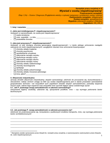 Narzędzie pracy socjalnej nr 8 Wywiad z osobą niepełnosprawną1 Przeznaczenie narzędzia: Etap I (1b) – Ocena / Diagnoza (Pogłębienie wiedzy o sytuacji związanej z problemem osoby/ rodziny) Zastosowanie narzędzia: obligatoryjne Rodzaj narzędzia: specjalistyczne Wypełnia: pracownik socjalny z Klientem Sygnatura: OS_ON_8 1. Imię i nazwisko _________________________________________________________________________ 2. Jakie jest źródło/geneza P. niepełnosprawności? /wskazać co spowodowało, że osoba jest niepełnosprawna/ − wada wrodzona uraz, wypadek – w roku __________________ − − przewlekła choroba 3. Jaka jest przyczyna P. niepełnosprawności? /wskazać co jest wiodącą chorobą generującą niepełnosprawność i z tytułu jakiego schorzenia nastąpiło zaliczenie do osób niepełnosprawnych, uwzględnić również inne schorzenia towarzyszące/ − choroby układu krążenia choroby psychiczne − − upośledzenie umysłowe − zaburzenie narządu wzroku dysfunkcja narządu ruchu − − zaburzenie narządu słuchu − zaburzenie narządu mowy choroby układu oddechowego − − choroby neurologiczne − epilepsja choroby układu pokarmowego − − choroby układu moczowo-płciowego − inne, jakie?_________________________________________________________________________ 4. Aktywność indywidualna /proszę określić aktywność indywidualną: stopień samoobsługi, zdolność do poruszania się, komunikowania z otoczeniem; należy zwrócić uwagę na fakt czy osoba niepełnosprawna jest w stanie prowadzić samodzielnie gospodarstwo domowe i we wszystkich tych aspektach określić stopień samodzielności, potrzebę wsparcia innych osób, zakres tego wsparcia oraz wszystkie inne czynniki dające obraz codziennego życia/ 4.1. Jak P. postrzega swoją samodzielność w zakresie samoobsługi? /utrzymanie higieny osobistej, ubieranie się, spożywanie posiłków, inne – czy wymaga pokonania barier technicznych/ _________________________________________________________________________________________ _________________________________________________________________________________________ _________________________________________________________________________________________ _________________________________________________________________________________________ _________________________________________________________________________________________ 4.2. Jak postrzega P. swoją samodzielność w zakresie poruszania się? /zdolność do przemieszczania się, korzystania z publicznych środków transportu, inne, czy wymaga pokonania barier architektonicznych/ _________________________________________________________________________________________ _________________________________________________________________________________________ _________________________________________________________________________________________ _________________________________________________________________________________________ 1 Narzędzie zostało opracowane przez Zespół ds. narzędzi pracy socjalnej, w opracowywaniu wykorzystano prace Zespołu ds. osób niepełnosprawnych. 1 _________________________________________________________________________________________ 4.3. Jak postrzega P. swoją samodzielność w zakresie komunikowania się? /zdolność do słyszenia, rozumienia mowy, artykulacji mowy, widzenia, inne/ _________________________________________________________________________________________ _________________________________________________________________________________________ _________________________________________________________________________________________ _________________________________________________________________________________________ _________________________________________________________________________________________ _________________________________________________________________________________________ 4.4. Jak postrzega P. swoją samodzielność w zakresie prowadzenia gospodarstwa domowego? /czy potrzebuje pomocy i w czym/ _________________________________________________________________________________________ _________________________________________________________________________________________ _________________________________________________________________________________________ _________________________________________________________________________________________ _________________________________________________________________________________________ _________________________________________________________________________________________ 5. Uczestnictwo w życiu społecznym /proszę wskazać czy Klient uczestniczy w życiu społecznym, zwrócić uwagę na spędzanie czasu wolnego, kontakty rodzinne i towarzyskie – ich realizację ale także potrzeby w tym zakresie, które nie są realizowane; uwzględnić również czy osoba niepełnosprawna byłaby w stanie rozwijać relacje społeczne przy wsparciu innych/ 5.1. Jaką rolę w P. życiu pełni rodzina? Czy utrzymuje P. kontakt z członkami rodziny zamieszkującymi oddzielnie i jak często? Jak ocenia P. relacje rodzinne? /proszę określić sposób postrzegania relacji rodzinnych i roli rodziny w życiu Klienta/ _________________________________________________________________________________________ _________________________________________________________________________________________ _________________________________________________________________________________________ _________________________________________________________________________________________ _________________________________________________________________________________________ _________________________________________________________________________________________ _________________________________________________________________________________________ 5.2. Jak postrzega P. swoje uczestnictwo w życiu społecznym? /kulturowym, obywatelskim, środowiskowym, innym/ ________________