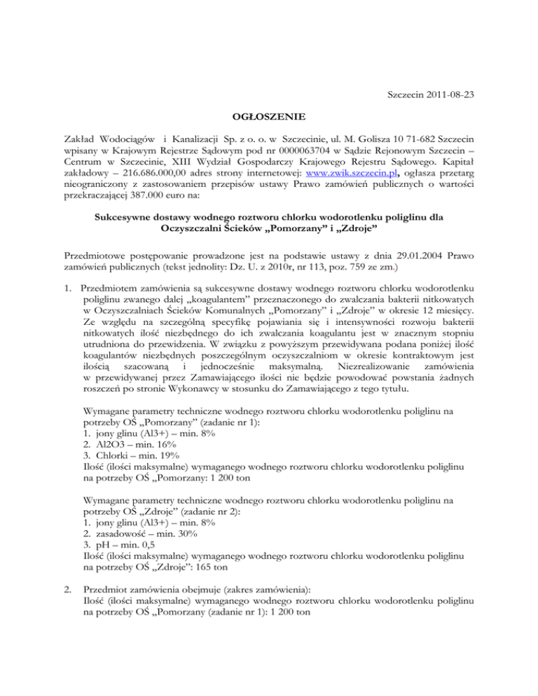 Szczecin 2011-08-23 OGŁOSZENIE Zakład Wodociągów i Kanalizacji Sp. z o. o. w Szczecinie, ul. M. Golisza 10 71-682 Szczecin wpisany w Krajowym Rejestrze Sądowym pod nr 0000063704 w Sądzie Rejonowym Szczecin – Centrum w Szczecinie, XIII Wydział Gospodarczy Krajowego Rejestru Sądowego. Kapitał zakładowy – 216.686.000,00 adres strony internetowej: www.zwik.szczecin.pl, ogłasza przetarg nieograniczony z zastosowaniem przepisów ustawy Prawo zamówień publicznych o wartości przekraczającej 387.000 euro na: Sukcesywne dostawy wodnego roztworu chlorku wodorotlenku poliglinu dla Oczyszczalni Ścieków „Pomorzany” i „Zdroje” Przedmiotowe postępowanie prowadzone jest na podstawie ustawy z dnia 29.01.2004 Prawo zamówień publicznych (tekst jednolity: Dz. U. z 2010r, nr 113, poz. 759 ze zm.) 1. Przedmiotem zamówienia są sukcesywne dostawy wodnego roztworu chlorku wodorotlenku poliglinu zwanego dalej „koagulantem” przeznaczonego do zwalczania bakterii nitkowatych w Oczyszczalniach Ścieków Komunalnych „Pomorzany” i „Zdroje” w okresie 12 miesięcy. Ze względu na szczególną specyfikę pojawiania się i intensywności rozwoju bakterii nitkowatych ilość niezbędnego do ich zwalczania koagulantu jest w znacznym stopniu utrudniona do przewidzenia. W związku z powyższym przewidywana podana poniżej ilość koagulantów niezbędnych poszczególnym oczyszczalniom w okresie kontraktowym jest ilością szacowaną i jednocześnie maksymalną. Niezrealizowanie zamówienia w przewidywanej przez Zamawiającego ilości nie będzie powodować powstania żadnych roszczeń po stronie Wykonawcy w stosunku do Zamawiającego z tego tytułu. Wymagane parametry techniczne wodnego roztworu chlorku wodorotlenku poliglinu na potrzeby OŚ „Pomorzany” (zadanie nr 1): 1. jony glinu (Al3+) – min. 8% 2. Al2O3 – min. 16% 3. Chlorki – min. 19% Ilość (ilości maksymalne) wymaganego wodnego roztworu chlorku wodorotlenku poliglinu na potrzeby OŚ „Pomorzany: 1 200 ton Wymagane parametry techniczne wodnego roztworu chlorku wodorotlenku poliglinu na potrzeby OŚ „Zdroje” (zadanie nr 2): 1. jony glinu (Al3+) – min. 8% 2. zasadowość – min. 30% 3. pH – min. 0,5 Ilość (ilości maksymalne) wymaganego wodnego roztworu chlorku wodorotlenku poliglinu na potrzeby OŚ „Zdroje”: 165 ton 2. Przedmiot zamówienia obejmuje (zakres zamówienia): Ilość (ilości maksymalne) wymaganego wodnego roztworu chlorku wodorotlenku poliglinu na potrzeby OŚ „Pomorzany (zadanie nr 1): 1 200 ton Ilość (ilości maksymalne) wymaganego wodnego roztworu chlorku wodorotlenku poliglinu na potrzeby OŚ „Zdroje” (zadanie nr 2): 165 ton 3. Termin realizacji zamówienia – umowa z wybranym Wykonawcą zostanie zawarta na okres 12 miesięcy od daty zawarcia umowy. 4. Warunki udziału w postępowaniu 4.1. O udzielenie niniejszego zamówienia ubiegać się mogą wykonawcy, którzy spełniają warunki określone w art. 22 ust. 1 ustawy Prawo zamówień publicznych tzn.: (1) posiadają uprawnienia do wykonywania określonej działalności lub czynności, jeżeli przepisy prawa nakładają obowiązek ich posiadania, (2) posiadają wiedzę i doświadczenie; (3) dysponują odpowiednim potencjałem technicznym oraz osobami zdolnymi do wykonania zamówienia; (4) spełniają warunki sytuacji ekonomicznej i finansowej. 4.2. Przez posiadanie wiedzy i doświadczenia do wykonania zamówienia, należy w szczególności rozumieć wykazanie się przez wykonawcę w okresie ostatnich trzech lat przed upływem terminu składania ofert, a jeżeli okres prowadzenia działalności jest krótszy w tym okresie – co najmniej 1 dostawą lub dostawami wodnego roztworu chlorku wodorotlenku poliglinu lub chlorku wodorotlenku siarczanu poliglinu o łącznej wartości 500.000,00 zł netto (dotyczy tylko tych Wykonawców, którzy złożą ofertę w zakresie zadania nr 1). 5. Ocena spełniania warunków udziału w postępowaniu, ocena braku podstaw do wykluczenia z postępowania 5.1. Zamawiający dokona oceny spełniania warunków udziału w postępowaniu oraz oceny braku podstaw do wykluczenia z postępowania na podstawie dokumentów wymaganych na podstawie specyfikacji istotnych warunków zamówienia, złożonych przez wykonawcę wraz z jego ofertą, w oparciu o zasadę „spełnia / nie spełnia”. Niespełnienie przez wykonawcę chociażby jednego warunku skutkować będzie wykluczeniem wykonawcy z przedmiotowego postępowania. 5.2. Na potwierdzenie spełnienia warunków udziału w postępowaniu, określonych w pkt 4.1. ppkt (1) do (4) niniejszego ogłoszenia, wykonawca obowiązany jest załączyć do oferty następujące dokumenty: 5.2.1. oświadczenie o spełnianiu warunków udziału w postępowaniu określonych w art. 22 Prawa zamówień publicznych, zgodnie ze wzorem określonym w formularzu nr 2, stanowiącym załącznik do specyfikacji istotnych warunków zamówienia, 5.2.2. wykaz wykonanych lub wykonywanych w ostatnich trzech latach przed upływem terminu składania ofert, a jeżeli okres prowadzenia działalności jest krótszy w tym okresie dostaw, o których mowa w pkt 4.2. ogłoszenia, na formularzu nr 4, stanowiącym załącznik do SIWZ z podaniem ich wartości, przedmiotu, dat wykonania i odbiorców, wraz z dokumentami potwierdzającymi, że dostawy te zostały wykonane lub są wykonywane należycie. (dotyczy tylko tych Wykonawców, którzy złożą ofertę w zakresie zadania nr 1). 5.3. W celu wykazania braku podstaw do wykluczenia z postępowania o udzielenie zamówienia wykonawcy w okolicznościach, o których mowa w art. 24 ust. 1 Prawo zamówień publicznych winni przedłożyć następujące dokumenty: 5.3.1. oświadczenie o braku podstaw do wykluczenia z postępowania o udzielenie zamówienia publicznego wykonawcy w okolicznościach, o których mowa w art. 24 ust. 1 Prawo zamówień publicznych – formularz nr 3 stanowiący załącznik do specyfikacji istotnych warunków zamówienia, 5.3.2. aktu