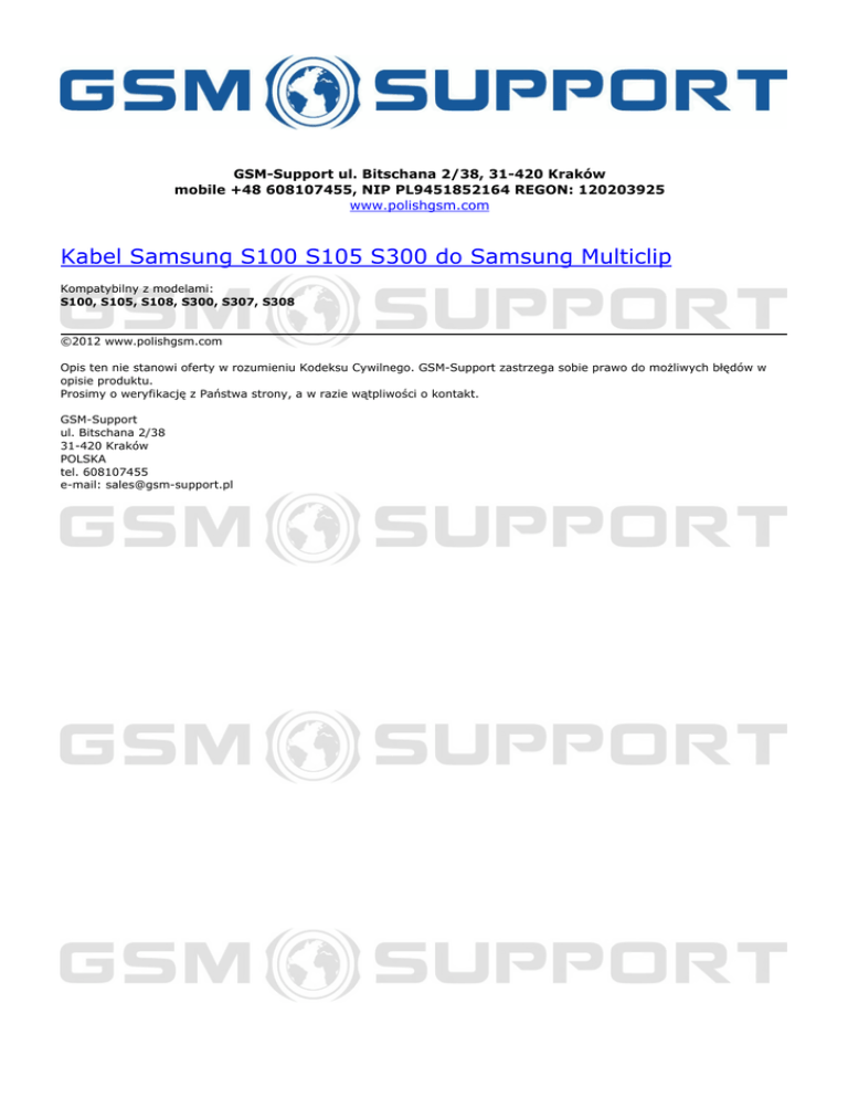 GSM-Support ul. Bitschana 2/38, 31-420 Kraków mobile +48 608107455, NIP PL9451852164 REGON: 120203925 www.polishgsm.com Kabel Samsung S100 S105 S300 do Samsung Multiclip Kompatybilny z modelami: S100, S105, S108, S300, S307, S308 ©2012 www.polishgsm.com Opis ten nie stanowi oferty w rozumieniu Kodeksu Cywilnego. GSM-Support zastrzega sobie prawo do możliwych błędów w opisie produktu. Prosimy o weryfikację z Państwa strony, a w razie wątpliwości o kontakt. GSM-Support ul. Bitschana 2/38 31-420 Kraków POLSKA tel. 608107455 e-mail: [email protected] Powered by TCPDF (www.tcpdf.org)