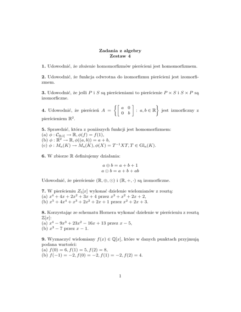 1. Udowodnić, że złożenie homomorfizmów pierścieni jest homomorfizmem.