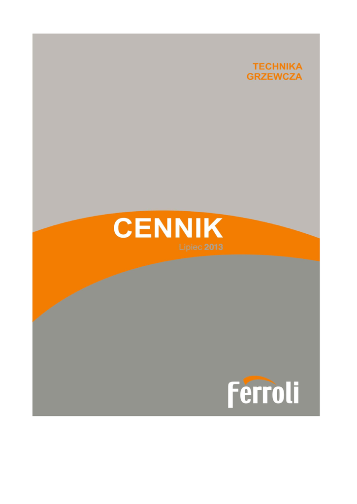 Ważny od 01.07.2012 Cennik FERROLI Poland 2013 Kod Nazwa Cena katalogowe netto Opis W skład pakietu wchodzi: kocioł wiszący Divatop HC24, zasobnik c.w.u. o pojemności 150 litrów, regulator Romeo, czujnik zewnętrzny, czujnik zanurzeniowy zasobnika. W skład pakietu wchodzi: kocioł wiszący Divatop HC32, zasobnik c.w.u. o pojemności 150 litrów, regulator Romeo, czujnik zewnętrzny, czujnik zanurzeniowy zasobnika. W skład pakietu wchodzi: kocioł wiszący Divatop HF24, zasobnik c.w.u. o pojemności 150 litrów, regulator Romeo, czujnik zewnętrzny, czujnik zanurzeniowy zasobnika. W skład pakietu wchodzi: kocioł wiszący Divatop HF32, zasobnik c.w.u. o pojemności 150 litrów, regulator Romeo, czujnik zewnętrzny, czujnik zanurzeniowy zasobnika. zbiornik wyrównawczy, zestaw montażowy dla kolektorów. Kocioł kondensacyjny wiszący z wbudowanym zasobnikiem warstwowym o pojemności 25 litrów. Moc cieplna (80-60) 24,6 kW KPL.DTHC24 Pakiet DIVATOP HC24 5 304,00 zł KPL.DTHC32 Pakiet DIVATOP HC32 5 772,00 zł KPL.DTHF24 Pakiet DIVATOP HF24 5 772,00 zł KPL.DTHF32 Pakiet DIVATOP HF32 5 980,00 zł 0M7X6IWA ECONCEPT ST 25 8 112,00 zł 0CAF5IGA DOMICONDENS F28 4 784,00 zł Kocioł kondensacyjny wiszący dwufunkcyjny. Moc cieplna (80-60) 26,2 kW 0N7X4IAA ECONCEPT SOLAR ST 25 15 080,00 zł Kocioł kondensacyjny z wbudowanym zasobnikiem warstwowym o pojemności 180 litrów. Jest on przystosowany do bezpośredniej współpracy z panelami solarnymi. Moc cieplna (80-60) 24,6 kW 0M7OAIWA ECONCEPT 51 A 11 024,00 zł Kocioł kondensacyjny wiszący jednofunkcyjny. Moc cieplna (80-60) 48,8 kW 0N6OAIWA ENERGY TOP W 70 13 468,00 zł Kocioł kondensacyjny wiszący jednofunkcyjny. Moc cieplna (80-60) 64,6 kW, (50-30) 69,9 kW 0M6OEIWA ENERGY TOP W 125 19 240,00 zł Kocioł kondensacyjny wiszący jednofunkcyjny. Moc cieplna (80-60) 113,7 kW 0M6OBMWA ENERGY TOP B 80 19 032,00 zł Kocioł kondensacyjny stojący jednofunkcyjny. Moc cieplna (80-60) 73,5 kW 0M6OEMWA ENERGY TOP B 125 24 752,00 zł Kocioł kondensacyjny stojący jednofunkcyjny. Moc cieplna (80-60) 113,7 kW 0M6OGMWA ENERGY TOP B 160 35 984,00 zł Kocioł kondensacyjny stojący jednofunkcyjny. Moc cieplna (80-60) 147,0 kW 0M6OKMWA ENERGY TOP B 250 42 744,00 zł Kocioł kondensacyjny stojący jednofunkcyjny. Moc cieplna (80-60) 227,4 kW 0M7LAMWA ECONCEPT 51 13 416,00 zł Kocioł kondensacyjny stojący jednofunkcyjny. Moc cieplna (80-60) 48,8 kW ECONCEPT 101 21 320,00 zł Kocioł kondensacyjny stojący jednofunkcyjny. Moc cieplna (80-60) 97,6 kW 0ABC4JWA DOMIPROJECT C24 D 2 808,00 zł 0ABF4JWA DOMIPROJECT F24 D 3 068,00 zł 0ACL4I4A DIVATOP HC24 3 068,00 zł 0ACL7I4A DIVATOP HC32 3 536,00 zł 0ACO4IWA DIVATOP HF24 3 536,00 zł 0ACO7IWA DIVATOP HF32 3 744,00 zł 0BCU4IWA DIVATOP 60 C24 6 448,00 zł 0BCX4WWA DIVATOP 60 F24 6 760,00 zł 0E4L3S4A PEGASUS D 20 5 564,00 zł 0E4L4S4A PEGASUS D 30 6 292,00 zł 0E4L5S4A PEGASUS D 40 6 864,00 zł 0E4M7AWA PEGASUS 67 LN 2S 14 508,00 zł 0E4M8AWA PEGASUS 77 LN 2S 15 548,00 zł 0E4M9AWA PEGASUS 87 LN 2S 16 536,00 zł 0E4MAAWA PEGASUS 97 LN 2S 17 784,00 zł 0E4MBAWA PEGASUS 107 LN 2S 18 564,00 zł 0E2M8AWA PEGASUS N 119 LN 2S 24 180,00 zł 0E2M9AWA PEGASUS 136 N LN 2S 25 636,00 zł 0E2MAAWA PEGASUS 153 N LN 2S 29 692,00 zł 0E2MBAWA PEGASUS 170 N LN 2S 31 044,00 zł 0E2MCAWA PEGASUS 187 N LN 2S 33 852,00 zł 0E2MEAWA PEGASUS 221 N LN 2S 37 752,00 zł 0E2MGAWA PEGASUS 255 N LN 2S 40 612,00 zł 0E2MIAWA PEGASUS 289 N LN 2S 42 853,00 zł 0IHJ3HWA ATLAS D 30 4 576,00 zł 0IHJ4HWA ATLAS D 42 5 304,00 zł 0IHJ5HWA ATLAS D 55 5 824,00 zł 0IHJ6HWA ATLAS D 70 6 760,00 zł 0IHJ7HWA ATLAS D 87 9 256,00 zł KOMPLETD30 ATLAS D 30 + SUN G6R 7 072,00 zł KOMPLETD42 ATLAS D 42 + SUN G6R 7 800,00 zł KOMPLETD55 ATLAS D 55 + SUN G10 9 152,00 zł KOMPLETD70 ATLAS D 70 + SUN G10 9 984,00 zł KOMPLETD87 ATLAS D 87 + SUN G10 12 376,00 zł 0JHL3HWA ATLAS D 30 UNIT 8 112,00 zł 0JHL4HWA ATLAS D 42 UNIT 8 632,00 zł 0KHS3HWA ATLAS D 30 K 100 8 268,00 zł KPLD30K100 ATLAS D 30 K 100 + SUN G6R 10 348,00 zł 0LHU3HWA 0M7LCMWA ATLAS D 30 K 100 UNIT 12 376,00 zł 0I7J6BWA GN2 N 06 13 416,00 zł 0I7J7BWA GN2 N 07 15 496,00 zł 0I7J8BWA GN2 N 08 17 160,00 zł 0I7J9BWA GN2 N 09 19 448,00 zł 0I7JABWA GN2 N 10 19 968,00 zł 0I7JBBWA GN2 N 11 22 360,00 zł 0I7JCBWA GN2 N 12 23 816,00 zł 0I7JDBWA GN2 N 13 25 896,00 zł 0I7JEBWA GN2 N 14 27 560,00 zł GN2 N 06 + SUN G20 19 864,00 zł KOMPLET206 Dwufunkcyjny gazowy kocioł wiszący z otwartą komorą spalania i wbudowaną automatyką pogodową. Moc cieplna 23,5 kW. Dwufunkcyjny gazowy kocioł wiszący z zamkniętą komorą spalania i wbudowaną automatyką pogodową. Moc cieplna 24,0 kW. Kocioł gazowy wiszący jednofunkcyjny z otwartą komorą spalania. Wbudowana automatyka pogodowa. Moc cieplna (80-60) 23,5 kW Kocioł gazowy wiszący jednofunkcyjny z otwartą komorą spalania. Wbudowana automatyka pogodowa. Moc cieplna (80-60) 31,3 kW Kocioł gazowy wiszący jednofunkcyjny z zamkniętą komorą spalania. Wbudowana automatyka pogodowa. Moc cieplna (80-60) 24,0 kW Kocioł gazowy wiszący jednofunkcyjny z zamkniętą komorą spalania. Wbudowana automatyka pogodowa. Moc cieplna (80-60) 32,0 kW Kocioł gazowy wiszący z otwartą komorą spalania. Wbudowany zasobnik ze stali nierdzewnej o pojemności 60 litrów. Moc cieplna (80-60) 23,3 kW Kocioł gazowy wiszący z zamkniętą komorą spalania. Wbudowany zasobnik ze stali nierdzewnej o pojemności 60 litrów. Moc cieplna (80-60) 24,0 kW Kocioł żeliwny gazowy z palnikiem atmosferycznym i wbudowaną automatyką pogodową. Moc cieplna 20,0 kW. Kocioł żeliwny gazowy z palnikiem atmosferycznym i wbudowaną automatyką pogodową. Moc cieplna 30,2 kW. Kocioł żeliwny gazowy z palnikiem atmosferycznym i wbudowaną automatyką pogodową. Moc cieplna 40,1 kW. Kocioł gazowy żeliwny z dwustopniowym palnikiem atmosferycznym i obniżoną emisją Nox. Moc cieplna 67 kW. Kocioł gazowy żeliwny z dwustopniowym palnikiem atmosferycznym i obniżoną emisją N