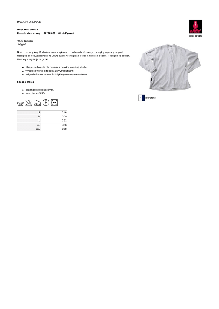 MASCOT® ORIGINALS MASCOT® Buffalo Koszula dla murarzy | 00702-022 | 61 biel/granat 100% bawełna 190 g/m² Długi, obszerny krój. Podwójne szwy w rękawach i po bokach. Kołnierzyk ze stójką, zapinany na guzik. Rozcięcie pod szyją zapinane na ukryte guziki. Wewnętrzna kieszeń. Fałda na plecach. Rozcięcia po bokach. Mankiety z regulacją na guziki. l Klasyczna koszula dla murarzy z bawełny wysokiej jakości l Wysoki kołnierz i rozcięcie z ukrytymi guzikami l Indywidualne dopasowanie dzięki regulowanym mankietom Sposób prania: l Tkanina o splocie skośnym. l Kurczliwość 3-5%. biel/granat S C 46 M C 50 L C 52 XL C 56 2XL C 58