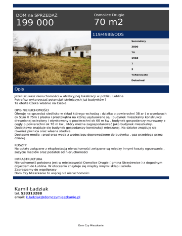Osmolice Drugie DOM na SPRZEDAŻ 70 m2 199 000 119/4988/ODS Secondary 3800 70 1960 1 3 ToRenovate Detached Opis Jeżeli szukasz nieruchomości w atrakcyjnej lokalizacji w pobliżu Lublina Potrafisz wykorzystać potencjał istniejących już budynków ? Ta oferta Czeka właśnie na Ciebie OPIS NIERUCHOMOŚCI Oferuję na sprzedaż siedlisko w skład którego wchodzą : działka o powierzchni 38 ar ( o wymiarach ok 51m X 75m ) płaska i prostokątna na której usytuowane są : budynek mieszkalny konstrukcji drewnianej ocieplony i otynkowany o powierzchni ok 60 m kw , budynek gospodarczy murowany z cegły o powierzchni ok 70 m kw , który można zagospodarować jako budynek mieszkalny. Dodatkowo znajduje się budynek gospodarczy konstrukcji mieszanej. Na działce znajduję się również piwnica oraz własna studnia. Dostępne media : prąd oraz woda z wodociągu doprowadzone do budynku , gaz przebiega przez działkę . KOSZTY Na opłaty związane z eksploatacją nieruchomości związane są między innymi koszty ogrzewania , zużycie mediów oraz podatek od nieruchomości INFRASTRUKTURA Nieruchomość położona jest w miejscowości Osmolice Drugie ( gmina Strzyżewice ) z dogodnym dojazdem do Lublina. W otoczeniu znajduje się między innymi sklep i szkoła. Zapraszamy do współpracy Dom Czy Mieszkanie to więcej niż nieruchomości Kamil Ładziak tel. 533313288 email: [email protected] Dom Czy Mieszkanie Powered by TCPDF (www.tcpdf.org)