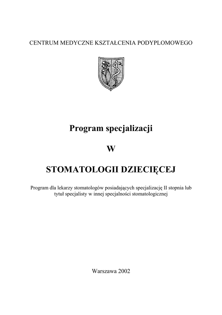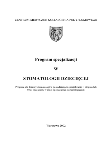 CENTRUM MEDYCZNE KSZTAŁCENIA PODYPLOMOWEGO Program specjalizacji W STOMATOLOGII DZIECIĘCEJ Program dla lekarzy stomatologów posiadających specjalizację II stopnia lub tytuł specjalisty w innej specjalności stomatologicznej Warszawa 2002 Program specjalizacji w stomatologii dziecięcej dla lekarzy stomatologów posiadających specjalizację II stopnia lub tytuł specjalisty w innej specjalności stomatologicznej Program specjalizacji przygotował zespół ekspertów Prof. dr hab. Barbara Adamowicz-Klepalska – konsultant krajowy Prof. dr hab. Maria Mielnik-Błaszczak – przedstawiciel konsultanta krajowego Prof. dr hab. Magdalena Wochna-Sobańska – przedstawiciel Polskiego Towarzystwa Stomatologicznego Prof. dr hab. Krystyna Dobies – przedstawiciel CMKP Lek. stom. Małgorzata Karczmarska-Banasiak – przedstawiciel NRL 1 – Cele studiów specjalizacyjnych Cele edukacyjne Studia specjalizacyjne mają na celu poszerzenie wiedzy teoretycznej i uzyskanie, bądź udoskonalenie przez lekarzy stomatologów umiejętności praktycznych na poziomie umożliwiającym realizowanie zadań profilaktycznych, diagnostycznych, leczniczych i rehabilitacyjnych, zgodnie z najwyższymi standardami współczesnej pedodoncji. Głównym celem kształcenia jest opanowanie przez studiującego wysokospecjalistycznej wiedzy w zakresie stomatologii wieku rozwojowego, ze szczególnym uwzględnieniem zintegrowanej opieki stomatologicznej nad dziećmi i młodzieżą, a także praktycznej umiejętności jej zastosowania w złożonych przypadkach klinicznych. Założenia programu obejmują kształtowanie postaw etycznych specjalizującego się lekarza stomatologa w stosunku do pacjentów w wieku rozwojowym, ich rodziców i opiekunów oraz współpracowników, a także ustawicznego poszerzania i pogłębiania nabytej wiedzy teoretycznej oraz umiejętności praktycznych, jak i wprowadzania z pełną odpowiedzialnością do praktyki zawodowej nowych osiągnięć z zakresu stomatologii wieku rozwojowego. Uzyskane kompetencje Lekarz stomatolog po ukończeniu specjalizacji i uzyskaniu tytułu specjalisty w stomatologii dziecięcej uzyska szczególne kwalifikacje umożliwające wykonywanie zawodu w dziedzinie stomatologii dziecięcej, zgodnie ze współczesną wiedzą medyczną i uprawniające do: planowania i organizowania kompleksowej opieki stomatologicznej dla dzieci i młodzieży z uwzględnieniem grup dyspanseryjnych oraz pacjentów specjalnej troski; monitorowania stanu zdrowia jamy ustnej wraz z oceną skuteczności systemu opieki stomatologicznej; promowania zdrowia jamy ustnej poprzez edukację prozdrowotną i działania profilaktyczne obejmujące przyszłe matki, kobiety ciężarne, matki, dzieci i młodzież; a także oceny zmian fizjologicznych i patologicznych oraz wad rozwojowych, profilaktyki, leczenia i rehabilitacji w różnych jednostkach chorobowych, diagnozowanych w okresie rozwoju i dojrzewania narządu żucia. Kompetencje specjalisty obejmują również stosowanie technik psychologicznych w procesie adaptacji dziecka do leczenia stomatologicznego. orzekania o potrzebie rehabilitacji leczniczej oraz niepełnosprawności z powodu rozpoznanych i leczonych chorób, przygotowywania opinii, zaświadczeń i wniosków dotyczących leczonych chorych, udzielania konsultacji lekarskich w dziedzinie stomatologii dziecięcej lekarzom innych specjalności, Uzyskanie tytułu specjalisty w dziedzinie stomatologii dziecięcej uprawnia do prowadzenia indywidualnej praktyki specjalistycznej lub udzielania świadczeń zdrowotnych w ramach grupowej praktyki lekarskiej oraz wykonywania wysokospecjalistycznych świadczeń profilaktycznych, leczniczych i rehabilitacyjnych, realizacji umów kontraktowych oraz do © CMKP 2002 2 Program specjalizacji w stomatologii dziecięcej dla lekarzy stomatologów posiadających specjalizację II stopnia lub tytuł specjalisty w innej specjalności stomatologicznej kształcenia innego lekarza w czasie stażu podyplomowego, kierowania specjalizacją lub stażem kierunkowym w stomatologii dziecięcej innego lekarza stomatologa, zajmowania stanowisk kierowniczych w jednostkach organizacyjnych ochrony zdrowia i uczelniach medycznych (kierowania kliniką, oddziałem lub przychodnią. 2 - Wymagana wiedza Oczekuje się, że po zakończeniu specjalizacji lekarz stomatolog wykaże się niżej przedstawioną wiedzą. • Genetyczne i środowiskowe uwarunkowania rozwoju dziecka oraz ocena rozwoju fizycznego z uwzględnieniem norm. • Rozwój zęba i przyzębia (szkliwa, zębiny, miazgi, cementu, ozębnej, korony, korzenia, fizjologicznej kieszonki dziąsłowej). • Fizjologia i patologia zmineralizowanych tkanek zęba, miazgi zębowej, przyzębia i błony śluzowej jamy ustnej. • Fizjologia i patologia kompleksu miazgowo-zębinowego. • Rola śliny w fizjologii i patologii jamy ustnej-skład, funkcje, testy ślinowe. • Psychologia rozwojowa dziecka z uwzględnieniem adaptacji dziecka do leczenia w gabinecie stomatologicznym. • Nowoczesna i bezpieczna kontrola bólu i lęku przed leczeniem stomatologicznym wybór właściwych metod postępowania z dzieckiem. • Opieka stomatologiczna nad upośledzonymi dziećmi i młodzieżą oraz pacjentami trudnymi - psychoterapia, farmakoterapia, anestezja - płytka sedacja, zabiegi z użyciem podtlenku azotu, znieczulenia ogólnego. • Postępowanie w ostrych stanach zagrożenia życia dziecka. • Zasady postępowania resuscytacyjnego. • Współczesne poglądy na rozwój części twarzowej czaszki ze szczególnym uwzględnieniem rozwoju narządu żucia. • Normy oraz odchylenia od norm rozwojowych w obrębie części twarzowej czaszki, ze szczególnym uwzględnieniem uzębienia i funkcji narządu żucia. • Współczesne metody kompleksowej profilaktyki stomatologicznej chorób i wad narządu żucia, wraz z uwzględnieniem następstw braków w uzębieniu. • Żywienie dziecka w aspekcie profilaktyki próchnicy zębów oraz chorób przyzęb