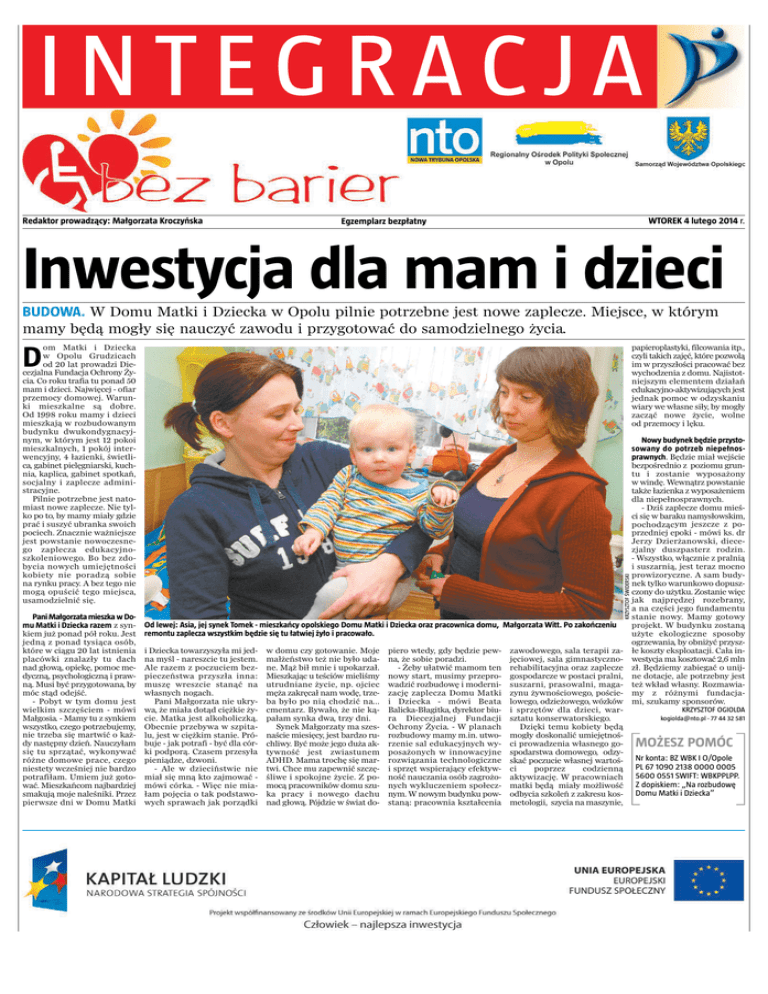 INTEGRACJA Redaktor prowadzący: Małgorzata Kroczyńska WTOREK 4 lutego 2014 r. Egzemplarz bezpłatny Inwestycja dla mam i dzieci BUDOWA. W Domu Matki i Dziecka w Opolu pilnie potrzebne jest nowe zaplecze. Miejsce, w którym mamy będą mogły się nauczyć zawodu i przygotować do samodzielnego życia. om Matki i Dziecka w Opolu Grudzicach od 20 lat prowadzi Diecezjalna Fundacja Ochrony Życia. Co roku trafia tu ponad 50 mam i dzieci. Najwięcej - ofiar przemocy domowej. Warunki mieszkalne są dobre. Od 1998 roku mamy i dzieci mieszkają w rozbudowanym budynku dwukondygnacyjnym, w którym jest 12 pokoi mieszkalnych, 1 pokój interwencyjny, 4 łazienki, świetlica, gabinet pielęgniarski, kuchnia, kaplica, gabinet spotkań, socjalny i zaplecze administracyjne. Pilnie potrzebne jest natomiast nowe zaplecze. Nie tylko po to, by mamy miały gdzie prać i suszyć ubranka swoich pociech. Znacznie ważniejsze jest powstanie nowoczesnego zaplecza edukacyjnoszkoleniowego. Bo bez zdobycia nowych umiejętności kobiety nie poradzą sobie na rynku pracy. A bez tego nie mogą opuścić tego miejsca, usamodzielnić się. papieroplastyki, filcowania itp., czyli takich zajęć, które pozwolą im w przyszłości pracować bez wychodzenia z domu. Najistotniejszym elementem działań edukacyjno-aktywizujących jest jednak pomoc w odzyskaniu wiary we własne siły, by mogły zacząć nowe życie, wolne od przemocy i lęku. Pani Małgorzata mieszka w Domu Matki i Dziecka razem z synkiem już ponad pół roku. Jest jedną z ponad tysiąca osób, które w ciągu 20 lat istnienia placówki znalazły tu dach nad głową, opiekę, pomoc medyczną, psychologiczną i prawną. Musi być przygotowana, by móc stąd odejść. - Pobyt w tym domu jest wielkim szczęściem - mówi Małgosia. - Mamy tu z synkiem wszystko, czego potrzebujemy, nie trzeba się martwić o każdy następny dzień. Nauczyłam się tu sprzątać, wykonywać różne domowe prace, czego niestety wcześniej nie bardzo potrafiłam. Umiem już gotować. Mieszkańcom najbardziej smakują moje naleśniki. Przez pierwsze dni w Domu Matki KRZYSZTOF ŚWIDERSKI D Od lewej: Asia, jej synek Tomek - mieszkańcy opolskiego Domu Matki i Dziecka oraz pracownica domu, Małgorzata Witt. Po zakończeniu remontu zaplecza wszystkim będzie się tu łatwiej żyło i pracowało. i Dziecka towarzyszyła mi jedna myśl - nareszcie tu jestem. Ale razem z poczuciem bezpieczeństwa przyszła inna: muszę wreszcie stanąć na własnych nogach. Pani Małgorzata nie ukrywa, że miała dotąd ciężkie życie. Matka jest alkoholiczką. Obecnie przebywa w szpitalu, jest w ciężkim stanie. Próbuje - jak potrafi - być dla córki podporą. Czasem przesyła pieniądze, dzwoni. - Ale w dzieciństwie nie miał się mną kto zajmować mówi córka. - Więc nie miałam pojęcia o tak podstawowych sprawach jak porządki w domu czy gotowanie. Moje małżeństwo też nie było udane. Mąż bił mnie i upokarzał. Mieszkając u teściów mieliśmy utrudniane życie, np. ojciec męża zakręcał nam wodę, trzeba było po nią chodzić na... cmentarz. Bywało, że nie kąpałam synka dwa, trzy dni. Synek Małgorzaty ma szesnaście miesięcy, jest bardzo ruchliwy. Być może jego duża aktywność jest zwiastunem ADHD. Mama trochę się martwi. Chce mu zapewnić szczęśliwe i spokojne życie. Z pomocą pracowników domu szuka pracy i nowego dachu nad głową. Pójdzie w świat do- piero wtedy, gdy będzie pewna, że sobie poradzi. - Żeby ułatwić mamom ten nowy start, musimy przeprowadzić rozbudowę i modernizację zaplecza Domu Matki i Dziecka - mówi Beata Balicka-Błagitka, dyrektor biura Diecezjalnej Fundacji Ochrony Życia. - W planach rozbudowy mamy m.in. utworzenie sal edukacyjnych wyposażonych w innowacyjne rozwiązania technologiczne i sprzęt wspierający efektywność nauczania osób zagrożonych wykluczeniem społecznym. W nowym budynku powstaną: pracownia kształcenia zawodowego, sala terapii zajęciowej, sala gimnastycznorehabilitacyjna oraz zaplecze gospodarcze w postaci pralni, suszarni, prasowalni, magazynu żywnościowego, pościelowego, odzieżowego, wózków i sprzętów dla dzieci, warsztatu konserwatorskiego. Dzięki temu kobiety będą mogły doskonalić umiejętności prowadzenia własnego gospodarstwa domowego, odzyskać poczucie własnej wartości poprzez codzienną aktywizację. W pracowniach matki będą miały możliwość odbycia szkoleń z zakresu kosmetologii, szycia na maszynie, Nowy budynek będzie przystosowany do potrzeb niepełnosprawnych. Będzie miał wejście bezpośrednio z poziomu gruntu i zostanie wyposażony w windę. Wewnątrz powstanie także łazienka z wyposażeniem dla niepełnosprawnych. - Dziś zaplecze domu mieści się w baraku namysłowskim, pochodzącym jeszcze z poprzedniej epoki - mówi ks. dr Jerzy Dzierżanowski, diecezjalny duszpasterz rodzin. - Wszystko, włącznie z pralnią i suszarnią, jest teraz mocno prowizoryczne. A sam budynek tylko warunkowo dopuszczony do użytku. Zostanie więc jak najprędzej rozebrany, a na części jego fundamentu stanie nowy. Mamy gotowy projekt. W budynku zostaną użyte ekologiczne sposoby ogrzewania, by obniżyć przyszłe koszty eksploatacji. Cała inwestycja ma kosztować 2,6 mln zł. Będziemy zabiegać o unijne dotacje, ale potrzebny jest też wkład własny. Rozmawiamy z różnymi fundacjami, szukamy sponsorów. KRZYSZTOF OGIOLDA [email protected] - 77 44 32 581 MOŻESZ POMÓC Nr konta: BZ WBK I O/Opole PL 67 1090 2138 0000 0005 5600 0551 SWIFT: WBKPPLPP. Z dopiskiem: „Na rozbudowę Domu Matki i Dziecka”