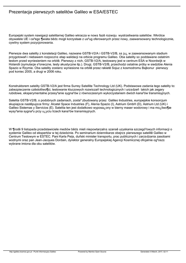Prezentacja pierwszych satelitów Galileo w ESA/ESTEC Europejski system nawigacji satelitarnej Galileo wkracza w now± fazê rozwoju wystrzeliwania satelitów. Wkrótce obywatele UE i ca³ego ¶wiata bêd± mogli korzystaæ z us³ug oferowanych przez nowy, zaawansowany technologicznie, cywilny system pozycjonowania. Pierwsze dwa satelity z konstelacji Galileo, nazwane GSTB-V2/A i GSTB-V2/B, s± ju¿ w zaawansowanym stadium przygotowañ i niebawem rozpoczn± etap walidacji na orbicie programu Galileo. Oba satelity s± poddawane ostatnim testom przed wyniesieniem na orbitê. Pierwszy z nich, GSTB-V2/A, testowany jest w centrum ESA w Noordwijk w Holandii (symulacje s³oneczne, testy akustyczne itp.). Drugi, GSTB-V2/B, przechodzi ostatnie próby w siedzibie Alenia Spazio w Rzymie. Oba satelity zostan± wyniesione na orbitê przez rakietê Sojuz z kosmodromu Bajkonur pierwszy pod koniec 2005, a drugi w 2006 roku. Konstruktorem satelity GSTB-V2/A jest firma Surrey Satellite Technology Ltd (UK). Podstawowe zadania tego satelity to: zabezpieczenie czêstotliwo¶ci, testowanie kluczowych rozwi±zañ technologicznych i urz±dzeñ takich jak zegary rubidowe, eksperymentalne przesy³anie sygna³ów z równoczesnym wykorzystaniem dwóch kana³ów transmisyjnych. Satelita GSTB-V2/B, o podobnych zadaniach, zosta³ zbudowany przez Galileo Industries, europejskie konsorcjum skupiaj±ce nastêpuj±ce firmy: Alcatel Space Industries (F), Alenia Spazio (I), Astrium GmbH (D), Astrium Ltd (UK) i Galileo Sistemas y Servicios (E). Satelita ten jest dodatkowo wyposa¿ony w bierny maser wodorowy i ma mo¿liwo¶æ wysy³ania sygna³u przy u¿yciu trzech kana³ów transmisyjnych. W ¶rodê 9 listopada przedstawiciele mediów bêd± mieli niepowtarzaln± szansê uzyskania szczegó³owych informacji o systemie Galileo od ekspertów w tej dziedzinie. Po seminarium dziennikarze obejrz± pierwszego satelitê Galileo w Centrum Testowym w ESTEC. Pani Karla Peijs, duñski minister transportu, prac publicznych i zarz±dzania zasobami wodnymi oraz pan Jean-Jacques Dordain, dyrektor generalny Europejskiej Agencji Kosmicznej oficjalnie og³osz± wybrane imiona dla obu satelitów. http://galileo.kosmos.gov.pl - Punkt Informacyjny Galileo Powered by Mambo Open Source Generated: 8 March, 2017, 02:11