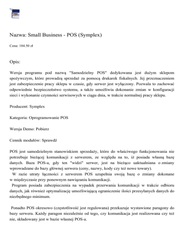Nazwa: Small Business - POS (Symplex) Cena: 184.50 zł Opis: Wersja programu pod nazwą "Samodzielny POS" dedykowana jest dużym sklepom spożywczym, które prowadzą sprzedaż za pomocą drukarek fiskalnych. Jej przeznaczeniem jest zabezpieczenie pracy sklepu w czasie, gdy serwer jest wyłączony. Pozwala to zachować odpowiednie bezpieczeństwo systemu, a także umożliwia dokonanie zmian w konfiguracji sieci i wykonanie czynności serwisowych w ciągu dnia, w trakcie normalnej pracy sklepu. Producent: Symplex Kategoria: Oprogramowanie POS Wersja Demo: Pobierz Cennik modułów: Sprawdź POS jest samodzielnym stanowiskiem sprzedaży, które do właściwego funkcjonowania nie potrzebuje bieżącej komunikacji z serwerem, ze względu na to, iż posiada własną bazę danych. Baza POS-a, gdy ten "widzi" serwer, jest na bieżąco uaktualniana o zmiany wprowadzane do bazy głównej serwera (ceny, nazwy, kody czy też nowe towary). W razie utraty łączności z serwerem POS uzupełnia swoją bazę o zmiany dokonane w międzyczasie przy ponownym nawiązaniu komunikacji. Program posiada zabezpieczenia na wypadek przerwania komunikacji w trakcie odbioru danych, jak również optymalizację umożliwiającą ograniczenie ilości przesyłanych danych do niezbędnego minimum. Ponadto POS okresowo (częstotliwość jest regulowana) przekazuje wystawione paragony do bazy serwera. Każdy paragon niezależnie od tego, czy komunikacja jest realizowana czy też nie, składowany jest w bazie własnej POS-a. Umożliwia to w razie potrzeby ponowne dosłanie paragonów, przy czym serwer odbierając po raz wtóry te same paragony sprawdza ich zgodność i zgłasza przypadki, gdyby ich wartość była inna niż pierwotnie wysłana. Ilość POS-ów pracujących z jednym serwerem praktycznie nie jest ograniczona i przy odpowiedniej wydolności serwera (w dużych marketach powstają comiesięcznie kilkusetmegabajtowe bazy) podłączyć można nawet 20 stanowisk sprzedaży jednocześnie. Możliwe jest jednoczesne używanie dwóch drukarek fiskalnych (do "zwykłej" sprzedaży oraz sprzedaży alkoholu) przy czym program sam potrafi wyłowić z paragonu i skierować odpowiednie towary na jedną lub drugą drukarkę. Do POS-a można także podłączyć wagę kalkulacyjną a także prowadzić sprzedaż z zastosowaniem kart rabatowych. Wszystkie podane ceny, są cenami netto do których należy doliczyć podatek VAT. Cennik nie stanowi oferty handlowej w rozumieniu art. 66 par.1 Kodeksu Cywilnego