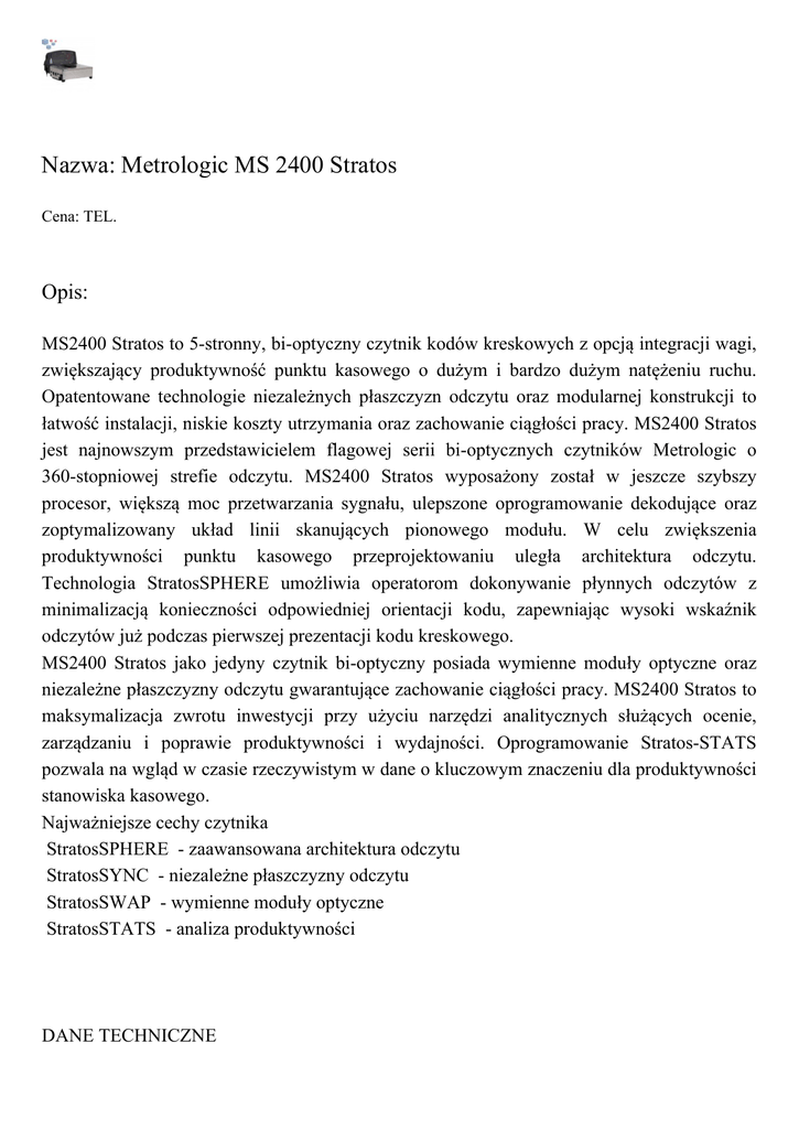 Nazwa: Metrologic MS 2400 Stratos Cena: TEL. Opis: MS2400 Stratos to 5-stronny, bi-optyczny czytnik kodów kreskowych z opcją integracji wagi, zwiększający produktywność punktu kasowego o dużym i bardzo dużym natężeniu ruchu. Opatentowane technologie niezależnych płaszczyzn odczytu oraz modularnej konstrukcji to łatwość instalacji, niskie koszty utrzymania oraz zachowanie ciągłości pracy. MS2400 Stratos jest najnowszym przedstawicielem flagowej serii bi-optycznych czytników Metrologic o 360-stopniowej strefie odczytu. MS2400 Stratos wyposażony został w jeszcze szybszy procesor, większą moc przetwarzania sygnału, ulepszone oprogramowanie dekodujące oraz zoptymalizowany układ linii skanujących pionowego modułu. W celu zwiększenia produktywności punktu kasowego przeprojektowaniu uległa architektura odczytu. Technologia StratosSPHERE umożliwia operatorom dokonywanie płynnych odczytów z minimalizacją konieczności odpowiedniej orientacji kodu, zapewniając wysoki wskaźnik odczytów już podczas pierwszej prezentacji kodu kreskowego. MS2400 Stratos jako jedyny czytnik bi-optyczny posiada wymienne moduły optyczne oraz niezależne płaszczyzny odczytu gwarantujące zachowanie ciągłości pracy. MS2400 Stratos to maksymalizacja zwrotu inwestycji przy użyciu narzędzi analitycznych służących ocenie, zarządzaniu i poprawie produktywności i wydajności. Oprogramowanie Stratos-STATS pozwala na wgląd w czasie rzeczywistym w dane o kluczowym znaczeniu dla produktywności stanowiska kasowego. Najważniejsze cechy czytnika StratosSPHERE - zaawansowana architektura odczytu StratosSYNC - niezależne płaszczyzny odczytu StratosSWAP - wymienne moduły optyczne StratosSTATS - analiza produktywności DANE TECHNICZNE NAZWA MS2400 STRATOS Rodzaj czytnika Laserowy, ladowy, Bi-optyczny Źródło światła Dioda laserowa 650 nm Odległość odczytu 0 21,6 cm (w zależności od gęstości kodu kreskowego) Rozdzielczość 5 mil Szybkość odczytu 5400 linii skanujących/s Wzór skanujący 54 linii skanujących Warunki pracy Temp. 0 40 °C, wilgotność względna 5 95 % Wymiary 230 x 292 x 353 - 399 mm (w zależności od wersji) Masa 6,80 9,97 kg. (zależne od wersji) Kabel komunikacyjny b.d. Dostępne interfejsy RS232, USB, IBM 468x/469x Inne wbudowana waga (opcjonalnie), odczyt 360°(z 5 stron), gniazdo RS232 do skanera ręcznego, Zastosowanie Handel, Wszystkie podane ceny, są cenami netto do których należy doliczyć podatek VAT. Cennik nie stanowi oferty handlowej w rozumieniu art. 66 par.1 Kodeksu Cywilnego