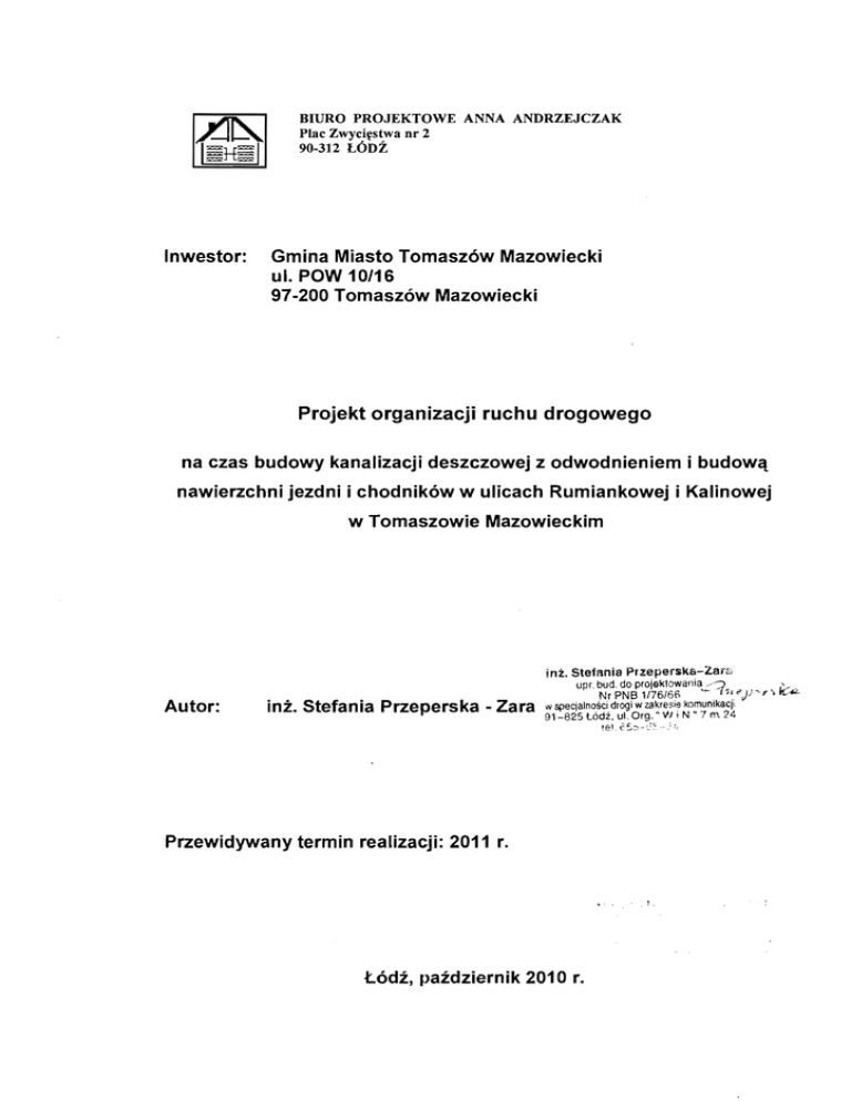 do projektu organizacji ruchu drogowego na czas budowy kanalizacji deszczowej z odwodnieniem i budowy nawierzchni jezdni i chodników w ulicach Rumiankowej i Kalinowej w Tomaszowie Mazowieckim l. Podstawa opracowania