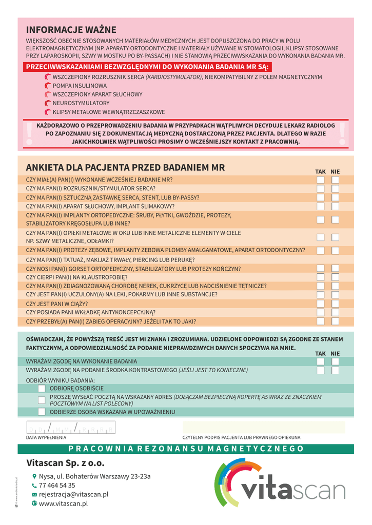 INFORMACJE WAŻNE WIĘKSZOŚĆ OBECNIE STOSOWANYCH MATERIAŁÓW MEDYCZNYCH JEST DOPUSZCZONA DO PRACY W POLU ELEKTROMAGNETYCZNYM (NP. APARATY ORTODONTYCZNE I MATERIAŁY UŻYWANE W STOMATOLOGII, KLIPSY STOSOWANE PRZY LAPAROSKOPII, SZWY W MOSTKU PO BY-PASSACH) I NIE STANOWIĄ PRZECIWWSKAZANIA DO WYKONANIA BADANIA MR. PRZECIWWSKAZANIAMI BEZWZGLĘDNYMI DO WYKONANIA BADANIA MR SĄ: WSZCZEPIONY ROZRUSZNIK SERCA (KARDIOSTYMULATOR), NIEKOMPATYBILNY Z POLEM MAGNETYCZNYM POMPA INSULINOWA WSZCZEPIONY APARAT SŁUCHOWY NEUROSTYMULATORY KLIPSY METALOWE WEWNĄTRZCZASZKOWE ! KAŻDORAZOWO O PRZEPROWADZENIU BADANIA W PRZYPADKACH WĄTPLIWYCH DECYDUJE LEKARZ RADIOLOG PO ZAPOZNANIU SIĘ Z DOKUMENTACJĄ MEDYCZNĄ DOSTARCZONĄ PRZEZ PACJENTA. DLATEGO W RAZIE JAKICHKOLWIEK WĄTPLIWOŚCI PROSIMY O WCZEŚNIEJSZY KONTAKT Z PRACOWNIĄ. ANKIETA DLA PACJENTA PRZED BADANIEM MR ! TAK NIE CZY MIAŁ(A) PAN(I) WYKONANE WCZEŚNIEJ BADANIE MR? CZY MA PAN(I) ROZRUSZNIK/STYMULATOR SERCA? CZY MA PAN(I) SZTUCZNĄ ZASTAWKĘ SERCA, STENT, LUB BY-PASSY? CZY MA PAN(I) APARAT SŁUCHOWY, IMPLANT ŚLIMAKOWY? CZY MA PAN(I) IMPLANTY ORTOPEDYCZNE: ŚRUBY, PŁYTKI, GWOŹDZIE, PROTEZY, STABILIZATORY KRĘGOSŁUPA LUB INNE? CZY MA PAN(I) OPIŁKI METALOWE W OKU LUB INNE METALICZNE ELEMENTY W CIELE NP. SZWY METALICZNE, ODŁAMKI? CZY MA PAN(I) PROTEZY ZĘBOWE, IMPLANTY ZĘBOWA PLOMBY AMALGAMATOWE, APARAT ORTODONTYCZNY? CZY MA PAN(I) TATUAŻ, MAKIJAŻ TRWAŁY, PIERCING LUB PERUKĘ? CZY NOSI PAN(I) GORSET ORTOPEDYCZNY, STABILIZATORY LUB PROTEZY KOŃCZYN? CZY CIERPI PAN(I) NA KLAUSTROFOBIĘ? CZY MA PAN(I) ZDIAGNOZOWANĄ CHOROBĘ NEREK, CUKRZYCĘ LUB NADCIŚNIENIE TĘTNICZE? CZY JEST PAN(I) UCZULONY(A) NA LEKI, POKARMY LUB INNE SUBSTANCJE? CZY JEST PANI W CIĄŻY? CZY POSIADA PANI WKŁADKĘ ANTYKONCEPCYJNĄ? CZY PRZEBYŁ(A) PAN(I) ZABIEG OPERACYJNY? JEŻELI TAK TO JAKI? OŚWIADCZAM, ŻE POWYŻSZĄ TREŚĆ JEST MI ZNANA I ZROZUMIANA. UDZIELONE ODPOWIEDZI SĄ ZGODNE ZE STANEM FAKTYCZNYM, A ODPOWIEDZIALNOŚĆ ZA PODANIE NIEPRAWDZIWYCH DANYCH SPOCZYWA NA MNIE. TAK NIE WYRAŻAM ZGODĘ NA WYKONANIE BADANIA WYRAŻAM ZGODĘ NA PODANIE ŚRODKA KONTRASTOWEGO (JEŚLI JEST TO KONIECZNE) ODBIÓR WYNIKU BADANIA: ODBIORĘ OSOBIŚCIE PROSZĘ WYSŁAĆ POCZTĄ NA WSKAZANY ADRES (DOŁĄCZAM BEZPIECZNĄ KOPERTĘ A5 WRAZ ZE ZNACZKIEM POCZTOWYM NA LIST POLECONY) ODBIERZE OSOBA WSKAZANA W UPOWAŻNIENIU D D / M M / R R R R DATA WYPEŁNIENIA CZYTELNY PODPIS PACJENTA LUB PRAWNEGO OPIEKUNA PRACOWNIA REZONANSU MAGNETYCZNEGO © www.ambientstudio.pl Vitascan Sp. z o.o. Nysa, ul. Bohaterów Warszawy 23-23a 77 464 54 35 [email protected] www.vitascan.pl