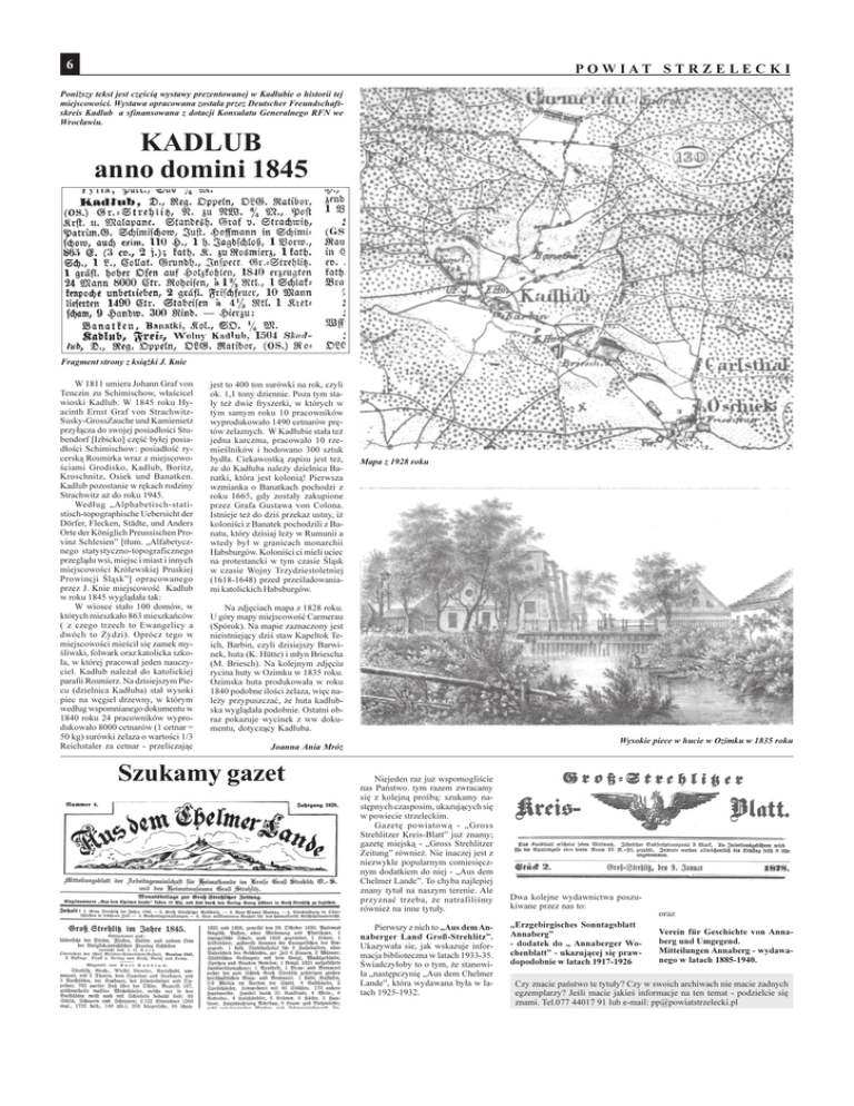 6 POWIAT STR Z E LE C K I Poni¿szy tekst jest czêci¹ wystawy prezentowanej w Kad³ubie o historii tej miejscowoci. Wystawa opracowana zosta³a przez Deutscher Freundschaftskreis Kadlub a sfinansowana z dotacji Konsulatu Generalnego RFN we Wroc³awiu. KADLUB anno domini 1845 Fragment strony z ksi¹¿ki J. Knie W 1811 umiera Johann Graf von Tenczin zu Schimischow, w³acicel wioski Kadlub. W 1845 roku Hyacinth Ernst Graf von StrachwitzSusky-GrossZauche und Kamienietz przy³¹cza do swojej posiad³oci Stubendorf [Izbicko] czêæ by³ej posiad³oci Schimischow: posiad³oæ rycersk¹ Rosmirka wraz z miejscowociami Grodisko, Kadlub, Boritz, Kroschnitz, Osiek und Banatken. Kadlub pozostanie w rêkach rodziny Strachwitz a¿ do roku 1945. Wed³ug Alphabetisch-statistisch-topographische Uebersicht der Dörfer, Flecken, Städte, und Anders Orte der Königlich Preussischen Provinz Schlesien [t³um. Alfabetycznego statystyczno-topograficznego przegl¹du wsi, miejsc i miast i innych miejscowoci Królewskiej Pruskiej Prowincji l¹sk] opracowanego przez J. Knie miejscowoæ Kadlub w roku 1845 wygl¹da³a tak: W wiosce sta³o 100 domów, w których mieszka³o 863 mieszkañców ( z czego trzech to Ewangelicy a dwóch to ¯ydzi). Oprócz tego w miejscowoci mieci³ siê zamek myliwski, folwark oraz katolicka szko³a, w której pracowa³ jeden nauczyciel. Kad³ub nale¿a³ do katolickiej parafii Rosmierz. Na dzisiejszym Piecu (dzielnica Kad³uba) sta³ wysoki piec na wêgiel drzewny, w którym wed³ug wspomnianego dokumentu w 1840 roku 24 pracowników wyprodukowa³o 8000 cetnarów (1 cetnar = 50 kg) surówki ¿elaza o wartoci 1/3 Reichstaler za cetnar - przeliczaj¹c jest to 400 ton surówki na rok, czyli ok. 1,1 tony dziennie. Poza tym sta³y te¿ dwie fryszerki, w których w tym samym roku 10 pracowników wyprodukowa³o 1490 cetnarów prêtów ¿elaznych. W Kad³ubie sta³a te¿ jedna karczma, pracowa³o 10 rzemielników i hodowano 300 sztuk byd³a. Ciekawostk¹ zapisu jest te¿, ¿e do Kad³uba nale¿y dzielnica Banatki, która jest koloni¹! Pierwsza wzmianka o Banatkach pochodzi z roku 1665, gdy zosta³y zakupione przez Grafa Gustawa von Colona. Istnieje te¿ do dzi przekaz ustny, i¿ kolonici z Banatek pochodzili z Banatu, który dzisiaj le¿y w Rumunii a wtedy by³ w granicach monarchii Habsburgów. Kolonici ci mieli uciec na protestancki w tym czasie l¹sk w czasie Wojny Trzydziestoletniej (1618-1648) przed przeladowaniami katolickich Habsburgów. Mapa z 1928 roku Na zdjêciach mapa z 1828 roku. U góry mapy miejscowoæ Carmerau (Spórok). Na mapie zaznaczony jest nieistniej¹cy dzi staw Kapeltok Teich, Barbin, czyli dzisiejszy Barwinek, huta (K. Hütte) i m³yn Briescha (M. Briesch). Na kolejnym zdjêciu rycina huty w Ozimku w 1835 roku. Ozimska huta produkowa³a w roku 1840 podobne iloci ¿elaza, wiêc nale¿y przypuszczaæ, ¿e huta kad³ubska wygl¹da³a podobnie. Ostatni obraz pokazuje wycinek z ww dokumentu, dotycz¹cy Kad³uba. Wysokie piece w hucie w Ozimku w 1835 roku Joanna Ania Mróz Szukamy gazet Niejeden raz ju¿ wspomoglicie nas Pañstwo. tym razem zwracamy siê z kolejn¹ prob¹: szukamy nastêpnych czasposim, ukazuj¹cych siê w powiecie strzeleckim. Gazetê powiatow¹ - Gross Strehlitzer Kreis-Blatt ju¿ znamy; gazetê miejsk¹ - Gross Strehlitzer Zeitung równie¿. Nie inaczej jest z niezwykle popularnym comiesiêcznym dodatkiem do niej - Aus dem Chelmer Lande. To chyba najlepiej znany tytu³ na naszym terenie. Ale przyznaæ trzeba, ¿e natrafilimy równie¿ na inne tytu³y. Pierwszy z nich to Aus dem Annaberger Land Groß-Strehlitz. Ukazywa³a sie, jak wskazuje informacja biblioteczna w latach 1933-35. wiadczy³oby to o tym, ¿e stanowi³a nastêpczyniê Aus dem Chelmer Lande, która wydawana by³a w latach 1925-1932. Dwa kolejne wydawnictwa poszukiwane przez nas to: Erzgebirgisches Sonntagsblatt Annaberg - dodatek do Annaberger Wochenblatt - ukazuj¹cej siê prawdopodobnie w latach 1917-1926 oraz Verein für Geschichte von Annaberg und Umgegend. Mitteilungen Annaberg - wydawanego w latach 1885-1940. Czy znacie pañstwo te tytu³y? Czy w swoich archiwach nie macie ¿adnych egzemplarzy? Jeli macie jakie informacje na ten temat - podzielcie siê znami. Tel.077 44017 91 lub e-mail: [email protected]