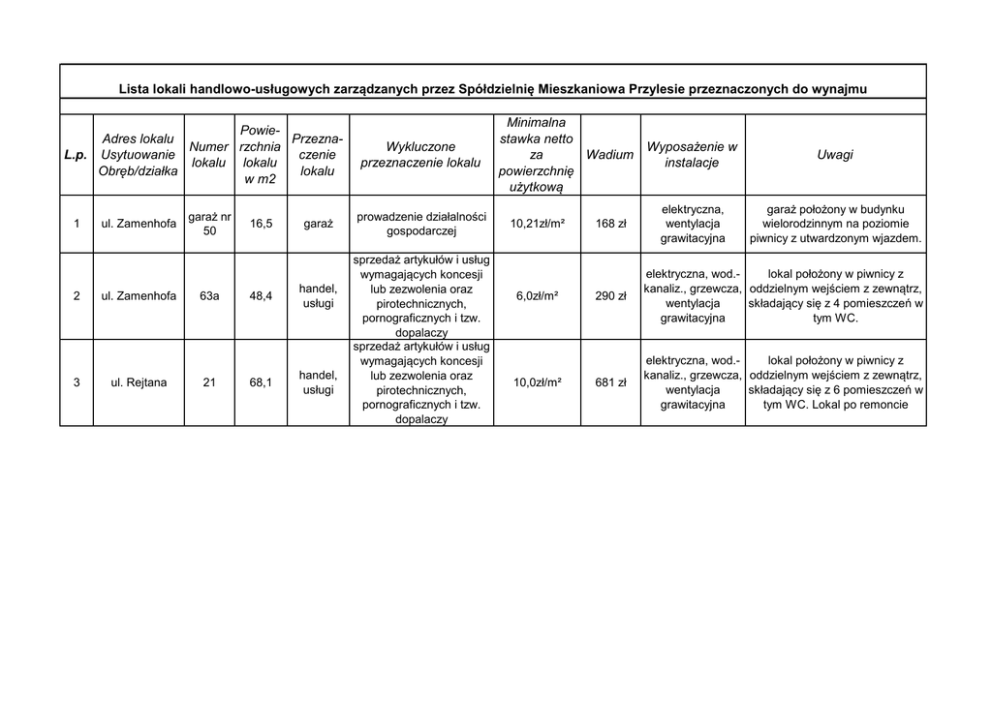 Lista lokali handlowo-usługowych zarządzanych przez Spółdzielnię Mieszkaniowa Przylesie przeznaczonych do wynajmu PowieAdres lokalu PrzeznaNumer rzchnia czenie L.p. Usytuowanie lokalu lokalu Obręb/działka lokalu w m2 1 2 3 ul. Zamenhofa ul. Zamenhofa ul. Rejtana garaż nr 50 63a 21 16,5 garaż 48,4 handel, usługi 68,1 handel, usługi Wykluczone przeznaczenie lokalu prowadzenie działalności gospodarczej sprzedaż artykułów i usług wymagających koncesji lub zezwolenia oraz pirotechnicznych, pornograficznych i tzw. dopalaczy sprzedaż artykułów i usług wymagających koncesji lub zezwolenia oraz pirotechnicznych, pornograficznych i tzw. dopalaczy Minimalna stawka netto Wyposażenie w za Wadium instalacje powierzchnię użytkową 10,21zł/m² 6,0zł/m² 10,0zł/m² 168 zł elektryczna, wentylacja grawitacyjna Uwagi garaż położony w budynku wielorodzinnym na poziomie piwnicy z utwardzonym wjazdem. 290 zł elektryczna, wod.lokal położony w piwnicy z kanaliz., grzewcza, oddzielnym wejściem z zewnątrz, wentylacja składający się z 4 pomieszczeń w grawitacyjna tym WC. 681 zł elektryczna, wod.lokal położony w piwnicy z kanaliz., grzewcza, oddzielnym wejściem z zewnątrz, wentylacja składający się z 6 pomieszczeń w grawitacyjna tym WC. Lokal po remoncie