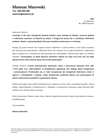 Mateusz Matewski Tel.: 606 000 000 [email protected] ABC ul. Jakaś tam 00 - 000 Warszawa Szanowni Państwo, concierge to dla mnie umiejętność dawania ludziom czasu, którego im brakuje i poczucia spokoju o wykonanie czynności, na których im zależy. Z drugiej zaś strony jest to nieustanne budowanie zaufania i dbanie o najwyższą jakość, która jest warunkiem koniecznym w tej branży. Starając się przed ostatnie lata wspierać starsze rodzeństwo, wykonywałem za nich takie czynności jak: serwisowanie samochodów, odbieranie dzieci lub wożenie ich na zajęcia dodatkowe, załatwianie spraw urzędowych, wyszukiwanie ofert sprzedaży np. samochodów, dokonywanie opłat czy robienie zakupów. Zrozumiałem, że każda aktywna zawodowo rodzina nie tylko ceni swój czas, ale także docenia serwis, który pozwoli im go choć trochę zaoszczędzić. Oferuję Państwu 3-letnie doświadczenie budowania relacji z kluczowymi klientami firm ABC i XYZ, gdzie m.in. odpowiadałem za kompleksową organizację oraz obsługę imprez integracyjno - motywacyjnych. Przekonałem się, że takie kompetencje jak umiejętność budowania relacji w oparciu o wiarygodność i zaufanie, trafna interpretacja oczekiwań klienta oraz przywiązanie do jakości realizowanych projektów są gwarantem sukcesu. Jestem postrzegany jako osoba komunikatywna i odporna na stres, łatwo nawiązuję kontakty, jestem lojalny, odpowiedzialny i konsekwentny w działaniu, a swoją pracę wykonuję z pasją. Stawiam sobie ambitne cele i bardzo lubię wyzwania. Jeżeli zainteresuje Państwa moja oferta, chętnie dopełnię prezentacji mojej osoby podczas rozmowy kwalifikacyjnej. Z poważaniem, Mateusz Matewski Wyrażam zgodę na przetwarzanie moich danych osobowych zawartych w mojej ofercie pracy dla potrzeb niezbędnych do realizacji procesu rekrutacji (zgodnie z Ustawą z dnia 29.08.1997 roku o Ochronie Danych Osobowych; tekst jednolity: Dz. U. z 2002r. Nr 101, poz. 926 ze zmianami).