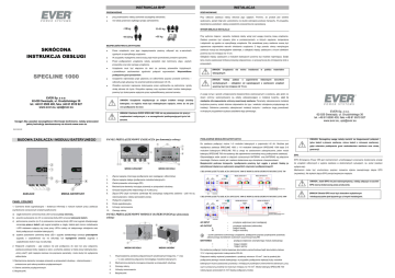 INSTRUKCJA BHP INSTALACJA PRZENOSZENIE ROZPAKOWANIE przy przenoszeniu należy zachować szczególną ostrożność; Przy odbiorze zasilacza należy dokonać jego oględzin. Pomimo, że produkt jest solidnie nie należy przenosić ciężkiego sprzętu samodzielnie. opakowany, sprzęt mógł ulec uszkodzeniu na skutek wstrząsów podczas transportu. W przypadku stwierdzenia uszkodzeń, należy powiadomić przewoźnika lub sprzedawcę. WYBÓR MIEJSCA INSTALACJI Przy wyborze miejsca i sposobu instalacji należy wziąć pod uwagę znaczną masę urządzenia. Zasilacz powinien być używany tylko w pomieszczeniach, w których zapylenie, temperatura i wilgotność są zgodne ze specyfikacją urządzenia. Dla prawidłowej pracy zasilacza muszą być SKRÓCONA INSTRUKCJA OBSŁUGI BEZPIECZEŃSTWO ELEKTRYCZNE zapewnione odpowiednie warunki chłodzenia urządzenia. Z tego powodu otwory wentylacyjne Praca urządzenia oraz jego magazynowanie powinny odbywać się w warunkach zasilacza muszą być bezwzględnie odsłonięte, a odległość między zasilaczem a innymi obiektami zgodnych ze specyfikacją urządzenia. powinna być nie mniejsza niż 15 cm. W przypadku wystąpienia zwarcia duży prąd może spowodować poważne oparzenia. Odległość między zasilaczem a modułami bateryjnymi powinna być możliwie najmniejsza. Dzięki Przed podłączeniem urządzenia należy sprawdzić stan techniczny złącz, użytych temu można zastosować krótsze przewody połączeniowe, co przyczynia się do zmniejszenia strat w przewodach. przewodów oraz stan samego urządzenia. Urządzenie musi być włączone do sieci za pomocą przewodów trzyżyłowych, z prawidłowym zachowaniem zgodności SPECLINE 1000 połączeń wyprowadzeń. UWAGA! Nieprawidłowe Urządzenia nie wolno instalować w pobliżu materiałów właściwych warunków łatwopalnych podłączenie grozi porażeniem. Urządzenie odprowadza prąd upływowy od odbiorników poprzez przewód ochronny – UWAGA! całkowity prąd upływowy nie powinien jednak przekraczać 3,5 mA. Należy zadbać o zapewnienie wentylacyjnych – odległości od sąsiadujących z zasilaczem urządzeń Wszelkie czynności naprawcze dokonywane przez użytkownika są zabronione i grożą powinny być nie mniejsze niż 15 cm. utratą zdrowia lub życia. Wszystkie naprawy oraz wymiana baterii modułu bateryjnego powinny być dokonywane wyłącznie przez wykwalifikowany personel serwisu. Z uwagi na typ i sposób umiejscowienia bezpieczników zastosowanych w zasilaczu, jako jeden ze stopni ochrony wykorzystywane są układy zabezpieczające w instalacji budynku. Jest to EVER Sp. z o.o. 62-020 Swarzędz, ul. Grudzińskiego 30 tel. +48 61 6500 400, faks +48 61 6510 927 www.ever.eu, [email protected] UWAGA! Urządzenie współpracuje ze stałym źródłem energii (moduły niezbędne dla zapewnienia ochrony zwarciowej zasilacza. Parametry zabezpieczenia instalacji bateryjne); na wyjściu może być niebezpieczne napięcie, mimo że nie jest budynków powinny zostać dobrane odpowiednio do typu i wielkości obciążenia przyłączanego do ono podłączone do sieci. instalacji. Odmienne parametry zabezpieczeń instalacji budynku i zasilacza mogą powodować UWAGA! Zasilacze EVER SPECLINE 1000 nie są przeznaczone do pracy z w skrajnych przypadkach szybsze zadziałania tego pierwszego. EVER Sp. z o.o. 62-020 Swarzędz, ul. Grudzińskiego 30 tel. +48 61 6500 400, faks +48 61 6510 927 www.ever.eu, [email protected] urządzeniami medycznymi, a w szczególności podtrzymującymi życie lub zdrowie. Uwaga! Aby uzyskać szczegółowe informacje techniczne, należy przeczytać pełną instrukcję zamieszczoną na stronie www.ever.eu 2012/03/02 BUDOWA ZASILACZA I MODUŁU BATERYJNEGO PANEL PRZYŁĄCZENIOWY ZASILACZA (po demontażu osłony) PODŁACZENIE MODUŁÓW BATERYJNYCH UWAGA! Szczególną uwagę należy zwrócić na biegunowość połączeń Do zasilacza podłączyć można 1÷5 modułów bateryjnych o pojemności 42 Ah. Możliwa jest (plus baterii z plusem zasilacza, minus baterii z minusem zasilacza), gdyż odwrotne podłączenie grozi uszkodzeniem zasilacza oraz utratą współpraca zasilacza SPECLINE 1000 z 1÷5 modułami bateryjnymi SPECLINE 1000 bądź 2÷5 gwarancji. modułami bateryjnymi SPECLINE 700 (z uwagi na zastosowane zabezpieczenia, jeden moduł bateryjny SPECLINE 700 nie wystarczy dla zapewnienia nominalnej mocy podtrzymania zasilacza). Odpowiadające sobie zaciski w złączach oznaczonych BATERIA1 oraz BATERIA2 są połączone WIDOK CZOŁOWY WIDOK OD DOŁU równolegle. Zarówno moduł, jak i zasilacz dostarczane są w komplecie z bezpiecznikami. EPO (Emergency Power Off) jest mechanizmem umożliwiającym przerwanie dostarczania energii Bezpieczniki podczas transportu i podłączania powinny być wyjęte z gniazd. Należy je do urządzeń odbiorczych z wyjścia zasilacza w ekstremalnych sytuacjach, np. pożar (zasilacz zainstalować dopiero po wykonaniu wszystkich czynności podłączeniowych! wyłącza się). UKŁAD POŁĄCZEŃ ZASILACZA SPECLINE 1000 Z MODUŁAMI BATERYJNYMI SPECLINE 700 ZASILACZ MODUŁ BATERYJNY 1. Złącza napięcia zmiennego (podłączenie sieci zasilającej i odbiorników). 2. Złącza napięcia stałego (podłączenie modułów bateryjnych). 3. Zacisk przewodu ochronnego (PE). 4. Mechaniczne elementy mocujące przewody w przepustach obudowy. 5. Gniazdo bezpiecznika wejściowego (5 A zwłoczny). 6. Złącze EPO (styki normalnie zamknięte NZ awaryjnego wyłącznika zasilania – jeśli nie są PANEL CZOŁOWY 7. Wyłącznik urządzenia. 8. Dioda sygnalizacyjna. 1. Czerwona dioda sygnalizacyjna – dostarcza informacji o różnych trybach pracy zasilacza 9. Uchwyty zamocowania. (symbolicznie oznaczonych znakami graficznymi): 10. Zaczepy osłony. a) ciągłe świecenie czerwonej diody LED oznacza pracę sieciową, b) powolne pulsowanie (co 2,5 s) czerwonej diody LED oznacza ładowanie baterii, c) jednoczesne powolne (co 5 s) pulsowanie czerwonej diody LED or
