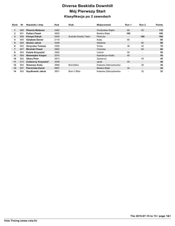 Diverse Beskidia Downhill Mój Pierwszy Start Klasyfikacja po 2 zawodach Rank Nr Nazwisko i Imię Kod 1 2 3 4 5 6 7 8 9 10 11 12 13 14 808 801 808 805 809 802 807 804 809 802 810 804 807 803 Plewnia Mateusz Pytlarz Paweł Kempa Patryk Oziębała Daniel Skubis Jakub Goryczka Tomasz Miciński Paweł Kotela Krzysztof Balawejder Kasjan Obara Piotr Zadworny Krzysztof Stawowy Kuba Pierzchała Kamil Szydłowski Jakub 3462 3605 2540 2116 3048 3365 3662 3582 3570 3673 3549 3666 9997 3651 Vola Timing (www.vola.fr) Klub Suicide Gravity Team Born2bike Born 2 Bike Miejscowość Wodzisław Sląski Bielsko-Biała Płońców Kalej Sławków Wisła Chorzów Ustroń Kędzierzyn-Koźle Zawiercie opole Kalwaria Zebrzydowska Bielsko-Biała Kalwaria Zebrzydowska Run 1 Run 2 60 100 80 36 50 45 40 32 - 50 100 80 40 60 45 36 32 Points 110 100 100 80 80 76 60 50 45 45 40 36 32 32 The 2015-07-15 to 15 / page 1&1 VolaSoftControlPdf