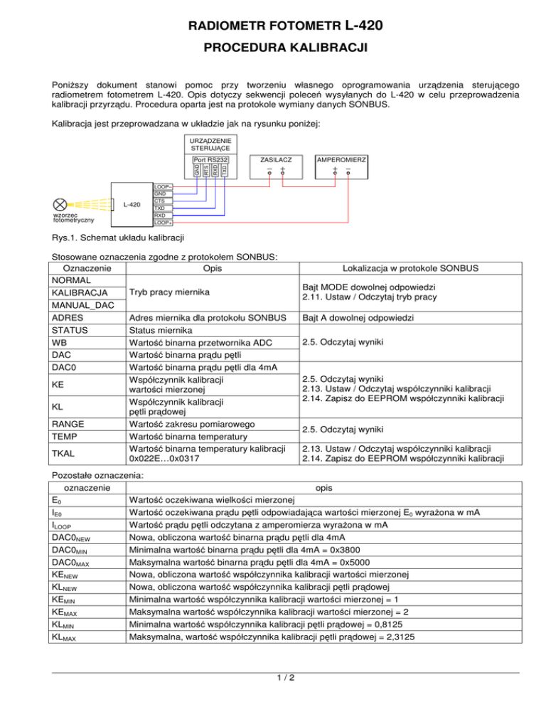 RADIOMETR FOTOMETR L-420 PROCEDURA KALIBRACJI Poniższy dokument stanowi pomoc przy tworzeniu własnego oprogramowania urządzenia sterującego radiometrem fotometrem L-420. Opis dotyczy sekwencji poleceń wysyłanych do L-420 w celu przeprowadzenia kalibracji przyrządu. Procedura oparta jest na protokole wymiany danych SONBUS. Kalibracja jest przeprowadzana w układzie jak na rysunku poniżej: URZĄDZENIE STERUJĄCE L-420 wzorzec fotometryczny ZASILACZ AMPEROMIERZ TXD RXD RTS GND Port RS232 LOOP– GND CTS TXD RXD LOOP+ Rys.1. Schemat układu kalibracji Stosowane oznaczenia zgodne z protokołem SONBUS: Oznaczenie Opis NORMAL Tryb pracy miernika KALIBRACJA MANUAL_DAC ADRES Adres miernika dla protokołu SONBUS STATUS Status miernika WB Wartość binarna przetwornika ADC DAC Wartość binarna prądu pętli DAC0 Wartość binarna prądu pętli dla 4mA Współczynnik kalibracji KE wartości mierzonej Współczynnik kalibracji KL pętli prądowej RANGE Wartość zakresu pomiarowego TEMP Wartość binarna temperatury Wartość binarna temperatury kalibracji TKAL 0x022E…0x0317 Lokalizacja w protokole SONBUS Bajt MODE dowolnej odpowiedzi 2.11. Ustaw / Odczytaj tryb pracy Bajt A dowolnej odpowiedzi 2.5. Odczytaj wyniki 2.5. Odczytaj wyniki 2.13. Ustaw / Odczytaj współczynniki kalibracji 2.14. Zapisz do EEPROM współczynniki kalibracji 2.5. Odczytaj wyniki 2.13. Ustaw / Odczytaj współczynniki kalibracji 2.14. Zapisz do EEPROM współczynniki kalibracji Pozostałe oznaczenia: oznaczenie opis E0 Wartość oczekiwana wielkości mierzonej IE0 Wartość oczekiwana prądu pętli odpowiadająca wartości mierzonej E0 wyrażona w mA ILOOP Wartość prądu pętli odczytana z amperomierza wyrażona w mA DAC0NEW Nowa, obliczona wartość binarna prądu pętli dla 4mA DAC0MIN Minimalna wartość binarna prądu pętli dla 4mA = 0x3800 DAC0MAX Maksymalna wartość binarna prądu pętli dla 4mA = 0x5000 KENEW Nowa, obliczona wartość współczynnika kalibracji wartości mierzonej KLNEW Nowa, obliczona wartość współczynnika kalibracji pętli prądowej KEMIN Minimalna wartość współczynnika kalibracji wartości mierzonej = 1 KEMAX Maksymalna wartość współczynnika kalibracji wartości mierzonej = 2 KLMIN Minimalna wartość współczynnika kalibracji pętli prądowej = 0,8125 KLMAX Maksymalna, wartość współczynnika kalibracji pętli prądowej = 2,3125 1/2 PROCEDURA I. PRZYGOTOWANIE PRZYRZĄDU 1. 2. 2. 3. 4. Zestawić układ pomiarowy zgodnie z Rys.1. Przełącznik kodujący miernika ustawić w położenie SONBUS oraz LOOPON. . Ustawić właściwy zakres pomiarowy miernika (kod polecenia 0x05). Wyzerować system pomiarowy miernika (kod polecenia 0x09). Wyzerować detektor miernika (kod polecenia 0x08) – tylko jeśli przyrząd nie wskazuje zera przy zasłoniętym detektorze. II. USTAWIENIE PRĄDU PĘTLI 4mA 1. Ustawić tryb pracy miernika: KALIBRACJA + MANUAL_DAC (kod polecenia 0x0A). UWAGA: Jeżeli miernik pracujący w trybie KALIBRACJA i/lub MANUAL_DAC przez 5 sekund nie otrzyma od urządzenia sterującego poprawnej ramki, zostanie automatycznie przywrócony tryb NORMAL. Program sterujący powinien zapewnić utrzymanie ustawionego trybu pracy. 2. Odczytać z miernika: ADRES, DAC0 (kod polecenia 0x04). 3. Wysłać do miernika: ustaw DAC = DAC0 (kod polecenia 0x0B). 4. Odczytać z miernika: DAC (kod polecenia 0x0B). 5. Odczytać z amperomierza prąd pętli ILOOP. 6. Obliczyć nową wartość DAC0NEW z zależności: 4 DAC 0 NEW = DAC ⋅ I LOOP UWAGA: Jeżeli wartość DAC0NEW wykracza poza zakres DAC0MIN...DAC0MAX, kalibracji nie da się przeprowadzić. 7. Wysłać do miernika ustaw DAC = DAC0NEW (kod polecenia 0x0B). 8. Powtórzyć punkty 4 – 7 aż do uzyskania ILOOP = 4mA. III. OKREŚLENIE WSPÓŁCZYNNIKÓW KALIBRACJI 1. Ustawić tryb pracy miernika: KALIBRACJA (kod polecenia 0x0A). Patrz UWAGA z punktu II.1. 2. Wysłać do miernika: ustaw DAC0 = DAC0NEW (kod polecenia 0x0C). 3. Oświetlić pole odbioru przyrządu wzorcową wielkością mierzoną E0. 4. Odczytać z amperomierza prąd pętli ILOOP. 5. Odczytać z miernika: STATUS, WB, DAC, DAC0, KE, KL, RANGE, TEMP (kod polecenia 0x04). 6. Obliczyć wartość poprawną prądu pętli IE0: I E 0 = E0 ⋅ 20 − 4 +4 RANGE 7. Obliczyć współczynnik kalibracji KLNEW – jeżeli STATUS.3=0 i DAC>DAC0 i DAC<0x16000: KLNEW = DAC − DAC0 0 xFFFFFF I E 0 − 4 ⋅ ⋅ WB 0 x10000 I LOOP − 4 – w przeciwnym wypadku: KLNEW I E0 − 4 ⋅ 0 xFFFFFF = 20 − 4 WB UWAGA: Jeżeli wartość KLNEW wykracza poza zakres KLMIN...KLMAX, kalibracji nie da się przeprowadzić. 8. Obliczyć współczynnik kalibracji KENEW: KE NEW = 9. 10. 11. 12. 13. 14. E 0 ⋅ 0 xFFFFFF WB ⋅ RANGE UWAGA: Jeżeli wartość KENEW wykracza poza zakres KEMIN...KEMAX, kalibracji nie da się przeprowadzić. Przyjąć KL=KLNEW, KE=KENEW, TKAL=TEMP. Wysłać do miernika: ustaw współczynnik kalibracji KL (kod polecenia 0x0C). Wysłać do miernika: ustaw współczynnik kalibracji KE (kod polecenia 0x0C). Powtórzyć punkty 4 – 11 aż do uzyskania ILOOP = IE0. Wysłać do miernika: zapisz do EEPROM współczynniki kalibracji DAC0 KE KL TKAL (kod polecenia 0x0D). Ustawić tryb miernika: NORMAL (kod polecenia 0x0A). PPUH SONOPAN Sp. z o.o. ul. Ciołkowskiego 2/2 15-950 Białystok tel./fax: 85 742 36 62 http://www.sonopan.com.pl Białystok, lipiec 2011 2/2