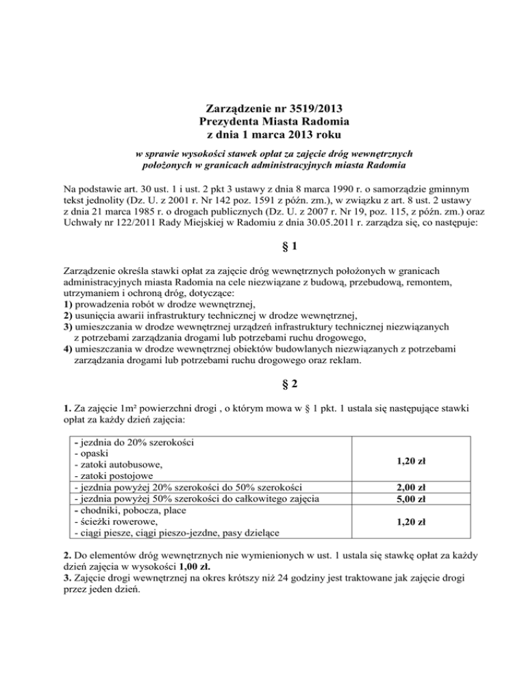 Zarządzenie nr 3519/2013 Prezydenta Miasta Radomia z dnia 1 marca 2013 roku w sprawie wysokości stawek opłat za zajęcie dróg wewnętrznych położonych w granicach administracyjnych miasta Radomia Na podstawie art. 30 ust. 1 i ust. 2 pkt 3 ustawy z dnia 8 marca 1990 r. o samorządzie gminnym tekst jednolity (Dz. U. z 2001 r. Nr 142 poz. 1591 z późn. zm.), w związku z art. 8 ust. 2 ustawy z dnia 21 marca 1985 r. o drogach publicznych (Dz. U. z 2007 r. Nr 19, poz. 115, z późn. zm.) oraz Uchwały nr 122/2011 Rady Miejskiej w Radomiu z dnia 30.05.2011 r. zarządza się, co następuje: §1 Zarządzenie określa stawki opłat za zajęcie dróg wewnętrznych położonych w granicach administracyjnych miasta Radomia na cele niezwiązane z budową, przebudową, remontem, utrzymaniem i ochroną dróg, dotyczące: 1) prowadzenia robót w drodze wewnętrznej, 2) usunięcia awarii infrastruktury technicznej w drodze wewnętrznej, 3) umieszczania w drodze wewnętrznej urządzeń infrastruktury technicznej niezwiązanych z potrzebami zarządzania drogami lub potrzebami ruchu drogowego, 4) umieszczania w drodze wewnętrznej obiektów budowlanych niezwiązanych z potrzebami zarządzania drogami lub potrzebami ruchu drogowego oraz reklam. §2 1. Za zajęcie 1m² powierzchni drogi , o którym mowa w § 1 pkt. 1 ustala się następujące stawki opłat za każdy dzień zajęcia: - jezdnia do 20% szerokości - opaski - zatoki autobusowe, - zatoki postojowe - jezdnia powyżej 20% szerokości do 50% szerokości - jezdnia powyżej 50% szerokości do całkowitego zajęcia - chodniki, pobocza, place - ścieżki rowerowe, - ciągi piesze, ciągi pieszo-jezdne, pasy dzielące 1,20 zł 2,00 zł 5,00 zł 1,20 zł 2. Do elementów dróg wewnętrznych nie wymienionych w ust. 1 ustala się stawkę opłat za każdy dzień zajęcia w wysokości 1,00 zł. 3. Zajęcie drogi wewnętrznej na okres krótszy niż 24 godziny jest traktowane jak zajęcie drogi przez jeden dzień. 4. W przypadku drogi nieurządzonej (nieposiadającej wyodrębnionych poszczególnych elementów pasa drogowego) całość powierzchni drogi mieszcząca się w granicach własności traktowana jest jako jezdnia. 5. Za zajęcie drogi o powierzchni mniejszej niż 1m² przyjmuje się stawkę opłaty jak dla 1m². 6. Do stawek opłat określonych w pkt. 1 i 2 zostanie doliczony podatek VAT w wysokości 23% według obowiązujących przepisów. §3 1. Za zajęcie drogi wewnętrznej , o którym mowa w § 1 pkt. 2 ustala się stawkę ryczałtową 30 zł za jeden dzień zajęcia drogi wewnętrznej. 2. Do stawki opłaty określonej w pkt. 1 zostanie doliczony podatek VAT w wysokości 23% według obowiązujących przepisów. §4 1. Za zajęcie drogi wewnętrznej, o którym mowa w § 1 pkt. 3 ustala się następujące roczne stawki opłat za 1m² powierzchni drogi zajętej przez rzut poziomy umieszczanego urządzenia: Kategoria Lokalizacja urządzenia drogi w poprzek drogi Drogi wewnętrzne 50,00 zł Lokalizacja urządzenia wzdłuż drogi w jezdni Lokalizacja urządzenia wzdłuż drogi poza jezdnią 25,00 zł 12,00 zł 2. Za umieszczenie urządzenia na drogowym obiekcie inżynierskim ustala się roczną stawkę opłat za 1m² powierzchni drogi wewnętrznej zajętej przez rzut poziomy umieszczanego urządzenia - w wysokości 200 zł. 3. Roczne stawki opłat w wysokości określonej w ust. 1 i 2 obejmują pełny rok kalendarzowy umieszczenia urządzenia w drodze wewnętrznej lub na drogowym obiekcie inżynierskim. Za niepełny rok kalendarzowy wysokość rocznych stawek opłat jest obliczana proporcjonalnie do liczby dni umieszczenia urządzenia w drodze wewnętrznej lub na drogowym obiekcie inżynierskim. 4. Za umieszczenie urządzenia o powierzchni mniejszej niż 1m² przyjmuje się stawkę opłaty jak dla 1m². 5. Do stawek opłat określonych w pkt. 1 i 2 zostanie doliczony podatek VAT w wysokości 23% według obowiązujących przepisów. §5 Za zajęcie drogi wewnętrznej, którym mowa w §1 pkt 4 ustala się następujące stawki opłat za każdy dzień zajęcia 1m² powierzchni: 1) Drogi wewnętrznej zajętej przez rzut poziomy obiektu budowlanego niezwiązanego z potrzebami zarządzania drogami lub potrzebami ruchu drogowego - 0,60 zł, 2) reklamy z zastrzeżeniem pkt 3 - 1,50 zł, 3) reklamy związane z informacjami o gminie, powiecie lub województwie, a w szczególności w postaci planów, map, tablic, plansz (np. witaczy) - 0,65 zł, 4) dla reklam świetlnych i podświetlanych stawkę opłaty określonej w ust. 2 podwyższa się o 30%, 5) dla reklam typu LED stawkę opłaty określonej w ust. 2 podwyższa się o 100%. Do stawek opłat określonych w pkt. 1 i 2 i 3 zostanie doliczony podatek VAT w wysokości 23% według obowiązujących przepisów. §6 1. Zajęcie drogi wewnętrznej dla celów określonych w: § 1 ust. 1, § 1 ust. 3, § 1 ust. 4, odbywa się na podstawie umowy cywilno-prawnej i na warunkach określonych w tej umowie. 2. Po podpisaniu umowy cywilno-prawnej zostanie wystawiona faktura VAT. 3. Odbiór drogi wewnętrznej dla celów określonych w § 1 ust. 2 odbywa się po sporządzeniu bezusterkowego protokołu odbioru robót, który stanowi podstawę do wystawienia faktury VAT. 4. Zajęcie drogi wewnętrznej bez zawarcia umowy cywilno-prawnej uzasadnia skierowanie sprawy na drogę postępowania sądowego. 5. Zajęcie drogi wewnętrznej w celu usunięcia awarii infrastruktury technicznej bez zgłoszenia awarii uzasadnia skierowanie sprawy na drogę postępowania sądowego. §7 1. Wniosek o zajęcie drogi wewnętrznej powinien być złożony na min 14 dni przed planowanym rozpoczęciem robót. 2. Wzory wniosków o zajęcie drogi wewnętrznej dla celów określonych w §1 ust. 1, 2, 3, 4 stanowią załączniki nr 1, 2, 3, 4 do niniejszego zarządzenia. 3. Wzór oświadczenia o posiadaniu ważnego pozwolenia na budowę lub oświadczenia o braku sprzeciwu właściwego organu administracji architektoniczno-budowlanej do zgłoszenia zamiaru