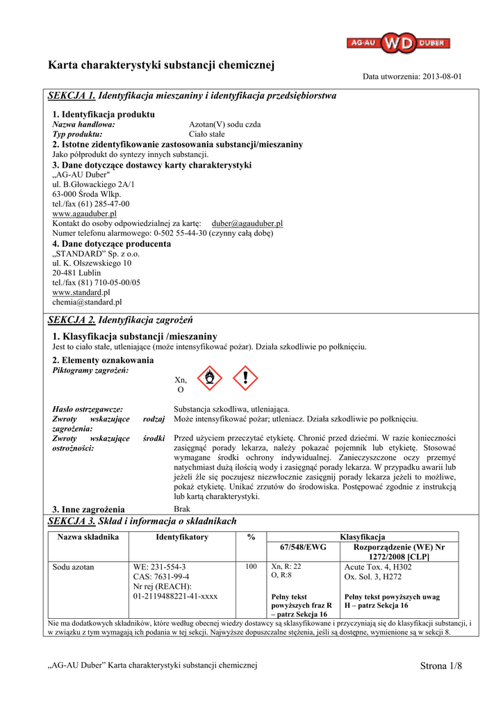 Karta charakterystyki substancji chemicznej Data utworzenia: 2013-08-01 SEKCJA 1. Identyfikacja mieszaniny i identyfikacja przedsiębiorstwa 1. Identyfikacja produktu Azotan(V) sodu czda Ciało stałe Nazwa handlowa: Typ produktu: 2. Istotne zidentyfikowanie zastosowania substancji/mieszaniny Jako półprodukt do syntezy innych substancji. 3. Dane dotyczące dostawcy karty charakterystyki „AG-AU Duber" ul. B.Głowackiego 2A/1 63-000 Środa Wlkp. tel./fax (61) 285-47-00 www.agauduber.pl Kontakt do osoby odpowiedzialnej za kartę: [email protected] Numer telefonu alarmowego: 0-502 55-44-30 (czynny całą dobę) 4. Dane dotyczące producenta „STANDARD” Sp. z o.o. ul. K. Olszewskiego 10 20-481 Lublin tel./fax (81) 710-05-00/05 www.standard.pl [email protected] SEKCJA 2. Identyfikacja zagroŜeń 1. Klasyfikacja substancji /mieszaniny Jest to ciało stałe, utleniające (moŜe intensyfikować poŜar). Działa szkodliwie po połknięciu. 2. Elementy oznakowania Piktogramy zagroŜeń: Xn, O Hasło ostrzegawcze: Zwroty wskazujące zagroŜenia: Zwroty wskazujące ostroŜności: 3. Inne zagroŜenia rodzaj środki Substancja szkodliwa, utleniająca. MoŜe intensyfikować poŜar; utleniacz. Działa szkodliwie po połknięciu. Przed uŜyciem przeczytać etykietę. Chronić przed dziećmi. W razie konieczności zasięgnąć porady lekarza, naleŜy pokazać pojemnik lub etykietę. Stosować wymagane środki ochrony indywidualnej. Zanieczyszczone oczy przemyć natychmiast duŜą ilością wody i zasięgnąć porady lekarza. W przypadku awarii lub jeŜeli źle się poczujesz niezwłocznie zasięgnij porady lekarza jeŜeli to moŜliwe, pokaŜ etykietę. Unikać zrzutów do środowiska. Postępować zgodnie z instrukcją lub kartą charakterystyki. Brak SEKCJA 3. Skład i informacja o składnikach Nazwa składnika Identyfikatory % 67/548/EWG Sodu azotan WE: 231-554-3 CAS: 7631-99-4 Nr rej (REACH): 01-2119488221-41-xxxx 100 Xn, R: 22 O, R:8 Klasyfikacja Rozporządzenie (WE) Nr 1272/2008 [CLP] Acute Tox. 4, H302 Ox. Sol. 3, H272 Pełny tekst Pełny tekst powyŜszych uwag powyŜszych fraz R H – patrz Sekcja 16 – patrz Sekcja 16 Nie ma dodatkowych składników, które według obecnej wiedzy dostawcy są sklasyfikowane i przyczyniają się do klasyfikacji substancji, i w związku z tym wymagają ich podania w tej sekcji. NajwyŜsze dopuszczalne stęŜenia, jeśli są dostępne, wymienione są w sekcji 8. „AG-AU Duber” Karta charakterystyki substancji chemicznej Strona 1/8 SEKCJA 4. Środki pierwszej pomocy 1. Opis środków pierwszej pomocy Kontakt z okiem: Wdychanie: Kontakt ze skórą: SpoŜycie: Ochrona osób udzielających pierwszą pomoc: Wypłukać duŜą ilością wody przy szeroko rozwartych powiekach przez co najmniej 10 minut, skontaktować się z okulistą. Usunąć poszkodowanego ze strefy zagroŜenia na świeŜe powietrze. Zapewnić osobie ciepło i spokój. W przypadku utraty przytomności, ułoŜyć w pozycji bocznej i wezwać lekarza. Zmyć duŜą ilością wody, zdjąć zanieczyszczone ubranie. Podać duŜą ilość wody, nie wywoływać wymiotów, wezwać lekarza. Nie naleŜy podejmować Ŝadnych działań, które stwarzałyby ryzyko dla kogokolwiek chyba, Ŝe jest się odpowiednio przeszkolonym. 2. NajwaŜniejsze ostre i opóźnione objawy oraz skutki naraŜenia Potencjalnie ostre działanie na zdrowie MoŜliwość podraŜnienia lub uszkodzenia. Kontakt z okiem: Kontakt z produktami rozkładu moŜe być niebezpieczne dla zdrowia. PowaŜne Wdychanie: działania niepoŜądane mogą być opóźnione w stosunku do czasu ekspozycji. MoŜliwe podraŜnienie skóry. Kontakt ze skórą: Działa szkodliwie po połknięciu. SpoŜycie: Objawy wynikające z nadmiernej ekspozycji Brak konkretnych danych. Kontakt z okiem: Brak konkretnych danych. Wdychanie: Brak konkretnych danych. Kontakt ze skórą: Brak konkretnych danych. SpoŜycie: 3. Wskazanie dotyczące wszelkiej natychmiastowej pomocy lekarskiej i szczególnego postępowania z poszkodowanym Informacje dla lekarza: Szczególne sposoby leczenia: W razie wdychania produktów rozkładu powstających podczas poŜaru, wystąpienie objawów moŜe być opóźnione. NaraŜona osoba moŜe wymagać nadzoru lekarskiego przez 48 godzin. Bez specjalnego leczenia. SEKCJA 5. Postępowanie w przypadku poŜaru 1. Środki gaśnicze Stosowane środki gaśnicze: Niewłaściwe środki gaśnicze: Dobrać w zaleŜności od materiałów składowanych w najbliŜszym sąsiedztwie. Nie znane. 2. Szczególne zagroŜenia związane z mieszaniną ZagroŜenia ze strony substancji/mieszaniny: Niebezpieczne produkty rozkładu termicznego: Materiał utleniający. MoŜe zintensyfikować poŜar. Produkty rozkładu mogą zawierać następujące materiały: tlenki azotu, tlenek/tlenki metalu. 3. Informacje dla strasz poŜarnej Specjalne działania ochronne dla straŜników: Specjalne wyposaŜenie ochronne dla straŜaków: Szybko izolować teren przez wyprowadzenie wszystkich osób z najbliŜszej okolicy wypadku, jeŜeli wybuchł poŜar. Nie naleŜy podejmować Ŝadnych działań, które stwarzałyby ryzyko dla kogokolwiek chyba, Ŝe jest się odpowiednio przeszkolonym. StraŜacy powinni nosić odpowiednie urządzenia ochronne oraz indywidualne aparaty oddechowe z maską zakrywającą całą twarz działająca przy dodatnim ciśnieniu. Podstawowy poziom ochrony podczas wypadków chemicznych zapewnia odzieŜ stosowana przez straŜaków (włączając hełmy, buty ochronne i rękawice), zgodnie z normą europejską EN 469. „AG-AU Duber” Karta charakterystyki substancji chemicznej Strona 2/8 SEKCJA 6. Postępowanie w przypadku niezamierzonego uwolnienia do środowiska 1. Indywidualne środki ostroŜności, wyposaŜenie ochronne i procedury w sytuacjach awaryjnych Dla personelu nie biorącego udziału w akcji ratowniczej: Dla personelu biorącego udział w akcji ratowniczej: Nie naleŜy podejmować Ŝadnych działań, które stwarzałyby ryzyko dla kogokolwiek chyba, Ŝe jest s