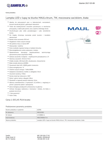 Gdańsk 2017-03-08 Karta produktu: Lampka LED z lupą na biurko MAULvitrum, 7W, mocowana zaciskiem, biała Idealna do precyzyjnych prac w laboratoriach, warsztatach, biurach konstrukcyjnych, gabinetach lekarskich Także dla kolekcjonerów znaczków pocztowych, w mechanice precyzyjnej, a także jako pomoc przy czytaniu drobnego druku Dwufunkcyjna jako szkło powiększające i jako oświetlenie biurka Ma klapkę chroniącą soczewkę przed kurzem i światłem słonecznym Bardzo duża soczewka 307cm2 Wyjątkowo niskie zużycie energii Nie pobiera mocy w stanie OFF Wytrzymała i stabilna Duża swoboda regulacji lampy w każdym kierunku Równoległoboczne ramię wykonane z metalu Opatentowana koncepcja bezpieczeństwa technicznego opracowana przez inżynierów MAUL Szklana soczewka 3 dioptrie - współczynnik powiększenia 1,75 Wymiary soczewki: 19,5x15,75cm Źródło światła: 108 diod LED, wbudowane, niewymienne Białe światło dzienne (6500K) Żywotność diod LED: 10000 godzin świecenia Klasa energetyczna: "A" Średnie zużycie energii: 7 kWh/1000h Natężenie oświetlenia: 1620lx w odległości 35cm Strumień świetlny: 470lm Ramię może być obracane o 360° Dolne i górne ramię o długości 40cm Wysokość w typowej pozycji roboczej: 42cm Głowica oświetleniowa o wymiarach 21,5x30cm, z regulacją w pionie i poziomie (obrót i odchylenie) łatwo dostępny przełącznik umieszczony na głowicy Uchwyt mocujący wykonany z tworzywa i metalu, do blatu o grubości do 6,5cm 2 lata gwarancji Kolor: biały Cena 1 053,45 PLN brutto Podstawowe parametry produktu Numer produktu w systemie 62096 Nr dostawcy M8265002 Nr Celcen 13-00802-6 Kod kreskowy 4002390061711 Nazwa produktu Lampka LED z lupą na biurko MAULvitrum, 7W, mocowana zaciskiem, biała Samfix Miałki Szlak 52 80-717 Gdańsk NIP: 583-026-77-81 REGON: 190500169 +48 (58) 305 31 60 Gdańsk 2017-03-08 Karta katalogowa produktu cd. Lampka LED z lupą na biurko MAULvitrum, 7W, mocowana zaciskiem, biała Opis Idealna do precyzyjnych prac w laboratoriach, warsztatach, biurach konstrukcyjnych, gabinetach lekarskich; także dla kolekcjonerów znaczków pocztowych, w mechanice precyzyjnej, a także jako pomoc przy czytaniu drobnego druku; dwufunkcyjna jako szkło powiększające i jako oświetlenie biurka; ma klapkę chroniącą soczewkę przed kurzem i światłem słonecznym; bardzo duża soczewka 307cm2; wyjątkowo niskie zużycie energii; nie pobiera mocy w stanie OFF; wytrzymała i stabilna; duża swoboda regulacji lampy w każdym kierunku; równoległoboczne ramię wykonane z metalu; opatentowana koncepcja bezpieczeństwa technicznego opracowana przez inżynierów MAUL; szklana soczewka 3 dioptrie - współczynnik powiększenia 1,75; wymiary soczewki: 19,5x15,75cm; źródło światła: 108 diod LED, wbudowane, niewymienne; białe światło dzienne (6500K); żywotność diod LED: 10000 godzin świecenia; klasa energetyczna: "A"; średnie zużycie energii: 7 kWh/1000h; natężenie oświetlenia: 1620lx w odległości 35cm; strumień świetlny: 470lm; ramię może być obracane o 360°; dolne i górne ramię o długości 40cm; wysokość w typowej pozycji roboczej: 42cm; głowica oświetleniowa o wymiarach 21,5x30cm, z regulacją w pionie i poziomie (obrót i odchylenie); łatwo dostępny przełącznik umieszczony na głowicy; uchwyt mocujący wykonany z tworzywa i metalu, do blatu o grubości do 6,5cm; 2 lata gwarancji; kolor: biały Kategoria Lampki Klasa Premium Marka MAUL Cecha Natężenie światła LUMEN 470 Natężenie światła LUX 1620 Cykl życia (h) 10 000 W ofercie od 2016-10 Klasa energetyczna A Rodzaj 7W Typ LED Produkt Lampka mocowana do blatu Materiał Metal/plastik Wymiary Wysokość (mm) 420 Wspólny słownik zamówień CPV 31521100-5 Certyfikaty Ilość lat gwarancji 2 Hit Standard Samfix Miałki Szlak 52 80-717 Gdańsk NIP: 583-026-77-81 REGON: 190500169 +48 (58) 305 31 60 Gdańsk 2017-03-08 Karta katalogowa produktu cd. Lampka LED z lupą na biurko MAULvitrum, 7W, mocowana zaciskiem, biała Nowy produkt w ofercie Nowość Kolor Kolor Biały Pozostałe zdjęcia produktu Serdecznie zapraszamy do współpracy Zespół Samfix. Samfix Miałki Szlak 52 80-717 Gdańsk NIP: 583-026-77-81 REGON: 190500169 +48 (58) 305 31 60