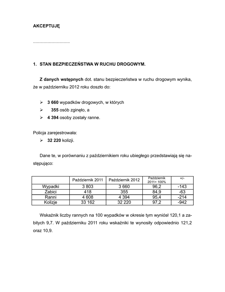 AKCEPTUJĘ ........................................ 1. STAN BEZPIECZEŃSTWA W RUCHU DROGOWYM. Z danych wstępnych dot. stanu bezpieczeństwa w ruchu drogowym wynika, że w październiku 2012 roku doszło do:  3 660 wypadków drogowych, w których  355 osób zginęło, a  4 394 osoby zostały ranne. Policja zarejestrowała:  32 220 kolizji. Dane te, w porównaniu z październikiem roku ubiegłego przedstawiają się następująco: Wypadki Zabici Ranni Kolizje Październik 2011 Październik 2012 Październik 2011= 100% +/- 3 803 418 4 608 33 162 3 660 355 4 394 32 220 96,2 84,9 95,4 97,2 -143 -63 -214 -942 Wskaźnik liczby rannych na 100 wypadków w okresie tym wyniósł 120,1 a zabitych 9,7. W październiku 2011 roku wskaźniki te wynosiły odpowiednio 121,2 oraz 10,9. STAN BEZPIECZEŃSTWA W RUCHU DROGOWYM W PAŹDZIERNIKU 2012 ROKU W UKŁADZIE WOJEWÓDZTW L.p. Województwo X’2011 278 Wypadki X’2012 365 Zabici X’2012 19 Dynamika 131,3 X’2011 15 127 105 82,7 25 170 161 94,7 Dynamika Ranni X’2012 462 Dynamika 126,7 X’2011 400 25 100,0 128 121 94,5 26 22 84,6 209 173 82,8 3. Dolnośląskie Kujawsko – pomorskie Lubelskie 4. Lubuskie 67 95 141,8 10 10 100,0 94 116 123,4 5. Łódzkie 414 371 89,6 32 24 75,0 498 452 90,8 6. 410 377 92,0 36 29 80,6 519 442 85,2 255 251 98,4 46 42 91,3 282 290 102,8 8. Małopolskie Mazowieckie (bez KSP) Opolskie 91 84 92,3 11 11 100,0 110 97 88,2 9. Podkarpackie 227 170 74,9 22 13 59,1 290 210 72,4 10. Podlaskie 88 67 76,1 16 14 87,5 103 87 84,5 11. Pomorskie 283 261 92,2 20 18 90,0 343 338 98,5 12. Śląskie 472 467 98,9 31 35 112,9 547 531 97,1 13. Świętokrzyskie Warmińsko – mazurskie Wielkopolskie 126 144 114,3 21 15 71,4 131 170 129,8 163 153 93,9 19 13 68,4 198 192 97,0 273 242 88,6 42 34 81,0 328 304 92,7 Zachodniopomorskie KSP* 142 217 115 232 81,0 106,9 19 27 17 14 89,5 51,9 174 254 130 279 74,7 109,8 3 803 3 660 96,2 418 355 84,9 4 608 4 394 95,4 1. 2. 7. 14. 15. 16. 17. Ogółem 115,5 Dane za październik 2012 roku obejmują Komendę Stołeczną Policji wraz z podległymi jej Komendami Powiatowymi Policji. Dla samego m.st. Warszawa dane są następujące: WYPADKI –129, ZABICI –4, RANNI –159. * W październiku 2012 roku, w porównaniu z rokiem ubiegłym, zanotowano spadek liczby: wypadków drogowych o 143 (-3,8%), osób zabitych o 63 (-15,1%) i osób rannych o 214 (-4,6%). Spadek liczby wypadków nastąpił w 13 województwach, największy odnotowano: w woj. podkarpackim (-25,1%) i woj. podlaskim (-23,9%). Wzrost zanotowano w 4 województwach, największy w woj. lubuskim (+41,8%) i w woj. dolnośląskim (+31,3%). Spadek liczby zabitych nastąpił w 12 województwach, największy: na terenie działania KSP (-48,1%) i w woj. podkarpackim (-40,9%). Wzrost nastąpił w 2 województwach, w woj. dolnośląskim (+26,7%) i woj. śląskim (+12,9%). Woj. kujawsko-pomorskie, lubuskie i opolskie na poziomie roku ubiegłego. Spadek liczby rannych nastąpił w 12 województwach, największy na terenie woj. podkarpackiego (-27,6%) i woj. zachodniopomorskiego (-25,3%). Wzrost miał miejsce w 5 województwach, największy w woj. świętokrzyskim (+29,8%) i w woj. lubuskim (+23,4%). OFIARY ŚMIERTELNE W PAŹDZIERNIKU 2012 ROKU. Zabici L.p. Województwo X ’2011 r. Zabici ogółem X ’2012 r. zgony zgony w zgony zgony w X ’2011 r. X ’2012 r. Wzrost/ spadek 2011= 100% n/m szpitalu n/m szpitalu 1. Dolnośląskie 12 3 13 6 15 19 4 126,7 2. Kujawsko – pomorskie 20 5 16 9 25 25 0 100,0 3. Lubelskie 19 7 15 7 26 22 -4 84,6 4. Lubuskie 9 1 7 3 10 10 0 100,0 5. Łódzkie 16 16 17 7 32 24 -8 75,0 6. 27 9 22 7 36 29 -7 80,6 40 6 38 4 46 42 -4 91,3 8. Małopolskie Mazowieckie (bez KSP) Opolskie 11 0 8 3 11 11 0 100,0 9. Podkarpackie 15 7 9 4 22 13 -9 59,1 10. Podlaskie 13 3 11 3 16 14 -2 87,5 11. Pomorskie 10 10 12 6 20 18 -2 90,0 12. Śląskie 21 10 23 12 31 35 4 112,9 13. Świętokrzyskie 13 8 14 1 21 15 -6 71,4 14. Warmińsko-mazurskie 14 5 9 4 19 13 -6 68,4 15. Wielkopolskie 30 12 28 6 42 34 -8 81,0 16. Zachodniopomorskie 17 2 13 4 19 17 -2 89,5 17. KSP 19 8 9 5 27 14 -13 51,9 306 112 264 91 418 355 - 63 84,9 7. Ogółem WYPADKI ZE SKUTKIEM ŚMIERTELNYM WE WRZEŚNIU 2012 R. Województwa Wypadki Zgony na miejscu zdarzenia Zgony w ciągu 30 dni 2011 r. 2012 r. 2011 r. 2012 r. 2011 r. 2012 r. Dolnośląskie Kujawsko – pomorskie Lubelskie Lubuskie Łódzkie Małopolskie Mazowieckie (bez KSP) Opolskie Podkarpackie Podlaskie Pomorskie Śląskie Świętokrzyskie Warmińsko – mazurskie Wielkopolskie Zachodniopomorskie KSP 22 18 14 13 10 6 23 19 21 9 4 12 26 9 33 18 22 8 28 30 24 8 21 10 21 7 15 25 7 5 12 9 5 3 13 12 41 31 33 29 12 3 7 23 9 20 22 11 10 23 10 17 24 11 4 17 8 17 14 9 6 17 8 8 18 10 3 7 3 5 8 2 4 9 2 9 7 1 8 10 8 7 2 3 41 19 20 24 13 11 39 19 15 17 8 4 13 5 9 9 5 7 Ogółem 352 309 281 222 116 110 WYPADKI DROGOWE ZE SKUTKIEM ŚMIERTELNYM WE WRZEŚNIU 2012 R.* Województwo Dolnośląskie Kujawsko – pomorskie Lubelskie Lubuskie 2011 r. 22 23 26 9 Wypadki 2012 r. Dynamika 2011 r. 18 19 22 8 81,8 82,6 84,6 88,9 24 25 31 13 Zabici 2012 r. Dynamika 19 21 26 10 79,2 84,0 83,9 76,9 Łódzkie Małopolskie Mazowieckie(bez KSP) Opolskie Podkarpackie Podlaskie Pomorskie Śląskie Świętokrzyskie Warmińsko – mazurskie Wielkopolskie Zachodniopomorskie KSP 33 18 41 7 23 9 20 22 11 28 30 31 10 23 10 17 24 11 84,8 166,7 75,6 142,9 100,0 111,1 85,0 109,1 100,0 33 19 45 7 24 11 22 22 11 28 37 32 10 26 10 17 25 11 84,8 194,7 71,1 142,9 108,3 90,9 77,3 113,6 100,0 8 10 125,0 10 10 100,0 41 19 20 24 13 11 58,5 68,4 55,0 52 24 24 26 13 11 50,0 54,2 45,8 Ogółem 352 309 87,8 397 332 83,6 * dane SEWIK na dzień 08.11.2012 r. 2. STAN BEZPIECZEŃSTWA W RUCHU DROGOWYM W OKRESIE STYCZEŃ – PAŹDZIERNIK 2012 ROKU. W okresie od stycznia do października 2012 roku doszło do:    30 970 wypadków drogowych, w których 2 920 osób zginęło, a 38 497 osób odniosło obrażenia ciała. Policji zgłoszono:  280 143 kolizje Dane te w porównaniu z analogicznym okresem