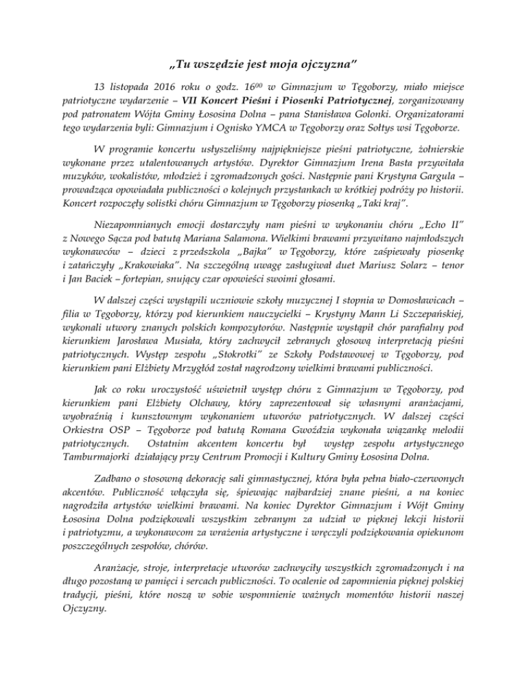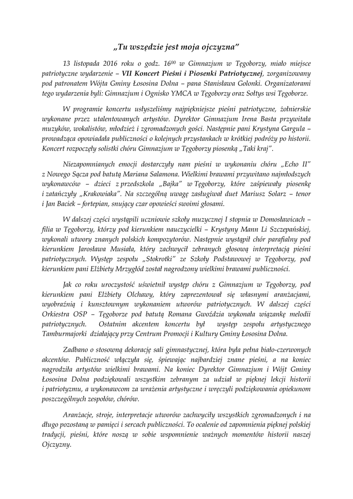„Tu wszędzie jest moja ojczyzna” 13 listopada 2016 roku o godz. 1600 w Gimnazjum w Tęgoborzy, miało miejsce patriotyczne wydarzenie – VII Koncert Pieśni i Piosenki Patriotycznej, zorganizowany pod patronatem Wójta Gminy Łososina Dolna – pana Stanisława Golonki. Organizatorami tego wydarzenia byli: Gimnazjum i Ognisko YMCA w Tęgoborzy oraz Sołtys wsi Tęgoborze. W programie koncertu usłyszeliśmy najpiękniejsze pieśni patriotyczne, żołnierskie wykonane przez utalentowanych artystów. Dyrektor Gimnazjum Irena Basta przywitała muzyków, wokalistów, młodzież i zgromadzonych gości. Następnie pani Krystyna Gargula – prowadząca opowiadała publiczności o kolejnych przystankach w krótkiej podróży po historii. Koncert rozpoczęły solistki chóru Gimnazjum w Tęgoborzy piosenką „Taki kraj”. Niezapomnianych emocji dostarczyły nam pieśni w wykonaniu chóru „Echo II” z Nowego Sącza pod batutą Mariana Salamona. Wielkimi brawami przywitano najmłodszych wykonawców – dzieci z przedszkola „Bajka” w Tęgoborzy, które zaśpiewały piosenkę i zatańczyły „Krakowiaka”. Na szczególną uwagę zasługiwał duet Mariusz Solarz – tenor i Jan Baciek – fortepian, snujący czar opowieści swoimi głosami. W dalszej części wystąpili uczniowie szkoły muzycznej I stopnia w Domosławicach – filia w Tęgoborzy, którzy pod kierunkiem nauczycielki – Krystyny Mann Li Szczepańskiej, wykonali utwory znanych polskich kompozytorów. Następnie wystąpił chór parafialny pod kierunkiem Jarosława Musiała, który zachwycił zebranych głosową interpretacją pieśni patriotycznych. Występ zespołu „Stokrotki” ze Szkoły Podstawowej w Tęgoborzy, pod kierunkiem pani Elżbiety Mrzygłód został nagrodzony wielkimi brawami publiczności. Jak co roku uroczystość uświetnił występ chóru z Gimnazjum w Tęgoborzy, pod kierunkiem pani Elżbiety Olchawy, który zaprezentował się własnymi aranżacjami, wyobraźnią i kunsztownym wykonaniem utworów patriotycznych. W dalszej części Orkiestra OSP – Tęgoborze pod batutą Romana Gwoździa wykonała wiązankę melodii patriotycznych. Ostatnim akcentem koncertu był występ zespołu artystycznego Tamburmajorki działający przy Centrum Promocji i Kultury Gminy Łososina Dolna. Zadbano o stosowną dekorację sali gimnastycznej, która była pełna biało-czerwonych akcentów. Publiczność włączyła się, śpiewając najbardziej znane pieśni, a na koniec nagrodziła artystów wielkimi brawami. Na koniec Dyrektor Gimnazjum i Wójt Gminy Łososina Dolna podziękowali wszystkim zebranym za udział w pięknej lekcji historii i patriotyzmu, a wykonawcom za wrażenia artystyczne i wręczyli podziękowania opiekunom poszczególnych zespołów, chórów. Aranżacje, stroje, interpretacje utworów zachwyciły wszystkich zgromadzonych i na długo pozostaną w pamięci i sercach publiczności. To ocalenie od zapomnienia pięknej polskiej tradycji, pieśni, które noszą w sobie wspomnienie ważnych momentów historii naszej Ojczyzny.