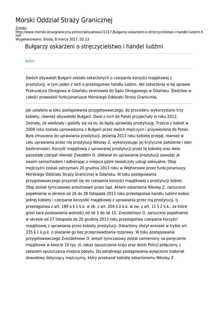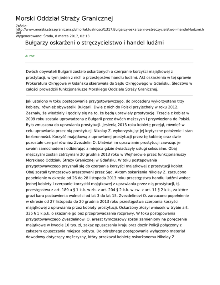 Morski Oddział Straży Granicznej Źródło: http://www.morski.strazgraniczna.pl/mor/aktualnosci/1317,Bulgarzy-oskarzeni-o-streczycielstwo-i-handel-ludzmi.h tml Wygenerowano: Środa, 8 marca 2017, 02:13 Bułgarzy oskarżeni o stręczycielstwo i handel ludźmi Autor: Dwóch obywateli Bułgarii zostało oskarżonych o czerpanie korzyści majątkowej z prostytucji, w tym jeden z nich o przestępstwo handlu ludźmi. Akt oskarżenia w tej sprawie Prokuratura Okręgowa w Gdańsku skierowała do Sądu Okręgowego w Gdańsku. Śledztwo w całości prowadzili funkcjonariusze Morskiego Oddziału Straży Granicznej. Jak ustalono w toku postępowania przygotowawczego, do procederu wykorzystano trzy kobiety, również obywatelki Bułgarii. Dwie z nich do Polski przyjechały w roku 2012. Zeznały, że wiedziały i godziły się na to, że będą uprawiały prostytucję. Trzecia z kobiet w 2009 roku została uprowadzona z Bułgarii przez dwóch mężczyzn i przywieziona do Polski. Była zmuszona do uprawiania prostytucji. Jesienią 2013 roku kobietę przejął, również w celu uprawiania przez nią prostytucji Nikolay Z. wykorzystując jej krytyczne położenie i stan bezbronności. Korzyść majątkową z uprawianej prostytucji przez tę kobietę oraz dwie pozostałe czerpał również Zvezdelin O. Ułatwiał im uprawianie prostytucji zawożąc je swoim samochodem i odbierając z miejsca gdzie świadczyły usługi seksualne. Obaj mężczyźni zostali zatrzymani 20 grudnia 2013 roku w Wejherowie przez funkcjonariuszy Morskiego Oddziału Straży Granicznej w Gdańsku. W toku postępowania przygotowawczego przyznali się do czerpania korzyści majątkowej z prostytucji kobiet. Obaj zostali tymczasowo aresztowani przez Sąd. Aktem oskarżenia Nikolay Z. zarzucono popełnienie w okresie od 26 do 28 listopada 2013 roku przestępstwa handlu ludźmi wobec jednej kobiety i czerpanie korzystki majątkowej z uprawiania przez nią prostytucji, tj. przestępstwa z art. 189 a § 1 k.k. w zb. z art. 204 § 2 k.k. w zw. z art. 11 § 2 k.k., za które grozi kara pozbawienia wolności od lat 3 do lat 15. Zvezdelinovi O. zarzucono popełnienie w okresie od 27 listopada do 20 grudnia 2013 roku przestępstwa czerpania korzyści majątkowej z uprawiania przez kobiety prostytucji. Oskarżony złożył wniosek w trybie art. 335 § 1 k.p.k. o skazanie go bez przeprowadzania rozprawy. W toku postępowania przygotowawczego Zvezdelinowi O. areszt tymczasowy został zamieniony na poręczenie majątkowe w kwocie 10 tys. zł, zakaz opuszczania kraju oraz dozór Policji połączony z zakazem opuszczania miejsca pobytu. Do odrębnego postępowania wyłączono materiał dowodowy dotyczący mężczyzny, który przekazał kobietę oskarżonemu Nikolay Z.