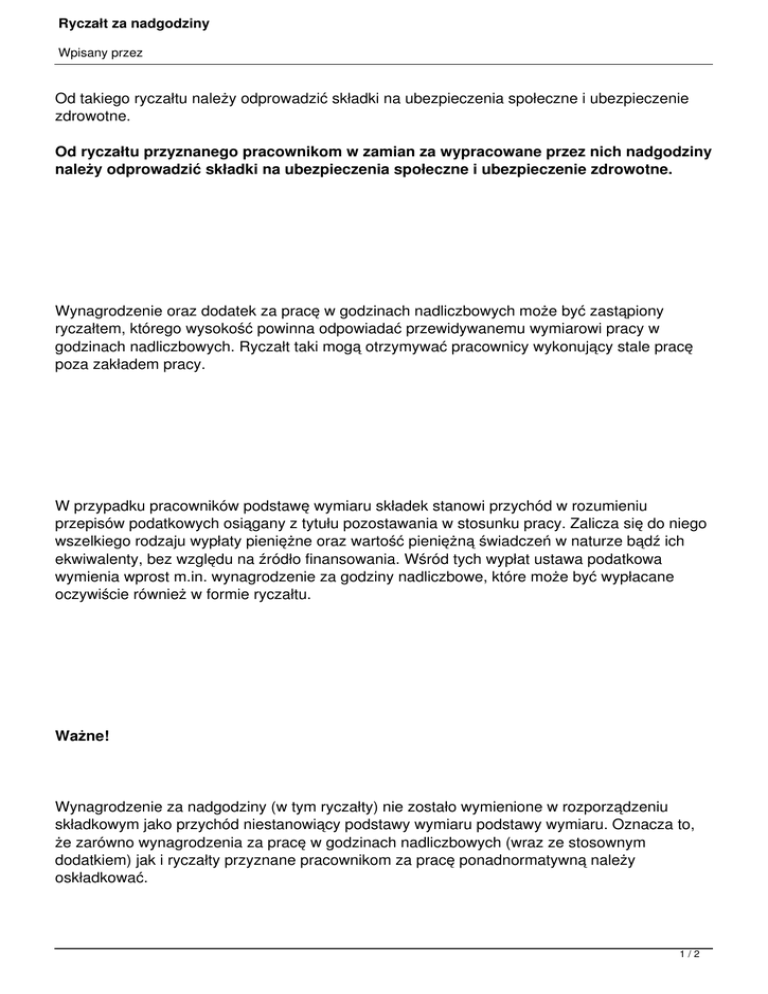 Ryczałt za nadgodziny Wpisany przez Od takiego ryczałtu należy odprowadzić składki na ubezpieczenia społeczne i ubezpieczenie zdrowotne. Od ryczałtu przyznanego pracownikom w zamian za wypracowane przez nich nadgodziny należy odprowadzić składki na ubezpieczenia społeczne i ubezpieczenie zdrowotne. Wynagrodzenie oraz dodatek za pracę w godzinach nadliczbowych może być zastąpiony ryczałtem, którego wysokość powinna odpowiadać przewidywanemu wymiarowi pracy w godzinach nadliczbowych. Ryczałt taki mogą otrzymywać pracownicy wykonujący stale pracę poza zakładem pracy. W przypadku pracowników podstawę wymiaru składek stanowi przychód w rozumieniu przepisów podatkowych osiągany z tytułu pozostawania w stosunku pracy. Zalicza się do niego wszelkiego rodzaju wypłaty pieniężne oraz wartość pieniężną świadczeń w naturze bądź ich ekwiwalenty, bez względu na źródło finansowania. Wśród tych wypłat ustawa podatkowa wymienia wprost m.in. wynagrodzenie za godziny nadliczbowe, które może być wypłacane oczywiście również w formie ryczałtu. Ważne! Wynagrodzenie za nadgodziny (w tym ryczałty) nie zostało wymienione w rozporządzeniu składkowym jako przychód niestanowiący podstawy wymiaru podstawy wymiaru. Oznacza to, że zarówno wynagrodzenia za pracę w godzinach nadliczbowych (wraz ze stosownym dodatkiem) jak i ryczałty przyznane pracownikom za pracę ponadnormatywną należy oskładkować. 1/2 Ryczałt za nadgodziny Wpisany przez Podstawa prawna: - art. 18 ust. 1 w związku z art. 4 pkt 9 ustawy z 13 października 1998 r. o systemie ubezpieczeń społecznych (tekst jednolity: Dz.U. z 2007 r. nr 11, poz. 74 ze zm.), - art. 12 ustawy z 26 lipca 1991 r. o podatku dochodowym od osób fizycznych (tekst jednolity: Dz.U. z 2000 r. nr 14, poz. 176 ze zm.), - art. 151 1 § 4 Kodeksu pracy, - rozporządzenie Ministra Pracy i Polityki Socjalnej z 18 grudnia 1998 r. w sprawie szczegółowych zasad ustalania podstawy wymiaru składek na ubezpieczenia emerytalne i rentowe (Dz.U. nr 161, poz. 1106 ze zm.). Bogdan Majkowski specjalista w zakresie ubezpieczeń 2/2