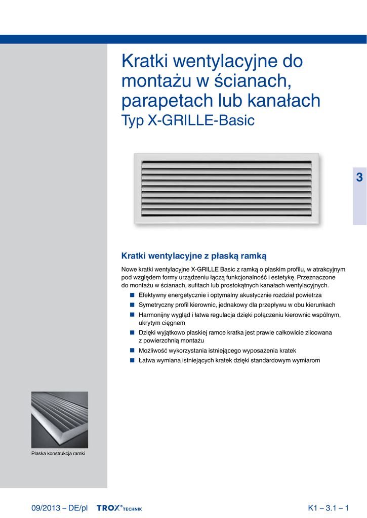 X-GRILLE-Basic 3.1 – X XX-GRILLE-Basic testregistrierung Kratki wentylacyjne do montażu w ścianach, parapetach lub kanałach Typ X-GRILLE-Basic 3 Kratki wentylacyjne z płaską ramką Nowe kratki wentylacyjne X-GRILLE Basic z ramką o płaskim profilu, w atrakcyjnym pod względem formy urządzeniu łączą funkcjonalność i estetykę. Przeznaczone do montażu w ścianach, sufitach lub prostokątnych kanałach wentylacyjnych. Efektywny energetycznie i optymalny akustycznie rozdział powietrza Symetryczny profil kierownic, jednakowy dla przepływu w obu kierunkach Harmonijny wygląd i łatwa regulacja dzięki połączeniu kierownic wspólnym, ukrytym cięgnem Dzięki wyjątkowo płaskiej ramce kratka jest prawie całkowicie zlicowana z powierzchnią montażu Możliwość wykorzystania istniejącego wyposażenia kratek Łatwa wymiana istniejących kratek dzięki standardowym wymiarom Płaska konstrukcja ramki 09/2013 – DE/pl K1 – 3.1 – 1 Kratki wentylacyjne do montażu w ścianach, parapetach lub kanałach Kod zamówieniowy Kod zamówieniowy X-GRILLE-Basic X-GRILLE-Basic X-GRILLE-Basic – AS / L × H / B1 / VS / P1 – RAL ... Typ X-GRILLE-Basic Elementy wyposażenia A Bez dodatkowych elementów (tylko kratka) AG Z wielopłaszczyznową przepustnicą regulacyjną AS Ze szczelinową przepustnicą regulacyjną D Z drugim rzędem prostopadłych, regulowanych indywidualnie kierownic DG Połączenie D z AG 3 Wymiary nominalne [mm] L×H Ramka montażowa Mocowanie VS, KF tylko z ramką montażową Bez oznaczeń: bez ramki B1 Z ramką montażową Mocowanie VS Ukryte mocowanie KF Mocowanie na sprężynki KB Bez wyposażenia VS, KF tylko z ramką montażową Wykonanie Bez oznaczeń: lakierowane proszkowo RAL 9010 P1 Lakierowane proszkowo na dowolny kolor zgodnie z paletą RAL Classic Stopnie połysku RAL 9010 50 % RAL 9006 30 % Pozostałe kolory z palety RAL 70 % K1 – 3.1 – 2 09/2013 – DE/pl Kratki wentylacyjne do montażu w ścianach, parapetach lub kanałach Tekst do specyfikacji Opis X-GRILLE-Basic Prostokątne kratki z ramką o płaskim profilu, przeznaczone do nawiewu i wywiewu, łączą funkcjonalność i estetykę w atrakcyjnej formie. Przeznaczone do montażu w ścianach, sufitach lub prostokątnych kanałach. Kratka składa się z zewnętrznej ramki, symetrycznych, pustych w środku lameli połączonych w niewidoczny sposób wspólnym cięgnem. Dane techniczne – Wielkości nominalne: pojedyncza kratka: 225 × 125 do 1225 × 525 mm – Strumień objętości powietrza przy poziomie mocy akustycznej do 40dB(A), bez elementów wyposażenia: nawiew 19 - 2660 l/s lub 68 - 9576 m³/h – Wolna powierzchnia kratki (kąt nawiewu 90°): ok. 65 % Cechy charakterystyczne – Symetryczny profil kierownic, jednakowy dla przepływu w obu kierunkach – Harmonijny wygląd i łatwa regulacja dzięki połączeniu kierownic wspólnym, ukrytym cięgnem – Dzięki wyjątkowo płaskiej ramce kratka jest prawie całkowicie zlicowana z powierzchnią montażu Parametry – _ ______________________________ [m³/h] – Δpt________________________________ [Pa] – LWA_____________________________ [dB(A)] 3 Materiały – Ramka z blachy stalowej ocynkowanej – Lamele z aluminium – Połączenia elementów oraz cięgna lameli z odpornego na wysokie temperatury tworzywa sztucznego, niepalne zgodnie z UL 94, V-0 – Ramka montażowa z blachy stalowej ocynkowanej – Powierzchnia lakierowana proszkowo na kolor biały (RAL 9010) lub dowolny kolor zgodnie z paletą RAL Kod zamówieniowy Typ X-GRILLE-Basic Elementy wyposażenia A Bez dodatkowych elementów (tylko kratka) AG Z wielopłaszczyznową przepustnicą regulacyjną AS Ze szczelinową przepustnicą regulacyjną D Z drugim rzędem prostopadłych, regulowanych indywidualnie kierownic DG Połączenie D z AG Wymiary nominalne [mm] L×H Ramka montażowa Mocowanie VS, KF tylko z ramką montażową Bez oznaczeń: bez ramki B1 Z ramką montażową Mocowanie VS Ukryte mocowanie KF Mocowanie na sprężynki KB Bez wyposażenia VS, KF tylko z ramką montażową Wykonanie Bez oznaczeń: lakierowane proszkowo RAL 9010 P1 Lakierowane proszkowo na dowolny kolor zgodnie z paletą RAL Classic Stopnie połysku RAL 9010 50 % RAL 9006 30 % Pozostałe kolory z palety RAL 70 % 09/2013 – DE/pl K1 – 3.1 – 3