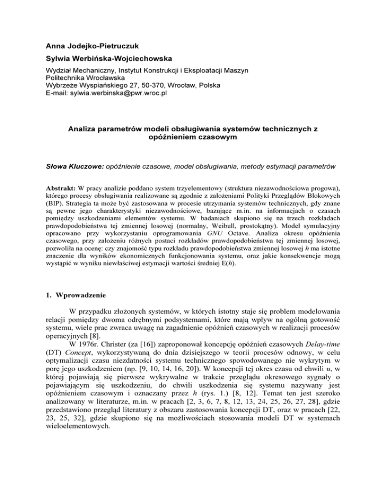 Anna Jodejko-Pietruczuk Sylwia Werbińska-Wojciechowska Wydział Mechaniczny, Instytut Konstrukcji i Eksploatacji Maszyn Politechnika Wrocławska Wybrzeże Wyspiańskiego 27, 50-370, Wrocław, Polska E-mail: [email protected] Analiza parametrów modeli obsługiwania systemów technicznych z opóźnieniem czasowym Słowa Kluczowe: opóźnienie czasowe, model obsługiwania, metody estymacji parametrów Abstrakt: W pracy analizie poddano system trzyelementowy (struktura niezawodnościowa progowa), którego procesy obsługiwania realizowane są zgodnie z założeniami Polityki Przeglądów Blokowych (BIP). Strategia ta może być zastosowana w procesie utrzymania systemów technicznych, gdy znane są pewne jego charakterystyki niezawodnościowe, bazujące m.in. na informacjach o czasach pomiędzy uszkodzeniami elementów systemu. W badaniach skupiono się na trzech rozkładach prawdopodobieństwa tej zmiennej losowej (normalny, Weibull, prostokątny). Model symulacyjny opracowano przy wykorzystaniu oprogramowania GNU Octave. Analiza okresu opóźnienia czasowego, przy założeniu różnych postaci rozkładów prawdopodobieństwa tej zmiennej losowej, pozwoliła na ocenę: czy znajomość typu rozkładu prawdopodobieństwa zmiennej losowej h ma istotne znaczenie dla wyników ekonomicznych funkcjonowania systemu, oraz jakie konsekwencje mogą wystąpić w wyniku niewłaściwej estymacji wartości średniej E(h). 1. Wprowadzenie W przypadku złożonych systemów, w których istotny staje się problem modelowania relacji pomiędzy dwoma odrębnymi podsystemami, które mają wpływ na ogólną gotowość systemu, wiele prac zwraca uwagę na zagadnienie opóźnień czasowych w realizacji procesów operacyjnych [8]. W 1976r. Christer (za [16]) zaproponował koncepcję opóźnień czasowych Delay-time (DT) Concept, wykorzystywaną do dnia dzisiejszego w teorii procesów odnowy, w celu optymalizacji czasu niezdatności systemu technicznego spowodowanego nie wykrytym w porę jego uszkodzeniem (np. [9, 10, 14, 16, 20]). W koncepcji tej okres czasu od chwili u, w której pojawiają się pierwsze wykrywalne w trakcie przeglądu okresowego sygnały o pojawiającym się uszkodzeniu, do chwili uszkodzenia się systemu nazywany jest opóźnieniem czasowym i oznaczany przez h (rys. 1.) [8, 12]. Temat ten jest szeroko analizowany w literaturze, m.in. w pracach [2, 3, 6, 7, 8, 12, 13, 24, 25, 26, 27, 28], gdzie przedstawiono przegląd literatury z obszaru zastosowania koncepcji DT, oraz w pracach [22, 23, 25, 32], gdzie skupiono się na możliwościach stosowania modeli DT w systemach wieloelementowych. Rys. 1. Koncepcja relacji czasowych [15] Poprawność doboru modelu obsługiwania systemu technicznego z opóźnieniem czasowym bezpośrednio zależy od dokładności oszacowania parametrów modelu. W związku z tym, jednym z podstawowych problemów poruszanych w literaturze jest zagadnienie estymacji parametrów opóźnienia czasowego. Obecnie nie istnieje metoda, która pozwoliłaby w bezpośredni sposób oszacować parametry zmiennej losowej opóźnienia czasowego h lub określić chwile pojawienia się pierwszych symptomów o uszkodzeniu u [12, 25]. W literaturze znane są dwie metody estymacji parametrów opóźnienia czasowego h oraz chwili u. W przypadku, gdy dane eksploatacyjne są dostępne oraz wiarygodne istnieje możliwość estymacji parametrów modelu z wykorzystaniem metody największej wiarogodności (np. [30]). W przeciwnym przypadku, stosowana jest metoda subiektywna estymacji parametrów bazująca na opinii ekspertów (np. [29]). Jedne z pierwszych prac, w których autorzy opracowali metodę z wykorzystaniem subiektywnych opinii ekspertów w obszarze estymacji wartości parametru h są [10, 14, 15, 16, 20]. Prace dotyczyły procesów obsługiwania systemów inżynierii budowlanej [10], systemów przemysłowych [16], produkcyjnych [15, 20], czy transportowych [14]. W kolejnej pracy [13] autorzy kontynuowali prace badawcze nad zagadnieniem estymacji parametrów opóźnienia czasowego. Autorzy przedstawili przegląd literatury w badanym obszarze oraz omówili modele korekty estymacji parametrów opóźnienia czasowego. Ponadto poruszyli problem oszacowania estymatorów obciążonych w badanym obszarze. Zagadnienie to kontynuowane było w pracy [12], gdzie m.in. kryteria doboru metody estymacji parametrów zostały przeanalizowane. Przegląd literatury z obszaru zastosowania prawdopodobieństwa subiektywnego oraz opinii ekspertów w procesie podejmowania decyzji eksploatacyjnych z wykorzystaniem koncepcji DT został przedstawiony w pracach [7, 29]. W kolejnych pracach autorzy przedstawili implementację metody subiektywnej estymacji parametrów opóźnienia czasowego w obszarze funkcjonowania systemu przemysłowego [19], przedsiębiorstwa produkcyjnego [1], oraz przedsiębiorstwa transportu miejskiego autobusowego [21]. Natomiast w pracy [5] autorzy po raz pierwszy zastosowali metodę obiektywną w procesie estymacji parametru opóźnienia czasowego dla obiektu naprawialnego. Parametry modelu zostały oszacowane z wykorzystaniem metody największej wiarygodności oraz Kryterium Informacyjne Akaike’go (AIC). Zaproponowany model został rozwinięty w pracy [4], gdzie autorzy m.in. rozpatrzyli system wieloelementowy składający się z wielu komponentów. W kolejnej pracy [17] autorzy rozpatrzyli system wieloelementowy, w którym operacje diagnozy stanu systemu wykonywane są planowo co okres czasu T oraz podczas uszkodzeń. Zagadnienie estymacji obiektywnej parametrów modelu dla systemu złożonego (complex system) przeanalizowano m.in. w pracy [18]. Zagadnienie estymacji modelu w przypadku, gdy jedynie dysponujemy danymi o chwilach uszkodzeń (brak informacji o procesie obsługiwania systemu) zostało przeanalizowane w pracy [11]. Z kolei w pracy [31] przedstawiono przykład optymalizacji okresu między obsługami w przedsiębiorstwie produkcyjnym. Na szczególną uwagę zasługuje również pra