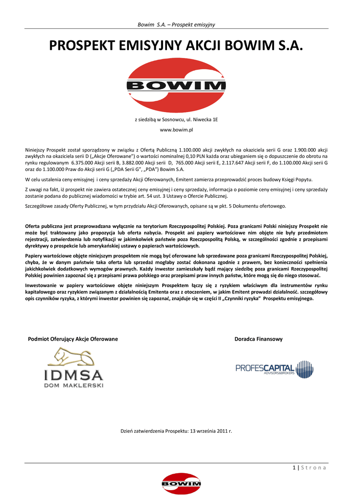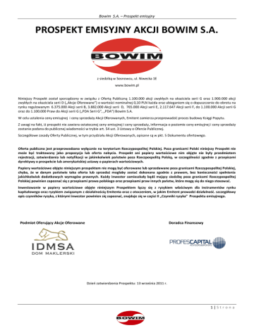 Bowim S.A. – Prospekt emisyjny PROSPEKT EMISYJNY AKCJI BOWIM S.A. z siedzibą w Sosnowcu, ul. Niwecka 1E www.bowim.pl Niniejszy Prospekt został sporządzony w związku z Ofertą Publiczną 1.100.000 akcji zwykłych na okaziciela serii G oraz 1.900.000 akcji zwykłych na okaziciela serii D („Akcje Oferowane”) o wartości nominalnej 0,10 PLN każda oraz ubieganiem się o dopuszczenie do obrotu na rynku regulowanym 6.375.000 Akcji serii B, 3.882.000 Akcji serii D, 765.000 Akcji serii E, 2.117.647 Akcji serii F, do 1.100.000 Akcji serii G oraz do 1.100.000 Praw do Akcji serii G („PDA Serii G”, „PDA”) Bowim S.A. W celu ustalenia ceny emisyjnej i ceny sprzedaży Akcji Oferowanych, Emitent zamierza przeprowadzid proces budowy Księgi Popytu. Z uwagi na fakt, iż prospekt nie zawiera ostatecznej ceny emisyjnej i ceny sprzedaży, informacja o poziomie ceny emisyjnej i ceny sprzedaży zostanie podana do publicznej wiadomości w trybie art. 54 ust. 3 Ustawy o Ofercie Publicznej. Szczegółowe zasady Oferty Publicznej, w tym przydziału Akcji Oferowanych, opisane są w pkt. 5 Dokumentu ofertowego. Oferta publiczna jest przeprowadzana wyłącznie na terytorium Rzeczypospolitej Polskiej. Poza granicami Polski niniejszy Prospekt nie może byd traktowany jako propozycja lub oferta nabycia. Prospekt ani papiery wartościowe nim objęte nie były przedmiotem rejestracji, zatwierdzenia lub notyfikacji w jakimkolwiek paostwie poza Rzeczpospolitą Polską, w szczególności zgodnie z przepisami dyrektywy o prospekcie lub amerykaoskiej ustawy o papierach wartościowych. Papiery wartościowe objęte niniejszym prospektem nie mogą byd oferowane lub sprzedawane poza granicami Rzeczypospolitej Polskiej, chyba, że w danym paostwie taka oferta lub sprzedaż mogłaby zostad dokonana zgodnie z prawem, bez konieczności spełnienia jakichkolwiek dodatkowych wymogów prawnych. Każdy inwestor zamieszkały bądź mający siedzibę poza granicami Rzeczypospolitej Polskiej powinien zapoznad się z przepisami prawa polskiego oraz przepisami praw innych paostw, które mogą się do niego stosowad. Inwestowanie w papiery wartościowe objęte niniejszym Prospektem łączy się z ryzykiem właściwym dla instrumentów rynku kapitałowego oraz ryzykiem związanym z działalnością Emitenta oraz z otoczeniem, w jakim Emitent prowadzi działalnośd. szczegółowy opis czynników ryzyka, z którymi inwestor powinien się zapoznad, znajduje się w części II „Czynniki ryzyka” Prospektu emisyjnego. Podmiot Oferujący Akcje Oferowane Doradca Finansowy Dzieo zatwierdzenia Prospektu: 13 września 2011 r. 1|Str on a Bowim S.A. – Prospekt emisyjny ZASTRZEŻENIA Prospekt został sporządzony w związku z Ofertą Publiczną Akcji Oferowanych na terenie Polski oraz ubieganiem się o dopuszczenie Akcji serii B, Akcji serii D, Akcji serii E, Akcji serii F, Akcji serii G oraz Praw do Akcji serii G Emitenta do obrotu na rynku regulowanym – rynku oficjalnych notowao prowadzonym przez Giełdę Papierów Wartościowych w Warszawie S.A. Prospekt został sporządzony zgodnie z przepisami Rozporządzenia Komisji (WE) nr 809/2004 oraz innymi przepisami regulującymi rynek kapitałowy w Polsce, w szczególności Ustawą o Ofercie Publicznej. Prospekt został sporządzony zgodnie z najlepszą wiedzą i przy dołożeniu należytej staranności. Jeśli po dniu zatwierdzenia Prospektu zajdą zmiany dotyczące sytuacji Emitenta, Prospekt będzie aktualizowany poprzez odpowiednie aneksy zgodnie z art. 51 Ustawy o Ofercie Publicznej do dnia pierwszego notowania Akcji lub Praw do Akcji Emitenta. Dlatego zwraca się uwagę inwestorom, że informacje zawarte w niniejszym dokumencie powinny byd traktowane jako aktualne na dzieo zatwierdzenia Prospektu, chyba że w treści Prospektu wskazano inaczej, a inwestorzy powinni zapoznad się również z treścią opublikowanych aneksów do Prospektu lub komunikatów aktualizacyjnych. Emitent, jak i Oferujący nie zamierza podejmowad żadnych działao dotyczących stabilizacji kursu papierów wartościowych objętych Prospektem przed, w trakcie oraz po przeprowadzeniu Oferty Publicznej. Termin ważności Prospektu wynosi 12 miesięcy od dnia jego udostępnienia do publicznej wiadomości. DOKUMENTY UDOSTĘPNIONE DO WGLĄDU Prospekt wraz z danymi aktualizującymi jego treśd będzie udostępniany w formie elektronicznej na stronie internetowej Emitenta (www.bowim.pl) oraz Oferującego (www.idmsa.pl). Prospekt w formie drukowanej dostępny będzie: w siedzibie Emitenta – ul. Niwecka 1E, 41-200 Sosnowiec, w siedzibie Oferującego – Mały Rynek 7, 31-041 Kraków. W okresie ważności dokumentu rejestracyjnego w siedzibie Emitenta udostępnione będą do wglądu: statut, KRS, regulaminy organów Emitenta, skonsolidowane sprawozdania finansowe Emitenta za lata 2008-2010, wraz z opiniami biegłego rewidenta, sprawozdania finansowe Emitenta i jego jednostek zależnych za lata 2008-2010. 2|Str on a Bowim S.A. – Prospekt emisyjny Spis treści I. PODSUMOWANIE ................................................................................................................................................................................... 7 1 Podstawowe obszary i rodzaj działalności .................................................................................................................................... 7 2 Struktura asortymentowa przychodów ze sprzedaży.................................................................................................................... 8 3 Podsumowanie danych finansowych i operacyjnych .................................................................................................................... 8 4 Strategia rozwoju......................................................................................................................................................................... 9 5 Cele emisyjne......................................................