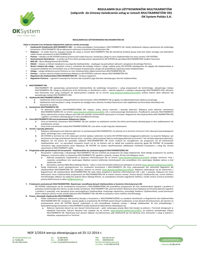 Umowa o świadczenie usług REGULAMIN DLA UŻYTKOWNIKÓW MULTIKARNETÓW OK System Polska (załącznik do Umowy świadczenia usług w ramach MULTIKARNETÓW OK) OK System Polska S.A. REGULAMIN DLA UŻYTKOWNIKÓW MULTIKARNETÓW OK Użyte w Umowie oraz niniejszym Regulaminie wybrane zwroty oznaczają: Użytkownik (Użytkownik MULTIKARNETU OK) – to osoba posiadająca i korzystająca z MULTIKARNETU OK. Każdy Użytkownik nabywa uprawnienia do osobistego korzystania z MULTIKARNETU OK po dokonaniu rejestracji w Systemie Informatycznym OK. Nabywca – to osoba fizyczna, kupująca dostęp do usług w ramach MULTIKARNETU OK) dla określonej liczebnie grupy osób (lub siebie samego), jest płatnikiem całości kwoty zamówienia za MULTIKARNET(Y). Partner – odrębny od OK SYSTEM podmiot prawny (lub osoba fizyczna), świadczący usługi na rzecz Użytkowników (na mocy umowy z OK SYSTEM). Autoryzowany Dystrybutor – to osoba lub firma, która posiada ważne upoważnienie OK SYSTEM do sprzedaży MULTIKARNETÓW osobom fizycznym. BOK OK – Biuro Obsługi Klienta OK SYSTEM. Obiekt – miejsce, w którym świadczone są usługi dla Użytkowników - znajdujące się pod jednym adresem i przypisane do jednego Partnera. Numer miejsca lub usługi – specjalne numery, unikatowe dla każdego miejsca i usługi, nadane przez OK SYSTEM udostępnione do wglądu dla Użytkowników w recepcjach obiektów (na Terminalach oraz w informacjach drukowanych), służące do prawidłowej rejestracji wejść Użytkowników. Usługa – usługa świadczona przez Partnera na rzecz Użytkowników objęta konkretnym MULTIKARNETEM OK. Umowa – umowa zawarta między konkretnym Nabywcą a OK SYSTEM w zakresie zakupu MULTIKARNETÓW OK. Regulamin dla Użytkowników MULTIKARNETÓW OK – niniejszy regulamin. Regulamin Partnera – regulamin wewnętrzny Partnera dla wszystkich jego klientów obowiązujący również Użytkowników. 1. MULTIKARNETY OK: MULTIKARNETY OK upoważniają uprawnionych Użytkowników do osobistego korzystania z usług przypisanych do konkretnego, zakupionego rodzaju MULTIKARNETU OK. Usługi są świadczone przez Partnerów, w określonym czasie i zakresie (zgodnie z rodzajem zakupionego MULTIKARNETU OK). Aktualna lista Partnerów oraz usług możliwych do wykorzystania znajduje się na stronie www.oksystem.pl/klienci/sum2015 (należy wybrać dane właściwe dla posiadanego rodzaju MULTIKARNETU OK). 2. Użytkownik MULTIKARNETU(ÓW) OK: 1. Użytkownik, który nie jest osobą pełnoletnią może korzystać z MULTIKARNETU OK za zgodą i na odpowiedzialność opiekuna prawnego. 2. Użytkownik może korzystać z usług stosownie do swojego stanu zdrowia, kondycji fizycznej (w razie wątpliwości po konsultacji lekarskiej) oraz stosownie do wieku. 3. Zamówienie MULTIKARNETU OK: 1. Po dokonaniu wyboru MULTIKARNETU(ÓW) OK: rodzaju, liczby, okresu ważności i sposobu płatności, Nabywca może dokonać zamówienia MULTIKARNETU(ÓW) OK na stronie www.oksystem.pl/klienci/sum2015; lub u autoryzowanego Dystrybutora. Przedłużenie ważności MULTIKARNETU OK po zakończeniu umowy odbywa się w taki sam sposób, na warunkach (opisanych w Umowie i Regulaminie dla Użytkowników MULTIKARNETÓW OK) i zgodnie z cennikiem obowiązującym w dniu przedłużenia Umowy. 4. Cena MULTIKARNETU OK oraz przyznawane Nabywcom rabaty: 1. Cena za konkretny zamawiany MULTIKARNET OK jest ustalana na podstawie cennika lub oferty promocyjnej obowiązującej w dniu podpisywania lub przedłużania umowy. 2. Cenę może warunkować rodzaj MULTIKARNETU(ÓW) OK, oraz okres na jaki mają być aktywowane. 5. Termin i sposoby płatności: 1. Nabywca zobowiązany jest dokonać płatności za zamówiony(e) MULTIKARNET(Y), nie później niż w terminie minimum 5 dni roboczych poprzedzających dzień, od którego chce z nich korzystać. 2. OK SYSTEM w terminie do 3 dni roboczych od dnia wpływu należności na konto OK SYSTEM dokona księgowania płatności; na życzenie Nabywcy i po otrzymaniu od niego potrzebnych danych (imię , nazwisko i adres) wystawi fakturę rozliczającą płatność (w terminie 7 dni od daty wpłynięcia płatności). 3. Nabywca nie ma prawa do sprzedaży nabytych MULTIKARNETÓW OK innym osobom (w szczególności: po przypisaniu ich do konkretnych Użytkowników oraz na warunkach cenowych innych niż te, na których sam je nabył) bez uzyskania pisemnej zgody OK SYSTEM. W przypadku naruszenia tego postanowienia przez Nabywcę, OK SYSTEM ma prawo natychmiastowo zablokować możliwość korzystania z usług bez zwrotu uiszczonych za MULTIKARNETY opłat. 6. Przypisanie osób uprawnionych do korzystania – Użytkowników do zamówionego(ych) MULTIKARNET(ÓW) OK: 1. Korzystanie z opłaconego i zakupionego MULTIKARNETU OK jest możliwe po przypisaniu do niego Użytkownika. Brak takiego przypisania nie zwalnia Nabywcy z uiszczenia opłat za zamówione MULTIKARNETY OK, zgodnie z zawartą umową. W tym celu Nabywca może: a. Dokonać przypisania Użytkownika w Systemie Informatycznym OK na stronie www.oksystem.pl/klienci/sum2015 podając minimum: imię i nazwisko; prawidłowe (nie zawierające błędów) numery telefonów komórkowych oraz prawidłowe (nie zawierające błędów) adresy e-mail wybranych osób. b. Skorzystać z pomocy BOK (Biura Obsługi Klienta – adres e-mail oraz kontakt telefoniczny dostępny na stronie www.oksystem.pl/klienci/sum2015. 2. Każdy Użytkownik przed udostępnieniem mu możliwości korzystania z MULTIKARNETU OK musi zaakceptować bez zastrzeżeń Regulamin dla Użytkowników MULTIKANETÓW OK (dostępny również na stronie www.oksystem.pl/klienci/sum2015). Nabywca zobowiązuje się do zapoznania z Regulaminem dla Użytkowników MULTIKARNETÓW OK osób, które przypisał w Systemie Informatycznym OK, z pkt. 1 powyżej. Nabywca nie może dokonywać zmian Użytkowników przypisanych do MULTIKARNETÓW OK w trakcie trwania umowy. Zmiana danych Użytkownika (np. numer telefonu komórkowego) odbywa się wy