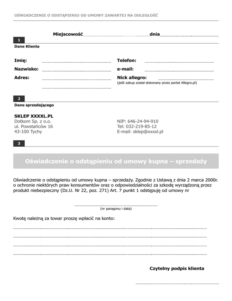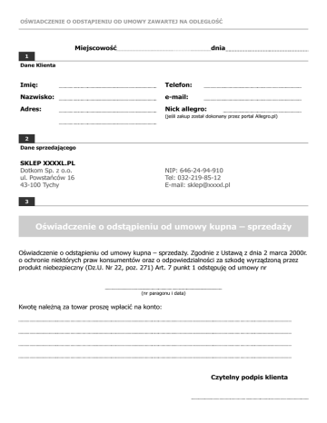 OŚWIADCZENIE O ODSTĄPIENIU OD UMOWY ZAWARTEJ NA ODLEGŁOŚĆ Miejscowość dnia 1 Dane Klienta Imię: Telefon: Nazwisko: e-mail: Adres: Nick allegro: (jeśli zakup został dokonany przez portal Allegro.pl) 2 Dane sprzedającego SKLEP XXXXL.PL Dotkom Sp. z o.o. ul. Powstańców 16 43-100 Tychy NIP: 646-24-94-910 Tel: 032-219-85-12 E-mail: [email protected] 3 Oświadczenie o odstąpieniu od umowy kupna – sprzedaży Oświadczenie o odstąpieniu od umowy kupna – sprzedaży. Zgodnie z Ustawą z dnia 2 marca 2000r. o ochronie niektórych praw konsumentów oraz o odpowiedzialności za szkodę wyrządzoną przez produkt niebezpieczny (Dz.U. Nr 22, poz. 271) Art. 7 punkt 1 odstępuję od umowy nr (nr paragonu i data) Kwotę należną za towar proszę wpłacić na konto: Czytelny podpis klienta OŚWIADCZENIE O ODSTĄPIENIU OD UMOWY ZAWARTEJ NA ODLEGŁOŚĆ 4 Oświadczam, że zgodnie z regulaminem dokonywania zwrotów, korzystam: (właściwe proszę zaznaczyć) z prawa zwrotu towaru – zwrotu gotówki z wymiany towaru 5 Lp. Nazwa towaru Ilość Data dostawy Cena 1 2 3 4 5 Razem: REGULAMIN SKLEPU INTERNETOWEGO XXXXL.PL W SPRAWIE DOKONYWANIA ZWROTÓW 1. Zgodnie z Ustawą z dnia 2 marca 2000r. o ochronie niektórych praw konsumentów od umowy można odstąpić bez podania przyczyn, składając stosowne oświadczenie na piśmie w terminie dziesięciu dni (Art.7 punkt 1). 2. Termin dziesięciodniowy, w którym konsument może odstąpić od umowy, liczy się od dnia wydania rzeczy. (Art.10 punkt 1). 3. Zwrot towaru powinien nastąpić niezwłocznie, nie później niż w terminie czternastu dni. (Art.7 punkt 3). 4. Zwracany towar musi być niezniszczony, kompletny i nie może nosić śladów użycia. Musi zostać dostarczony w niezniszczonym opakowaniu wraz z kompletem załączonych akcesoriów / metek. 5. Z towarem należy zwrócić dowód zakupu i kartę gwarancyjną (jeśli została wystawiona). 6. Klient musi dostarczyć zwracany towar na swój koszt na adres firmy: DOTKOM SP. Z O. O., UL. POWSTAŃCÓW 16, 43-100 TYCHY 7. Klient przed wysyłką towaru musi powiadomić pracownika firmy o fakcie nadawania przesyłki. Brak powiadomienia może oznaczać nie odebranie przesyłki. 8. Zgłaszając fakt zwrotu, klient musi umieścić w widoczny sposób napis ZWROT na przesyłce. Nie umieszczenie napisu może oznaczać nie odebranie przesyłki. 9. Zwrot kwoty należnej za zakupiony produkt następuje po sprawdzeniu stanu towaru, opakowania oraz kompletu dostarczonych dokumentów i akcesoriów. 10. Klientowi nie przysługuje zwrot kosztów pakowania i dostawy poniesionych przy zakupie towaru i wyszczególnionych na dokumencie zakupu. 11. W przypadku, gdy towar zakupiony został na fakturę VAT, do klienta zostanie wysłana korekta faktury VAT, a zwrot środków nastąpi po otrzymaniu podpisanego dokumentu. 12. W przypadku, gdy towar nie będzie spełniał warunków wymienionych w punktach 1-11, zostanie odesłany do klienta na jego koszt, a klient straci prawo do odstąpienia od umowy kupna – sprzedaży. Podpisując ten dokument oświadczam, że zapoznałam (-em) się z postanowieniami powyższego Regulaminu dokonywania zwrotów. OŚWIADCZENIE O ODSTĄPIENIU OD UMOWY ZAWARTEJ NA ODLEGŁOŚĆ Miejscowość dnia 1 Dane Klienta Imię: Telefon: Nazwisko: e-mail: Adres: Nick allegro: (jeśli zakup został dokonany przez portal Allegro.pl) 2 Dane sprzedającego SKLEP XXXXL.PL Dotkom Sp. z o.o. ul. Powstańców 16 43-100 Tychy NIP: 646-24-94-910 Tel: 032-219-85-12 E-mail: [email protected] 3 Oświadczenie o odstąpieniu od umowy kupna – sprzedaży Oświadczenie o odstąpieniu od umowy kupna – sprzedaży. Zgodnie z Ustawą z dnia 2 marca 2000r. o ochronie niektórych praw konsumentów oraz o odpowiedzialności za szkodę wyrządzoną przez produkt niebezpieczny (Dz.U. Nr 22, poz. 271) Art. 7 punkt 1 odstępuję od umowy nr (nr paragonu i data) Kwotę należną za towar proszę wpłacić na konto: Czytelny podpis klienta OŚWIADCZENIE O ODSTĄPIENIU OD UMOWY ZAWARTEJ NA ODLEGŁOŚĆ 4 Oświadczam, że zgodnie z regulaminem dokonywania zwrotów, korzystam: (właściwe proszę zaznaczyć) z prawa zwrotu towaru – zwrotu gotówki z wymiany towaru 5 Lp. Nazwa towaru Ilość Data dostawy Cena 1 2 3 4 5 Razem: REGULAMIN SKLEPU INTERNETOWEGO XXXXL.PL W SPRAWIE DOKONYWANIA ZWROTÓW 1. Zgodnie z Ustawą z dnia 2 marca 2000r. o ochronie niektórych praw konsumentów od umowy można odstąpić bez podania przyczyn, składając stosowne oświadczenie na piśmie w terminie dziesięciu dni (Art.7 punkt 1). 2. Termin dziesięciodniowy, w którym konsument może odstąpić od umowy, liczy się od dnia wydania rzeczy. (Art.10 punkt 1). 3. Zwrot towaru powinien nastąpić niezwłocznie, nie później niż w terminie czternastu dni. (Art.7 punkt 3). 4. Zwracany towar musi być niezniszczony, kompletny i nie może nosić śladów użycia. Musi zostać dostarczony w niezniszczonym opakowaniu wraz z kompletem załączonych akcesoriów / metek. 5. Z towarem należy zwrócić dowód zakupu i kartę gwarancyjną (jeśli została wystawiona). 6. Klient musi dostarczyć zwracany towar na swój koszt na adres firmy: DOTKOM SP. Z O. O., UL. POWSTAŃCÓW 16, 43-100 TYCHY 7. Klient przed wysyłką towaru musi powiadomić pracownika firmy o fakcie nadawania przesyłki. Brak powiadomienia może oznaczać nie odebranie przesyłki. 8. Zgłaszając fakt zwrotu, klient musi umieścić w widoczny sposób napis ZWROT na przesyłce. Nie umieszczenie napisu może oznaczać nie odebranie przesyłki. 9. Zwrot kwoty należnej za zakupiony produkt następuje po sprawdzeniu stanu towaru, opakowania oraz kompletu dostarczonych dokumentów i akcesoriów. 10. Klientowi nie przysługuje zwrot kosztów pakowania i dostawy poniesionych przy zakupie towaru i wyszczególnionych na dokumencie zakupu. 11. W przypadku, gdy towar zakupiony został na fakturę VAT, do klienta zostanie wysłana korekta faktury VAT, a zwrot środków nastąpi po otrzymaniu podpisane