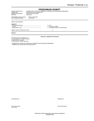 Klimapol - Projekt Sp. z o.o. PRZEDMIAR ROBÓT NAZWA INWESTYCJI INWESTOR ADRES INWESTORA BRANśA : : : : "PRZEBUDOWA ZPMW ZG SOBIESKI W ZAKRESIE DOSTOSOWANIA ZBIORNIKA Południowy Koncern Węglowy S.A Zakład Górniczy Sobieski maszynowa SPORZĄDZIŁ KALKULACJE : DATA OPRACOWANIA : Mariusz Zamiatała 30.12.2010 Stawka roboczogodziny : NARZUTY Koszty pośrednie [Kp] ........................................................... Zysk [Z] .................................................................................. koszty zakupu [kz] ................................................................ Ogółem wartość kosztorysowa robót : % R, S % R+Kp(R), S+Kp(S) % Σ(R+Kp(R)+Z(R), M, S+Kp(S)+Z(S)) zł Słownie: Klauzula o uzgodnieniu kosztorysu Południowy Koncern Węglowy S.A., ul. Grunwaldzka 37, 43-600 Jaworzno Zakład Górniczy Sobieski, ul. Sulińskiego 2, 43-600 Jaworzno "PRZEBUDOWA ZPMW ZG SOBIESKI W ZAKRESIE DOSTOSOWANIA ZBIORNIKA KAMIENIA DO ZAŁADUNKU NA SAMOCHODY" WYKONAWCA : INWESTOR : Data opracowania 30.12.2010 Data zatwierdzenia Dokument został opracowany przy pomocy programu NORMA PRO zg sobieski zbiornik odpadow V=950m3.KST Lp. Podstawa Opis jm Nakłady "PRZEBUDOWA ZPMW ZG SOBIESKI W ZAKRESIE DOSTOSOWANIA ZBIORNIKA KAMIENIA DO ZAŁADUNKU NA SAMOCHODY" 1 "PRZEBUDOWA ZPMW ZG SOBIESKI W ZAKRESIE DOSTOSOWANIA ZBIORNIKA KAMIENIA DO ZAŁADUNKU NA SAMOCHODY" 1 DOSTAWA kg d.1 wycena indywi- ZSUWNIA ZAŁADOWCZA - CZĘŚĆ UCHYLNA obmiar = 1960.0kg dualna 1* 2 KNR 13-02 d.1 0114-01 -- M -bale iglaste obrzynane 0.004m3/t drewno na stemple budowlane okrągłe iglaste 0.002m3/t deski iglaste obrzynane 19-45 mm 0.006m3/t blachy stalowe walcowane na gorąco StO i StOS grub. 4.75 - 40 mm 2kg/t śruby sześciokątne z łbem i nakrętkami zgrubne 0.28kg/t podkłady normalnotorowe 0.19szt/t elektrody stalowe śr. 4 mm 0.001100 szt./t acetylen techniczny rozpuszczony 0.4kg/t tlen techniczny gat. I-III 99.5-98 % 1.2m3/t farba olejna do gruntowania miniowa 60 % 0.6dm3/t smar stały do łoŜysk ŁT-4 0.07kg/t kształtowniki walcowane-ceowniki StO i StOS 100-300 E 0.94kg/t 2* 3* 4* 5* 6* 7* 8* 9* 10* 11* 12* 13* 15* 16* 17* 18* 19* 3 d.1 -- S -Ŝuraw samojezdny gąsienicowy 12-15 t 0.8m-g/t Ŝuraw samojezdny gąsienicowy 20-25 t 0.8m-g/t ciągnik kołowy 90-110 KM 0.8m-g/t przyczepa skrzyniowa 10 t 0.8m-g/t spawarka elektryczna wirująca 500 A 11m-g/t wciągarka mechaniczna z napędem elektrycznym 1.63.2 t 11m-g/t Razem koszty bezpośrednie: Razem z narzutami: Ceny jednostkowe ZSUWNIA ZAŁADOWCZA - CZĘŚĆ WYSUWANA wycena indywi- 429-M.03 obmiar = 1568.00kg dualna 1* 4 KNR 13-02 d.1 0114-01 1* kg r-g 160.9748 m3 0.0078 m3 0.0039 m3 0.0118 kg 3.9200 kg 0.5488 szt 0.3724 100 szt. kg 0.0020 m3 2.3520 dm3 1.1760 kg 0.1372 kg 1.8424 m-g 1.5680 m-g 1.5680 m-g 1.5680 m-g 1.5680 m-g 21.5600 m-g 21.5600 -- M -ZSUWNIA ZAŁADOWCZA - CZĘŚĆ WYSUWANA 429-M.03 1kg/kg Razem koszty bezpośrednie: Razem z narzutami: Ceny jednostkowe Zsuwnie dla kamienia. obmiar = 1.568t -- R -robocizna 86*0.955=82.13r-g/t -2- 0.7840 kg kg 1568.0000 t r-g -- M -- Norma PRO Wersja 4.01, Marzec 2003 r. 1960.0000 t -- R -robocizna 86*0.955=82.13r-g/t 1* 14* -- M -DOSTAWA ZSUWNIA ZAŁADOWCZA - CZĘŚĆ UCHYLNA 1kg/kg Razem koszty bezpośrednie: Razem z narzutami: Ceny jednostkowe Zsuwnie dla kamienia. obmiar = 1.960t 128.7798 Koszt jedn. R M S zg sobieski zbiornik odpadow V=950m3.KST Lp. 2* 3* 4* 5* 6* 7* 8* 9* 10* 11* 12* 13* 14* 15* 16* 17* 18* 19* 5 d.1 Podstawa Opis jm bale iglaste obrzynane 0.004m3/t drewno na stemple budowlane okrągłe iglaste 0.002m3/t deski iglaste obrzynane 19-45 mm 0.006m3/t blachy stalowe walcowane na gorąco StO i StOS grub. 4.75 - 40 mm 2kg/t śruby sześciokątne z łbem i nakrętkami zgrubne 0.28kg/t podkłady normalnotorowe 0.19szt/t elektrody stalowe śr. 4 mm 0.001100 szt./t acetylen techniczny rozpuszczony 0.4kg/t tlen techniczny gat. I-III 99.5-98 % 1.2m3/t farba olejna do gruntowania miniowa 60 % 0.6dm3/t smar stały do łoŜysk ŁT-4 0.07kg/t kształtowniki walcowane-ceowniki StO i StOS 100-300 E 0.94kg/t m3 0.0063 m3 0.0031 m3 0.0094 kg 3.1360 kg 0.4390 szt 0.2979 100 szt. kg 0.0016 m3 1.8816 dm3 0.9408 kg 0.1098 kg 1.4739 m-g 1.2544 m-g 1.2544 m-g 1.2544 m-g 1.2544 m-g 17.2480 m-g 17.2480 -- S -Ŝuraw samojezdny gąsienicowy 12-15 t 0.8m-g/t Ŝuraw samojezdny gąsienicowy 20-25 t 0.8m-g/t ciągnik kołowy 90-110 KM 0.8m-g/t przyczepa skrzyniowa 10 t 0.8m-g/t spawarka elektryczna wirująca 500 A 11m-g/t wciągarka mechaniczna z napędem elektrycznym 1.63.2 t 11m-g/t Razem koszty bezpośrednie: Razem z narzutami: Ceny jednostkowe SIŁOWNIK TELESKOPOWY DWUSTRONNEGO wycena indywi- DZIAŁANIA TYP CTD-115/2/2300 PRONAR NAREWZE SWORZNIAMI O50 (OBCIĄśENIE ROBOCZE 1T) dualna 429-M.01 obmiar = 1szt -- M -SIŁOWNIK TELESKOPOWY DWUSTRONNEGO DZIAŁANIA TYP CTD-115/2/2300 PRONAR NAREWZE SWORZNIAMI O50 (OBCIĄśENIE ROBOCZE 1T) 429-M.01 1szt/szt Razem koszty bezpośrednie: Razem z narzutami: Ceny jednostkowe 6 KNR 7-08 0302- Układy sterowania pneumatycznego zaworem regulad.1 01 cyjnym z siłownikiem pneumatycznym / SIŁOWNIK TELESKOPOWY DWUSTRONNEGO DZIAŁANIA TYP CTD-115/2/2300 obmiar = 1ukl. 2* 3* 4* 5* szt r-g 25.8200 kg 3.2400 % 5.0000 m-g 0.2000 m-g 0.2600 -- M -konstrukcja wsporcza o masie do 5 kg 3.24kg/ukl. materiały pomocnicze 5% -3- Norma PRO Wersja 4.01, Marzec 2003 r. 1.0000 ukl. -- R -robocizna 25.82r-g/ukl. -- S -spawarka elektryczna wirująca 300 A 0.2m-g/ukl. samochód dostawczy 0.9 t 0.26m-g/ukl. Razem koszty bezpośrednie: Razem z narzutami: Ceny jednostkowe 0.6272 szt 1* 1* Nakłady Koszt jedn. R M S zg sobieski zbiornik odpadow V=950m3.KST Lp. 7 d.1 Podstawa Opis jm Nakłady ZESPÓŁ POMP WYSOKOCIŚNIENIOWYCH ZE ukl. ZBIORNIKIEM OLEJOWYM I FILTREM 1. - zasilacz hydrauliczny UHWP1000/2x71-2x37-10R7 w tym : - 2 zespoły pomopwe [ główny i zapasowy ] - 2 x pompa tłoczkowa 71 cm3 / obr - 2 x silnik elektryczny 37 kW, 1500 obr/min; 3 x 500 V 50 Hz - zespoły pompowe zabudowane na 
